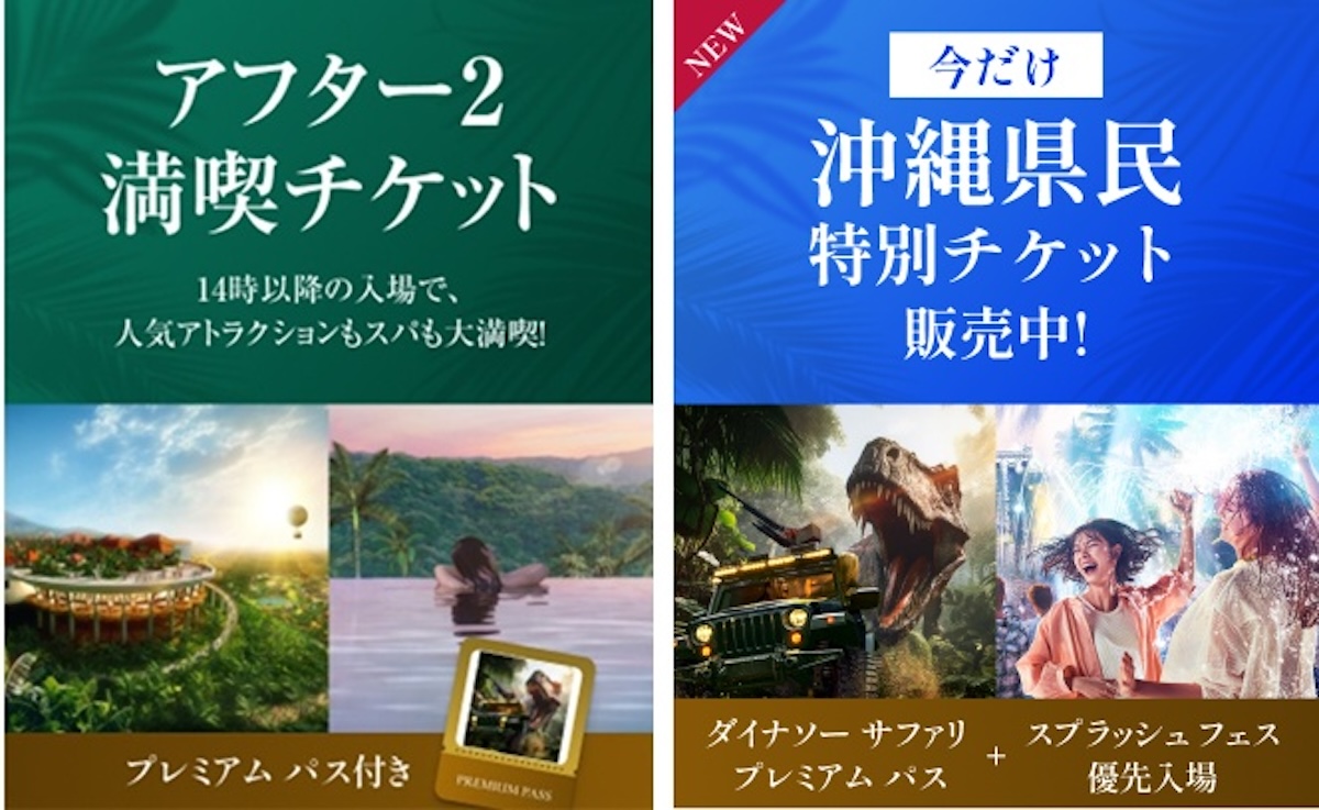 こちらはパーク入場チケット、スパチケットに加え、「ダイナソーサファリ」か「トレジャーファイト」のいずれかを購入時に選択できるチケット。19時からは「ジャングリア花火」や「ジャングリアナイト フェス」が開催される日もあるため、アトラクション、スパ、食事、花火やフェスなどのショーをバランスよく楽しめることが魅力。日中はリゾートホテルや海でのんびりして、午後から「ジャングリア沖縄」に繰り出すのは強い日差しを避けられるというメリットも。