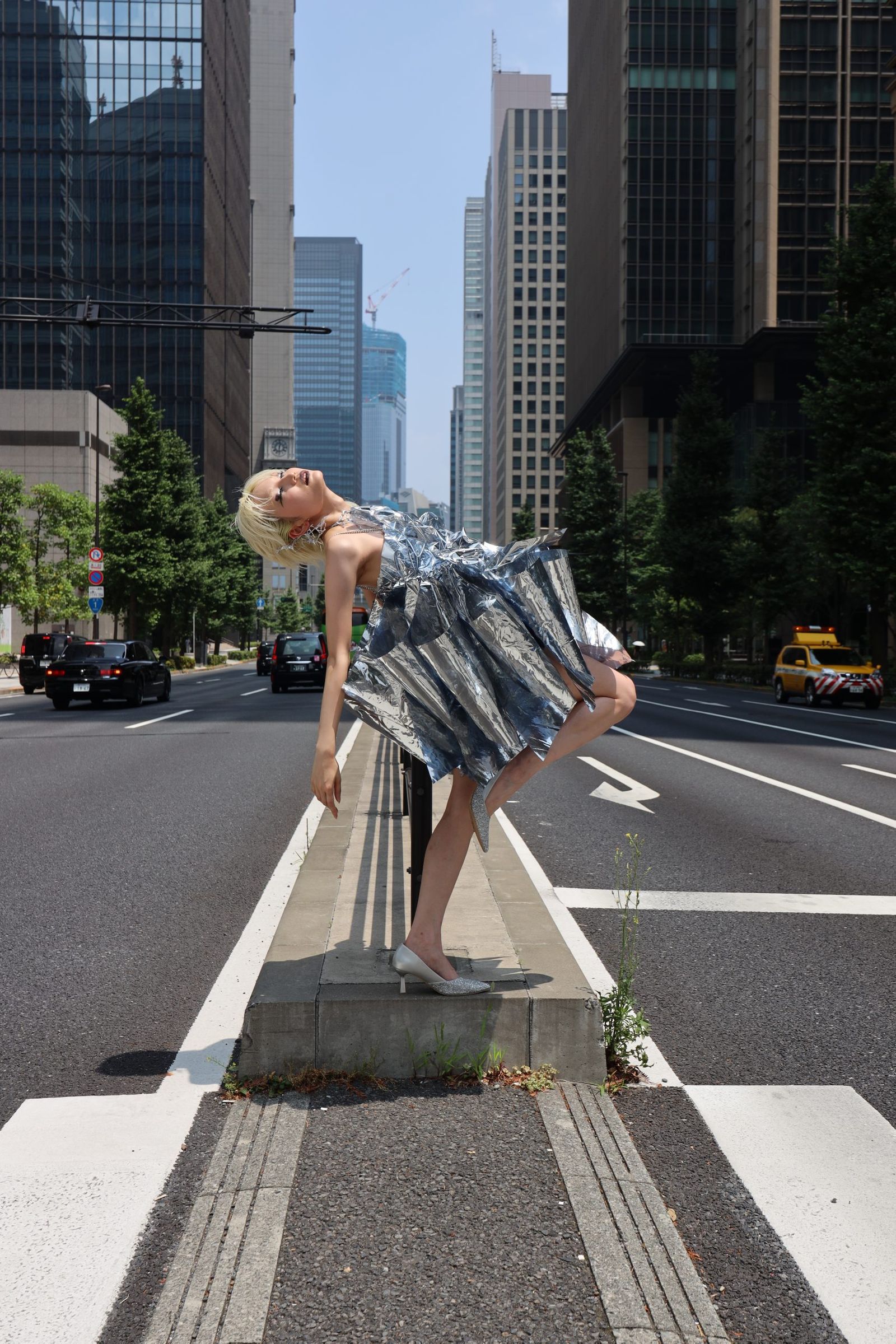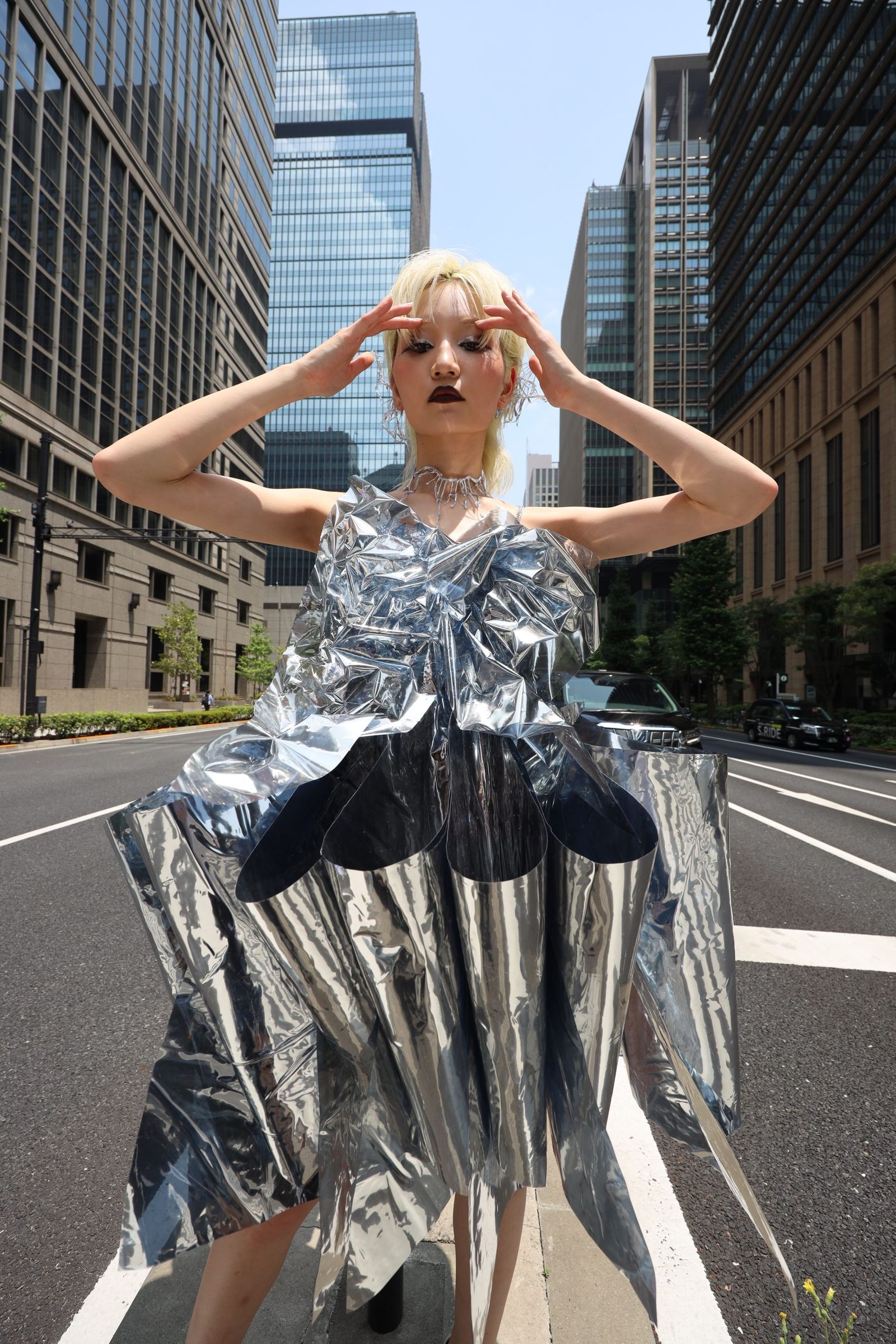 寺西:私たちは“鏡”を使うことで、花嫁像をひとつに固定しないことを選びました。反射によって、見る人の姿や光の移ろいがドレスに溶け込んでいきます。シルエットは一見して理解できない複雑さにこだわり、わかりやすさよりも想像させる余白を大切にしました。花嫁を一方向から定義せず、見る人の感性によって常に変化する存在として提示したいーーそれは私自身が抱く「女性であることの多面性」にも重なっています。