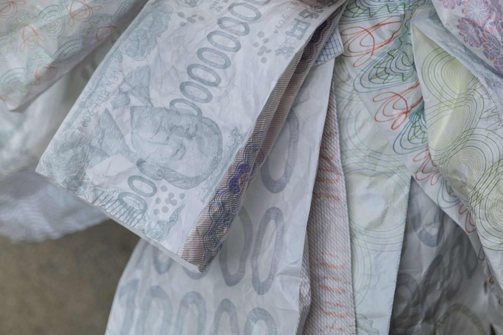 プリントした紙幣模様も、紙幣の美しい部分をコラージュする要領で構成しました。