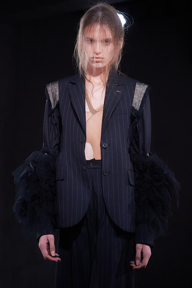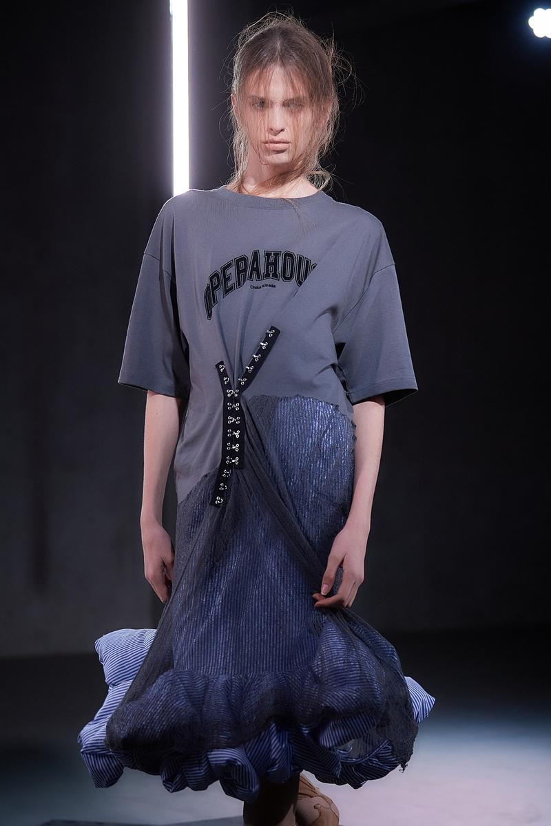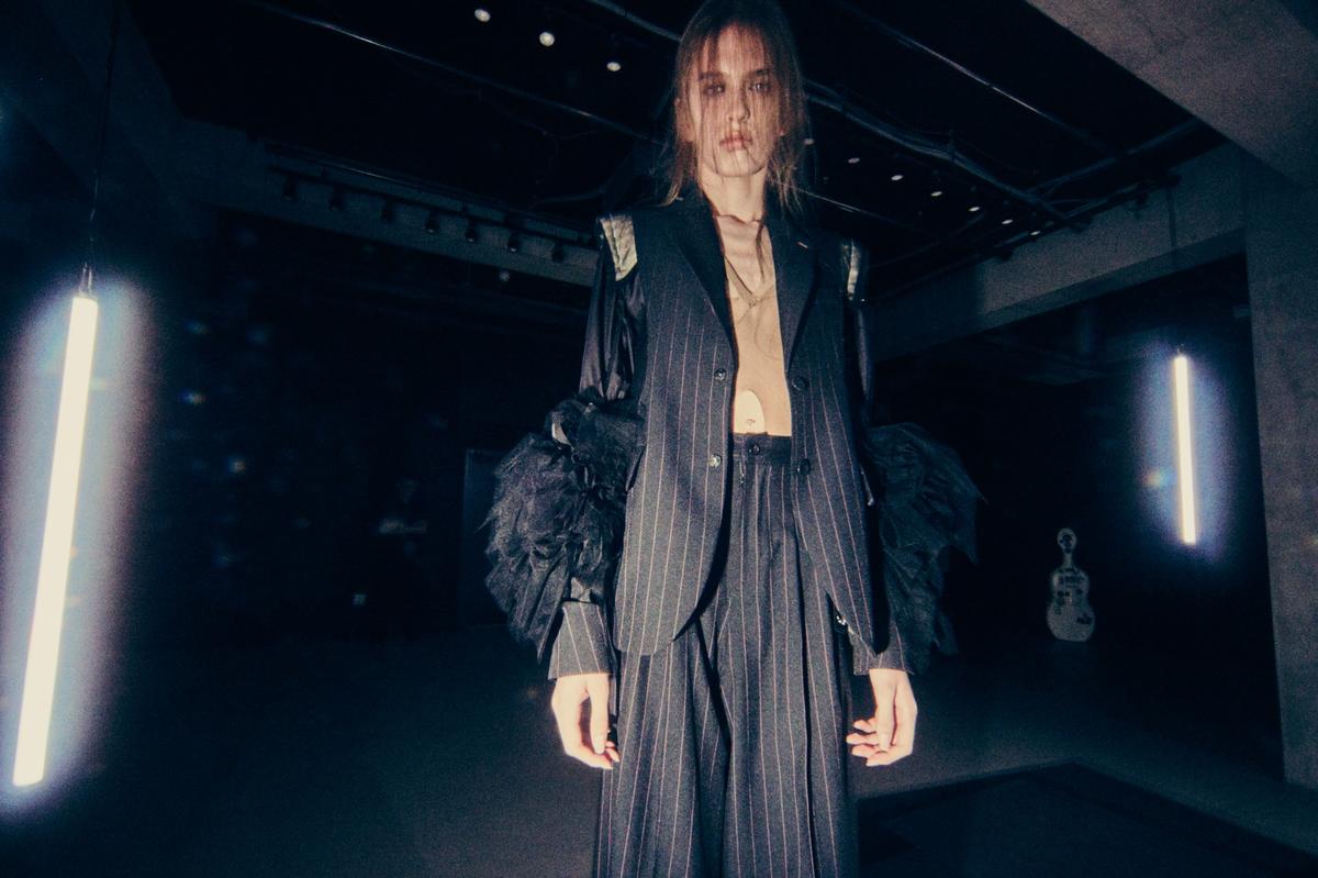 アイテムは今季も、ブランドの代名詞であるチュールやチュチュが多面的に展開された。そのアイデアの豊さはまるで「バレエの因数分解」。チュールは、肩パッドをむき出しにした脱構築的なジャケットの袖口やフラットシューズを飾ったり、ストラップやブラトップにアクセサリー感覚で用いたり。ポロシャツ地やシャツ地といったカジュアルな日常着の要素は、タイトなトップとボリュームあるミニ丈スカートのプロポーションバランスによりバレエ衣装にも見えてくる。そしてブランドのもうひとつのコアであるパンクの要素も忘れない。スタッズ使いや切り裂いたようなカットソーが甘いチュールの世界を彩る。