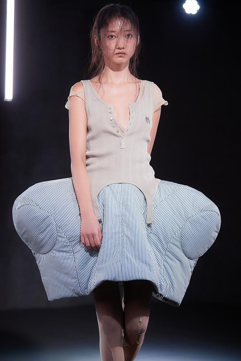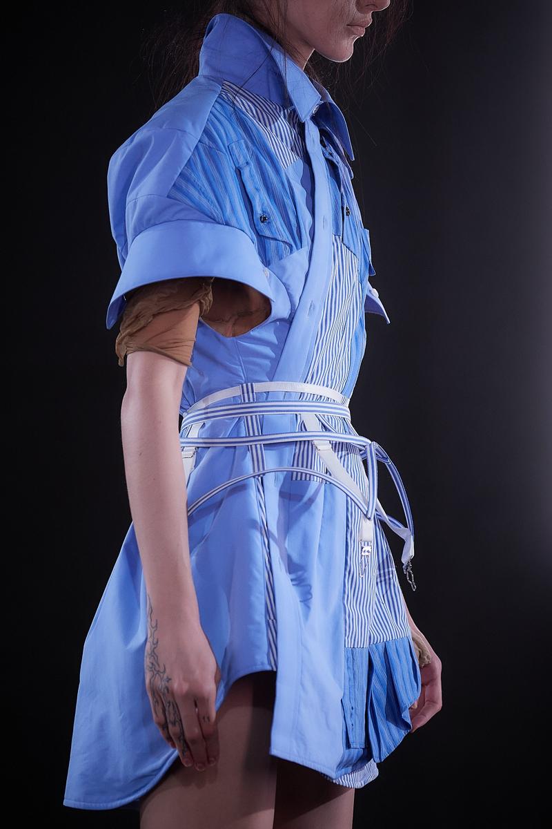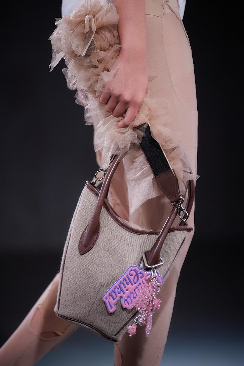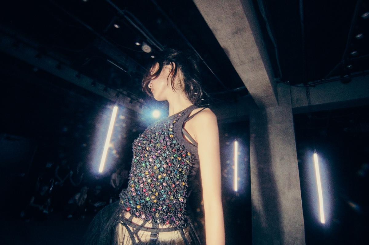 アイテムは今季も、ブランドの代名詞であるチュールやチュチュが多面的に展開された。そのアイデアの豊さはまるで「バレエの因数分解」。チュールは、肩パッドをむき出しにした脱構築的なジャケットの袖口やフラットシューズを飾ったり、ストラップやブラトップにアクセサリー感覚で用いたり。ポロシャツ地やシャツ地といったカジュアルな日常着の要素は、タイトなトップとボリュームあるミニ丈スカートのプロポーションバランスによりバレエ衣装にも見えてくる。そしてブランドのもうひとつのコアであるパンクの要素も忘れない。スタッズ使いや切り裂いたようなカットソーが甘いチュールの世界を彩る。