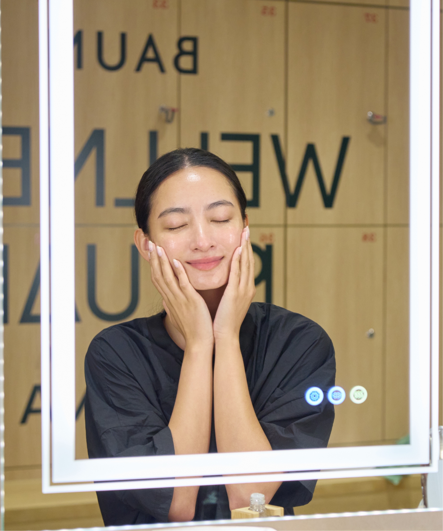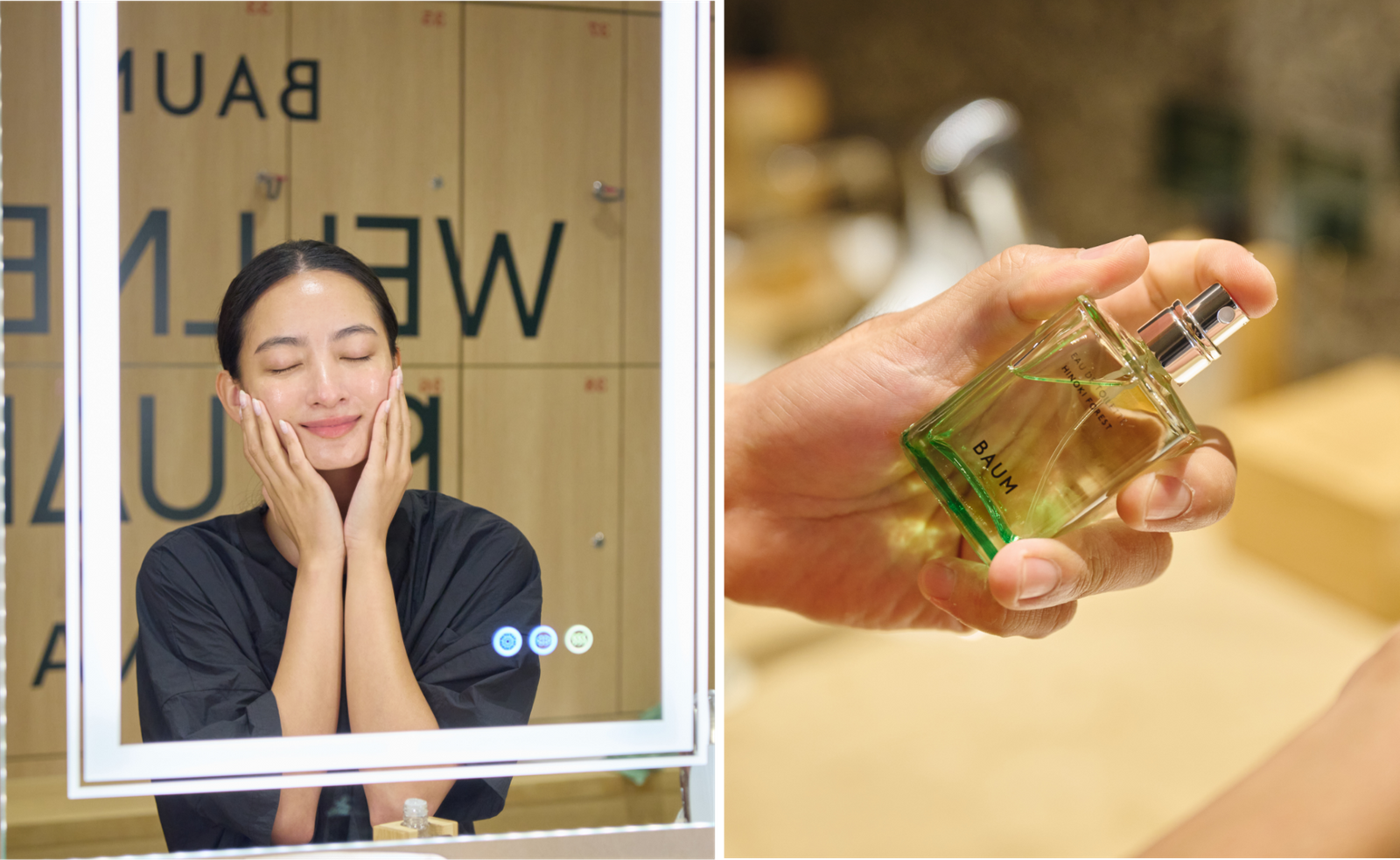 「『バウム ウェルネスリチュアル サウナ』−樹は記憶している」と題した同イベントは、昨年好評を博したコラボレーションの第2弾。フロアは男性が3階で女性が2階で、期間中、美しい自然の循環を感じさせる各フロアのエントランスでは「バウム」のスキンケアや樹木がゲストを迎えた。訪れた瞬間、まるで森の中にいるような樹木の香りが五感を優しく刺激する。ゲストは、ロッカールームから浴室〜サウナ室に至るまで、AI音声ガイドに導かれながら「13のリチュアル」を体験する構成だ。