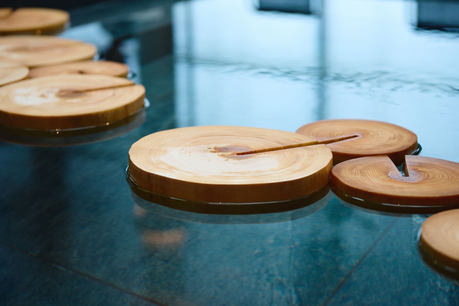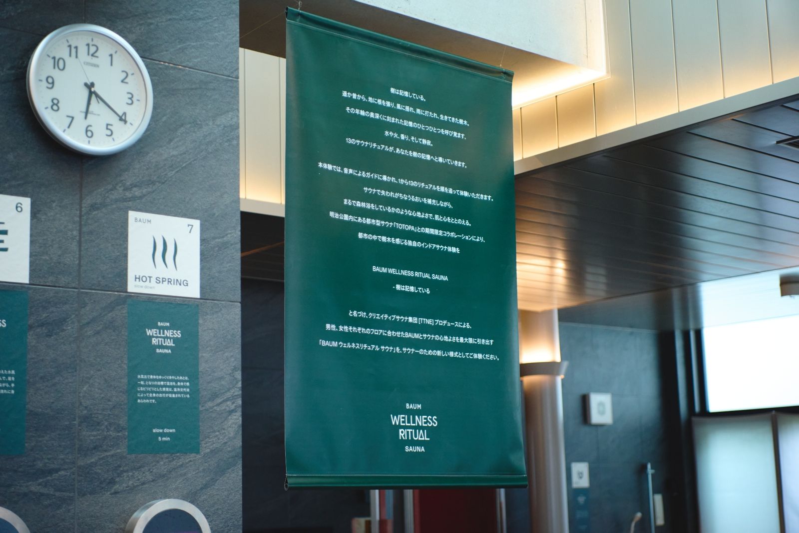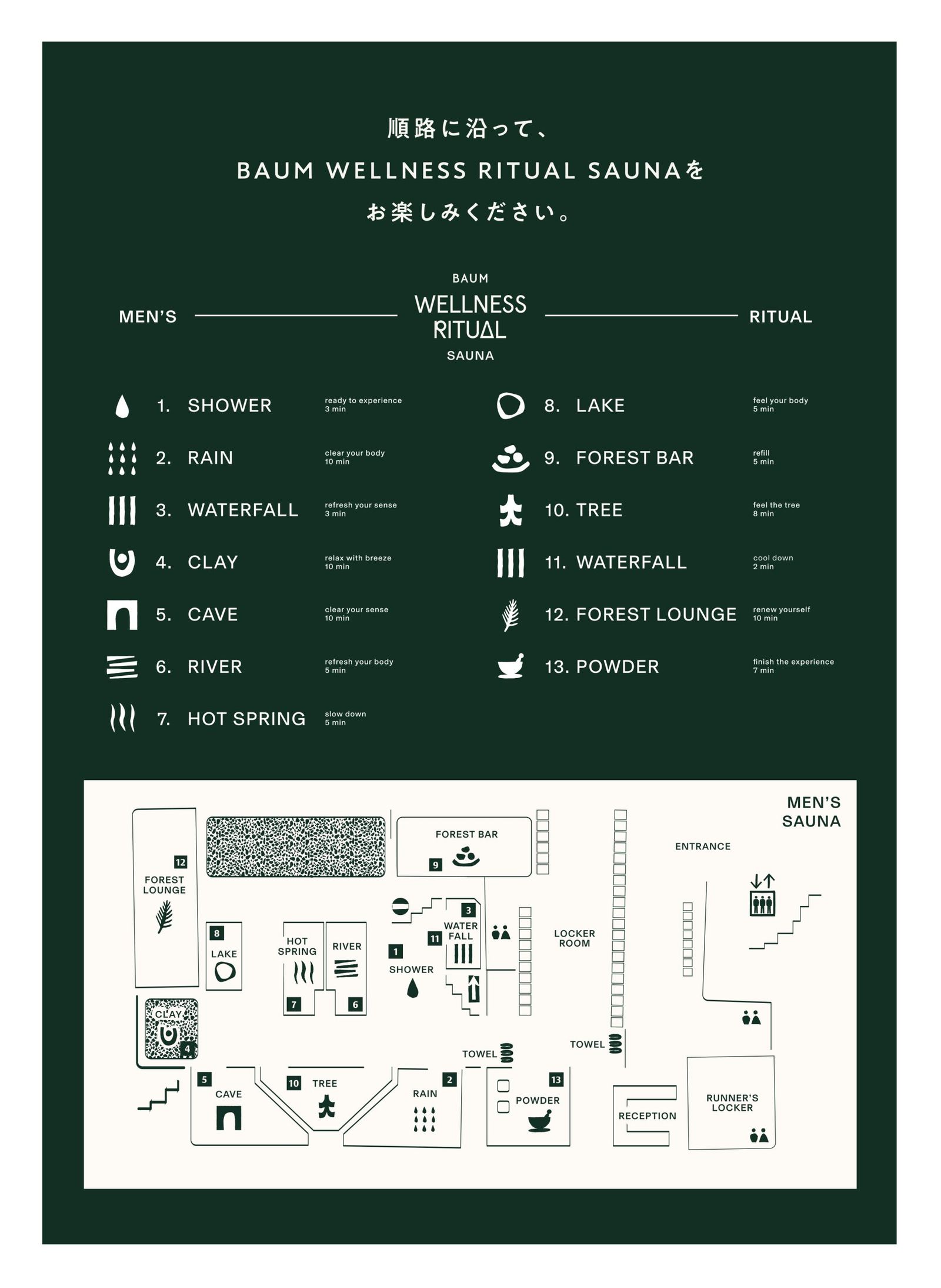 「バウム」が提案する樹木との共生というメッセージを、サウナを舞台に“ウェルネスリチュアル サウナ”として体現した今イベント。来場者が世界観にすっと入り込みやすくなる仕掛けとして、AI音声ガイドを導入したと秋山は語る。「リチュアルを“儀式”として捉え、設計した『13のリチュアル』をAI音声ガイドが導いてくれます。多くの人はサウナ、水風呂、休憩を“セット”として繰り返すと思いますが、それだけでは新たな体験価値の提供にはつながらない。ヒントとなったのは、東京都現代美術館で開催された故・坂本龍一氏の展覧会『音を視る 時を聴く』でした。映像と音で心を揺さぶる展示を目の当たりにして、サウナでも視覚や音、香りで五感を刺激する体験型プログラムを実現できるんじゃないかって。『13のリチュアル』に対して、解説文のパネルを設置したのはインスタレーション感覚でサウナを楽しんでほしかったから。没入体験ならサウナ初心者でも無理なくいつのまにか“ととのう”ことができる。と同時に、自分自身に意識を向けやすくなり、火や水、土、木、自然のエレメントというキーワードもすっと掴み取ってもらうことが狙いでした」。