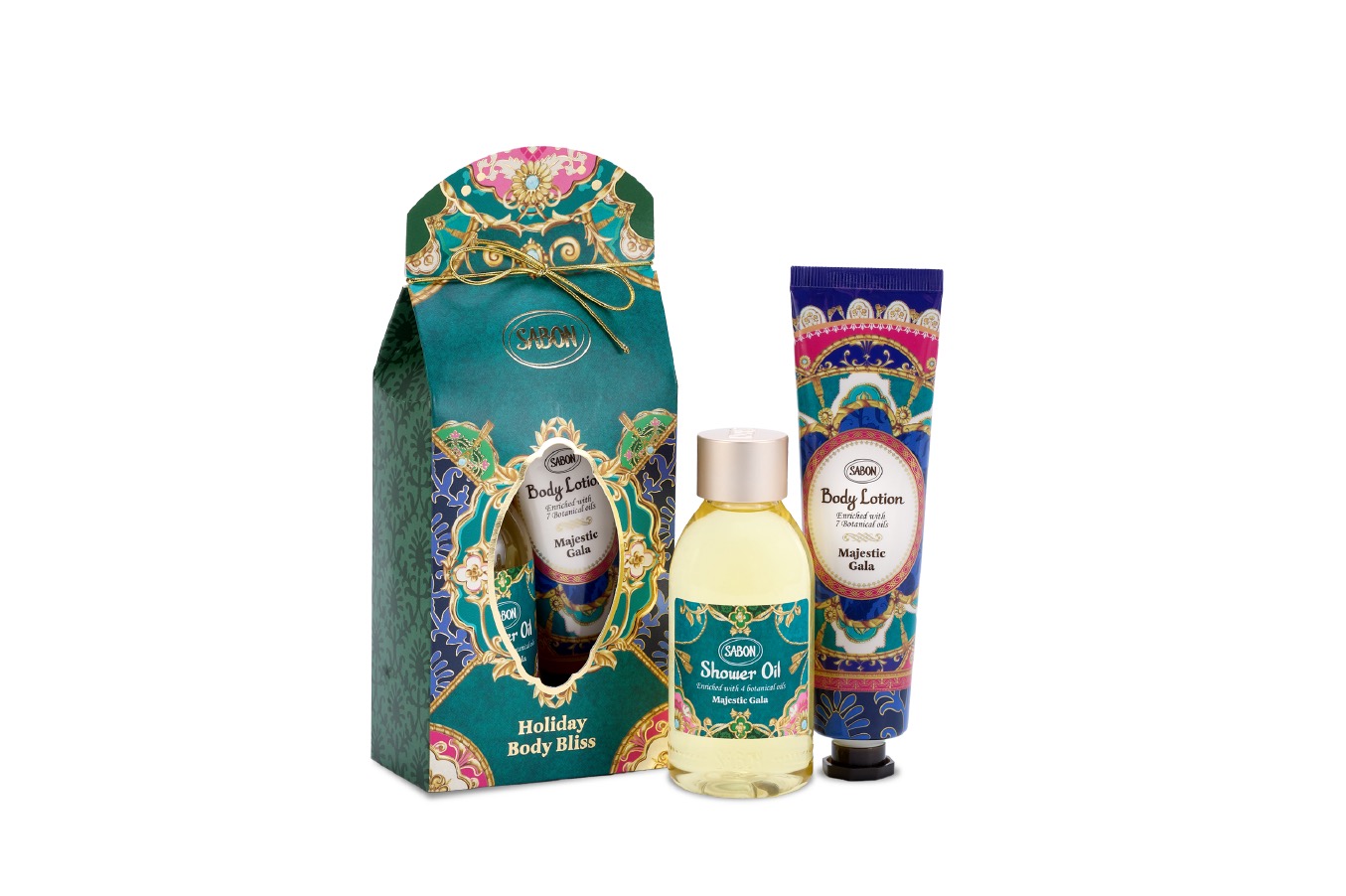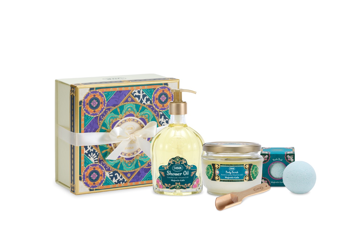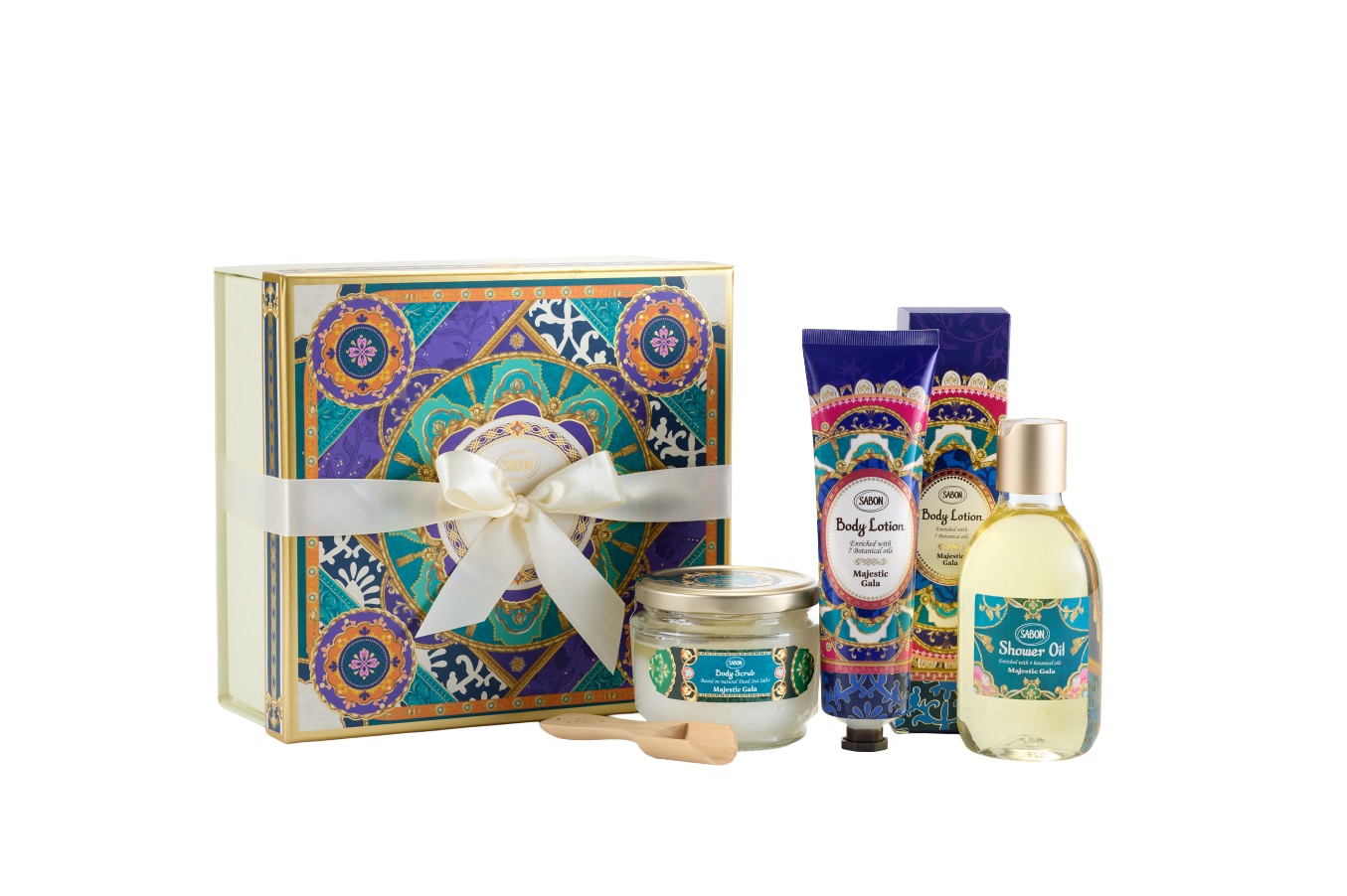 「サボン」公式オンラインストア、LINEギフト、アットコスメ(@COSME)限定発売では、シャワーオイル(300mL)とスクラブ(320g)、ローション(150mL)が入った“ボディーケアキット マジェスティック・ガラ”(1万2100円)を用意。「サボン」直営店限定品は、シャワーオイル(450mL)、スクラブ(320g)、バスボールが入った“ボディーケアキット マジェスティック・ガラ”(1万1000円)と、ボディーケアアイテムをファブリックポーチにセットした“ロイヤルギフト マジェスティック・ガラ”(4950円)だ。