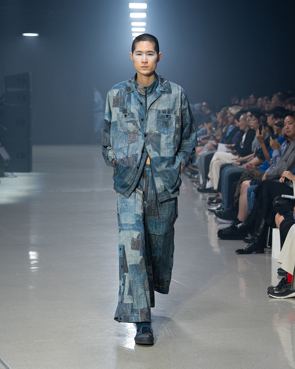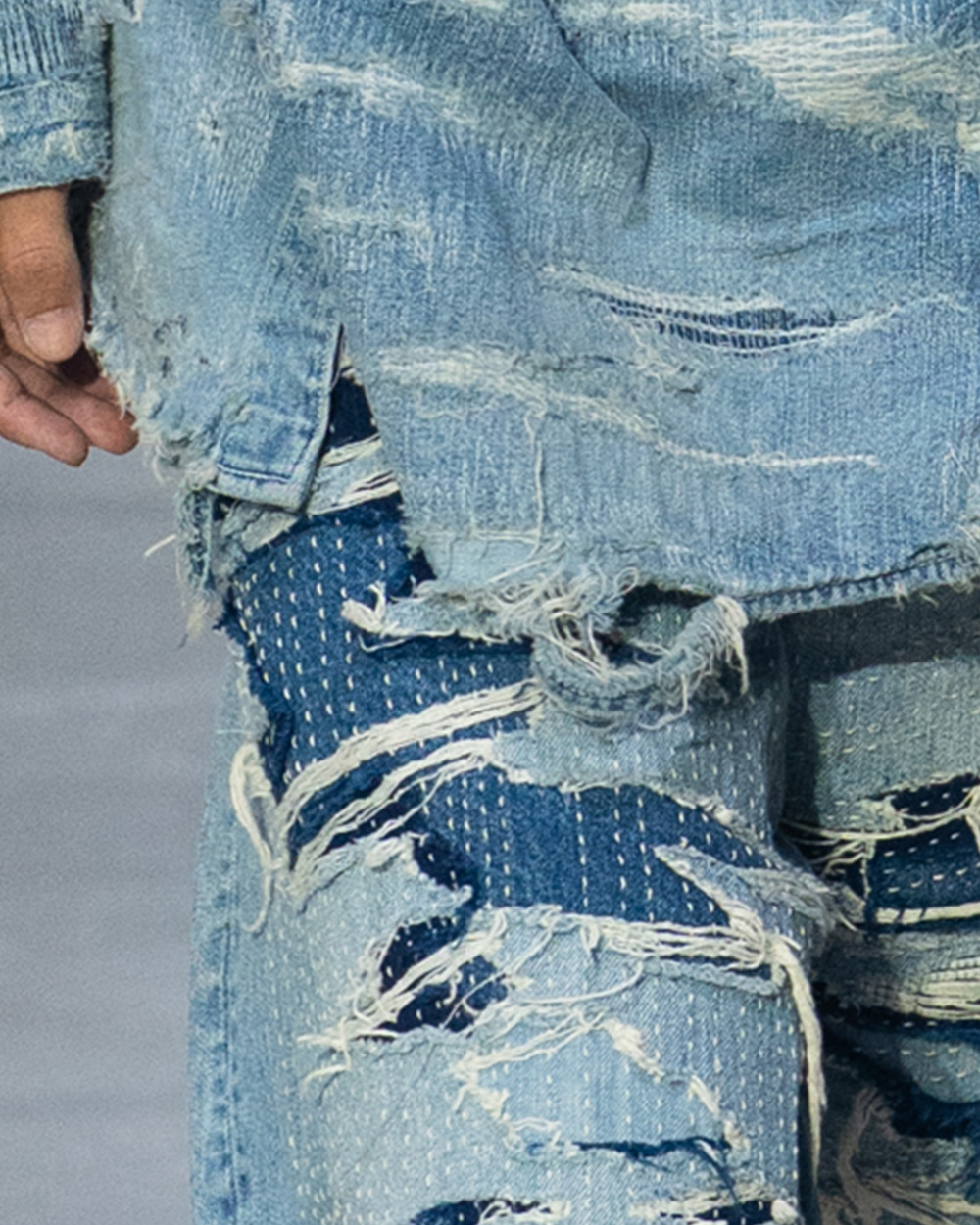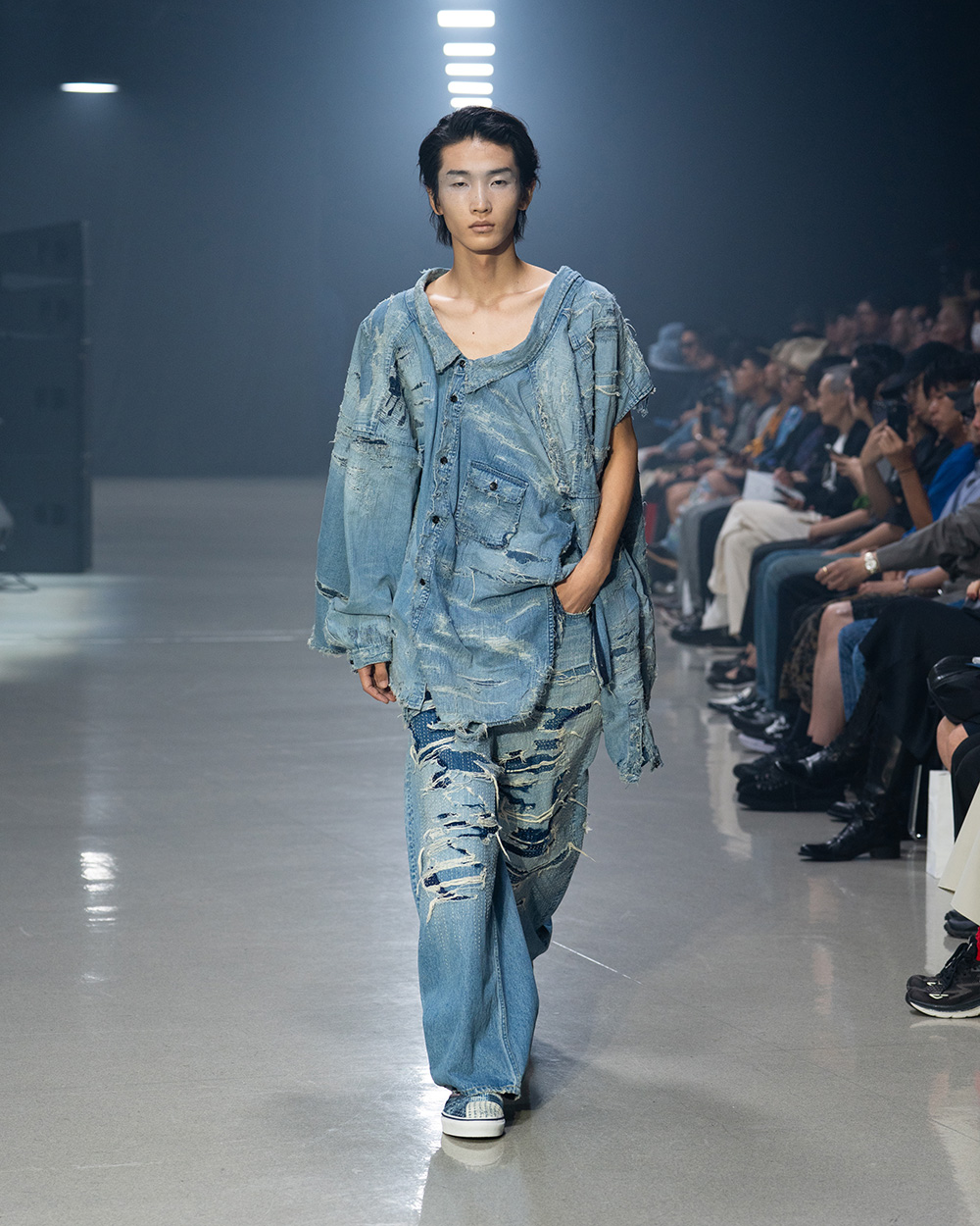 2005年の立ち上げ以来、経年変化に魅了され、インディゴやデニムを主役に“着るほど愛着の湧くプロダクト”を提案してきた。今季はジャケットやジーンズを上下反転や解体で再構築するなど、ユニークなアプローチを模索。デザイナーが収集するボロ布からの着想は、精緻なダメージ加工やメッシュ地への転写プリントで幅広く表現し、細部にこだわったタイダイのスエットパーカも存在感を放った。変化を楽しむ姿勢がインディゴの可能性を広げている。