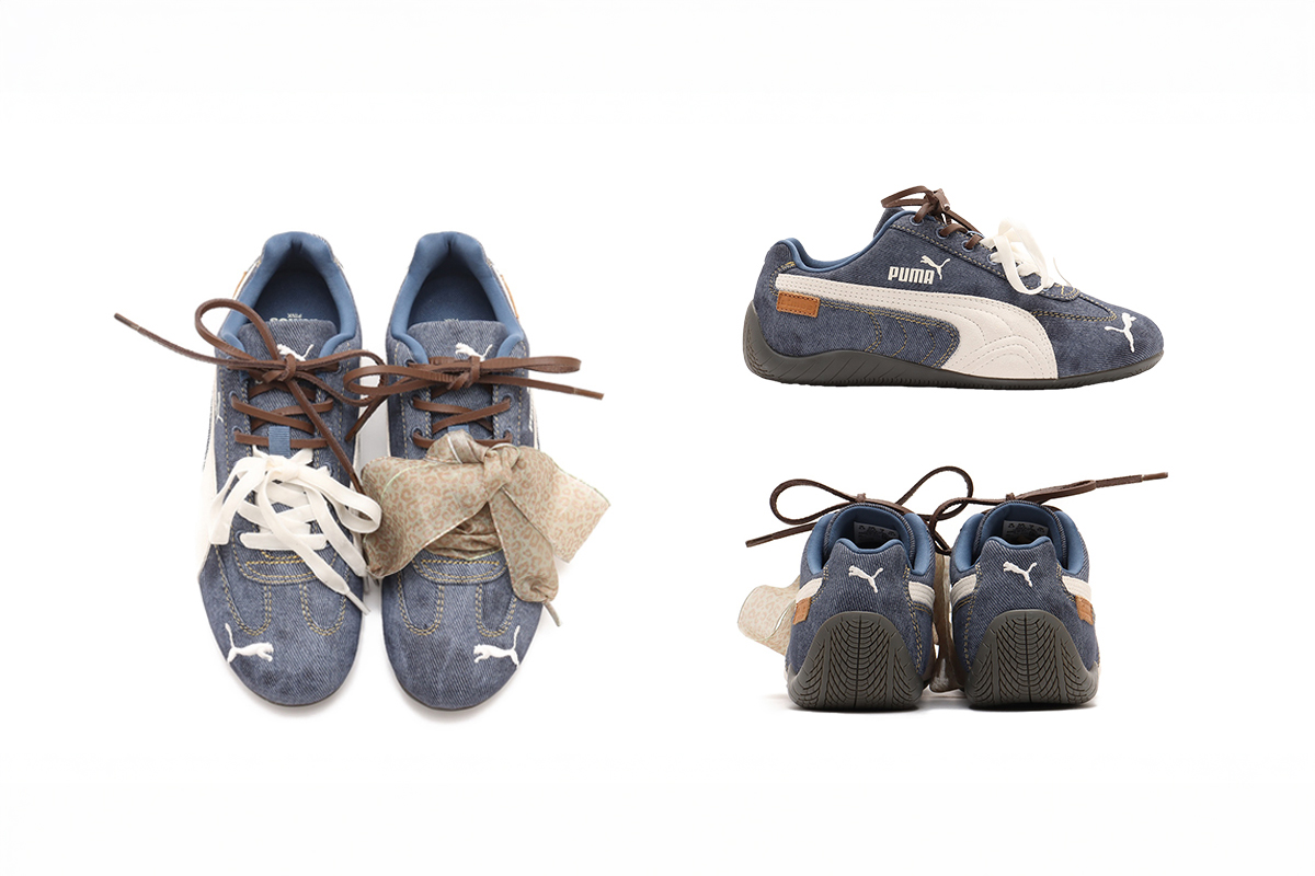 「アトモス ピンク(ATMOS PINK)は「プーマ(PUMA)」“スピードキャット”の別注モデル“プーマ スピードキャット アトモス ピンク デニム”(1万6500円)を制作。アッパーに上質なデニムファブリックを採用し、ソールにはグリップ性に優れたラバーアウトソールを搭載した。シューレースは、レザーとコットンの2種類が付属する。