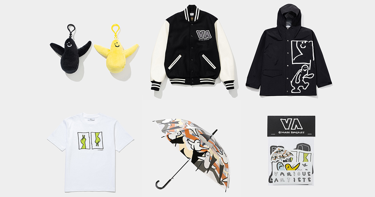本コラボレーションでは、マーク・ゴンザレスの象徴的な“Angel”のアートワークをそのまま3Dで表現したキーホルダーをはじめに、ピースマークを上下で表現した「V.A.」に見立てたグラフィックTシャツや、アワードジャケット、スエットなどをそろえる。