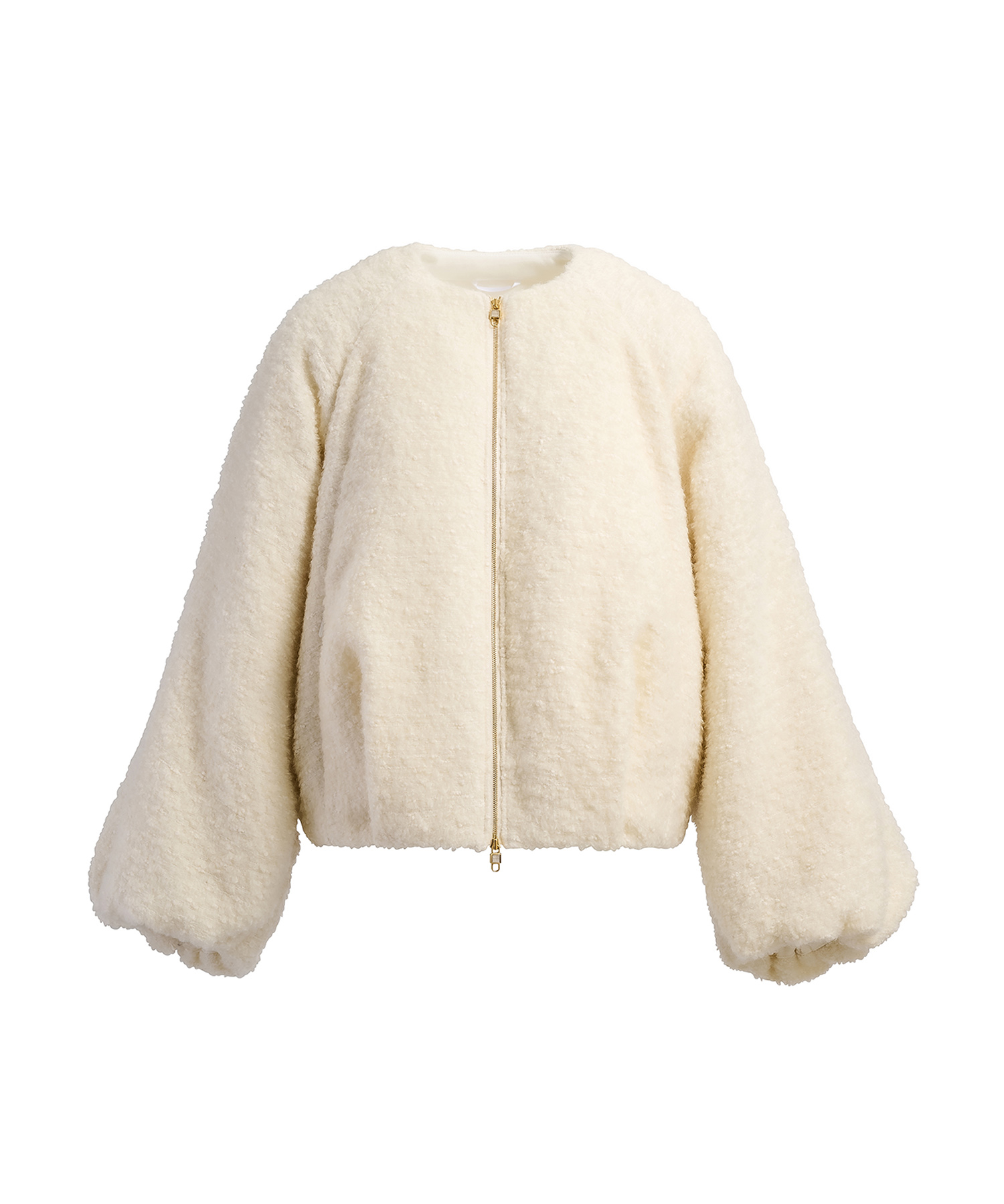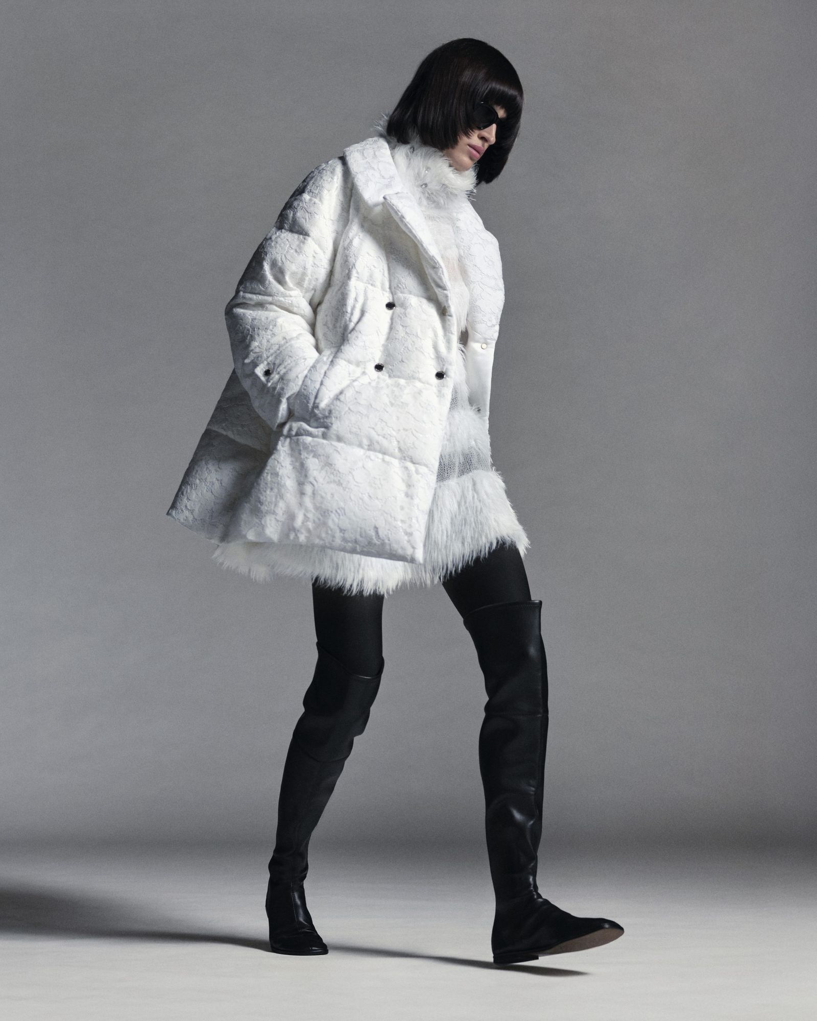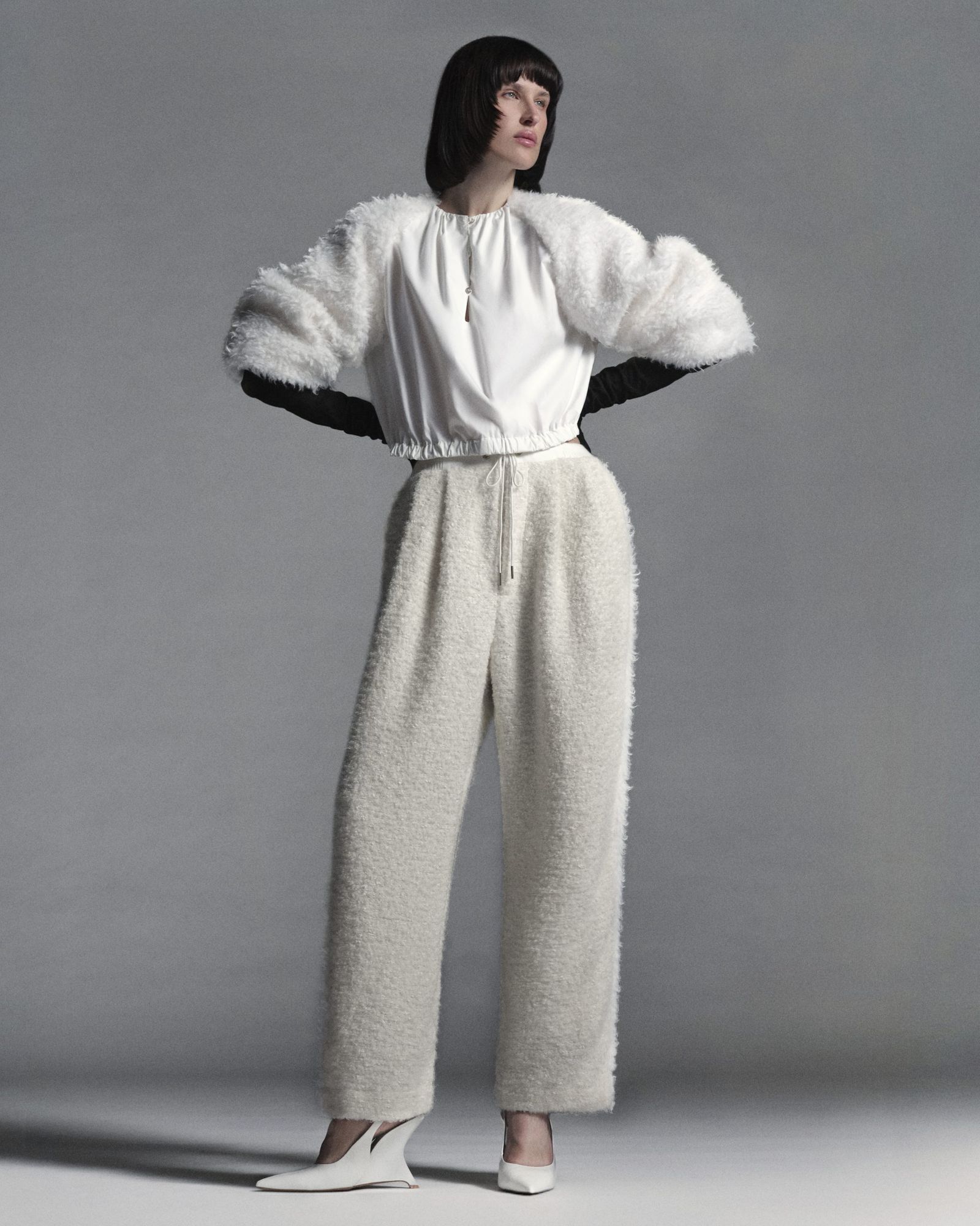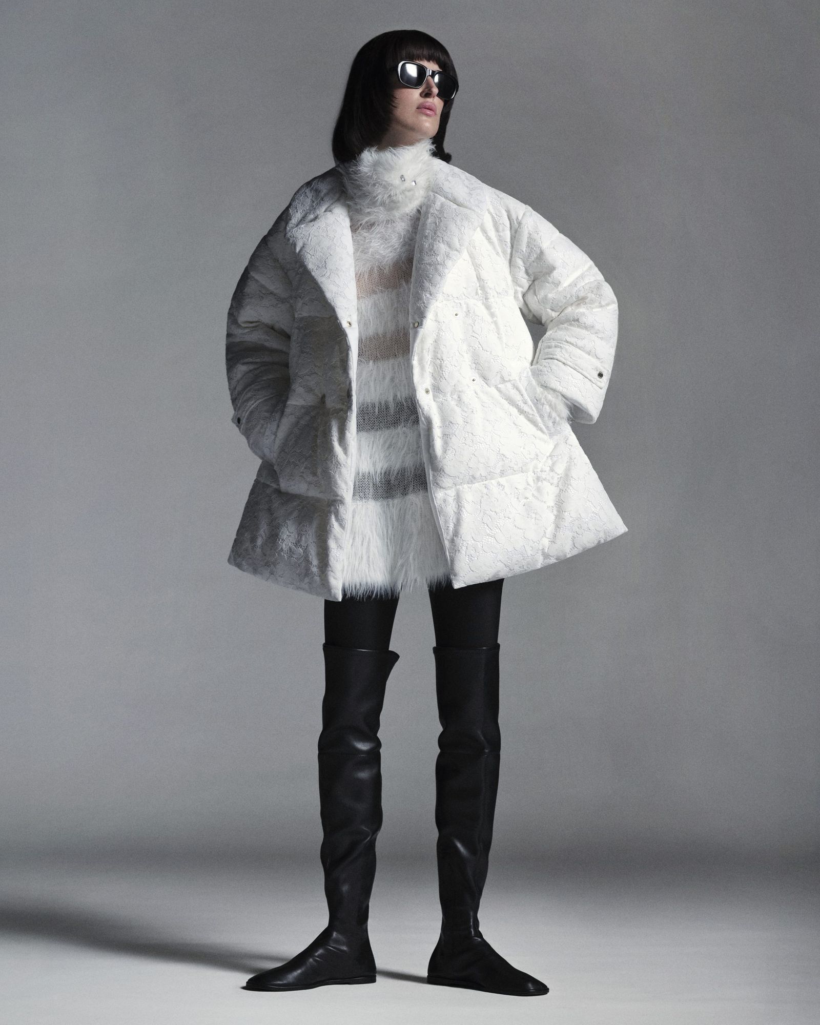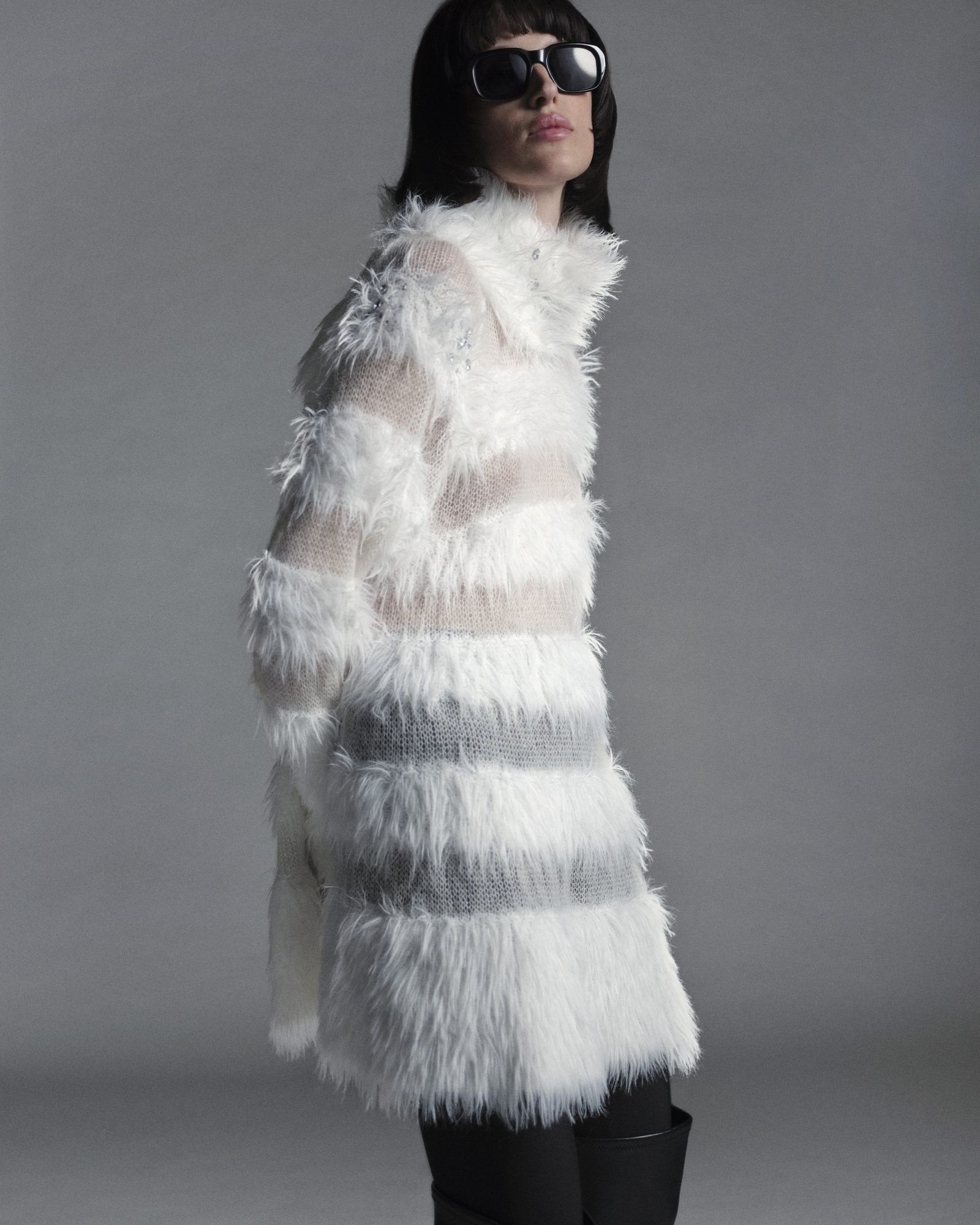 そのほかにも、長い毛足の編み地とシアー感のある編み地が珍しいボーダーニット(8万1400円)や、レースと滑らかなサテンを組み合わせたシャツ(7万2600円)、柔らかく温かな真っ白のフード付きボアマフラー(6万6000円)などを用意。単調になりがちなホワイトカラーに、柄や素材、ボタンなどでアクセントを加え、洗練された雰囲気を演出している。