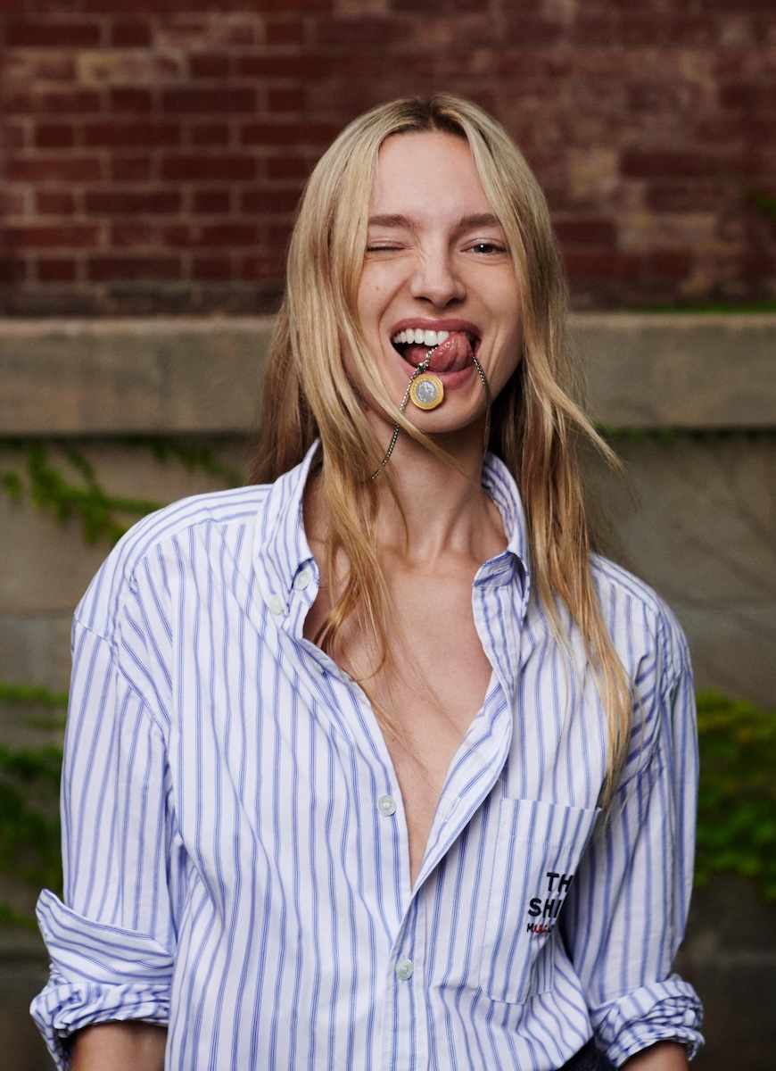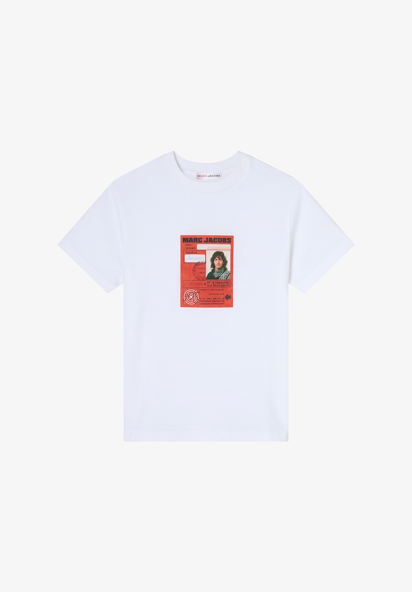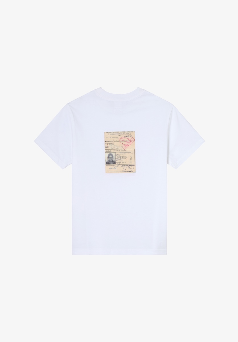 Tシャツは、表にマークが80年代にパリで使っていた定期券の“カルト・オランジュ(CarteOrange)”、裏にジャンがソルボンヌ大学時代の学生証を2人の当時の顔写真付きでプリント。また、ジーンズやペニーローファーにあしらった2人の横顔を刻んだ古代ローマ風のボタンも、ユーモアあふれる2人らしいデザインとなっている。