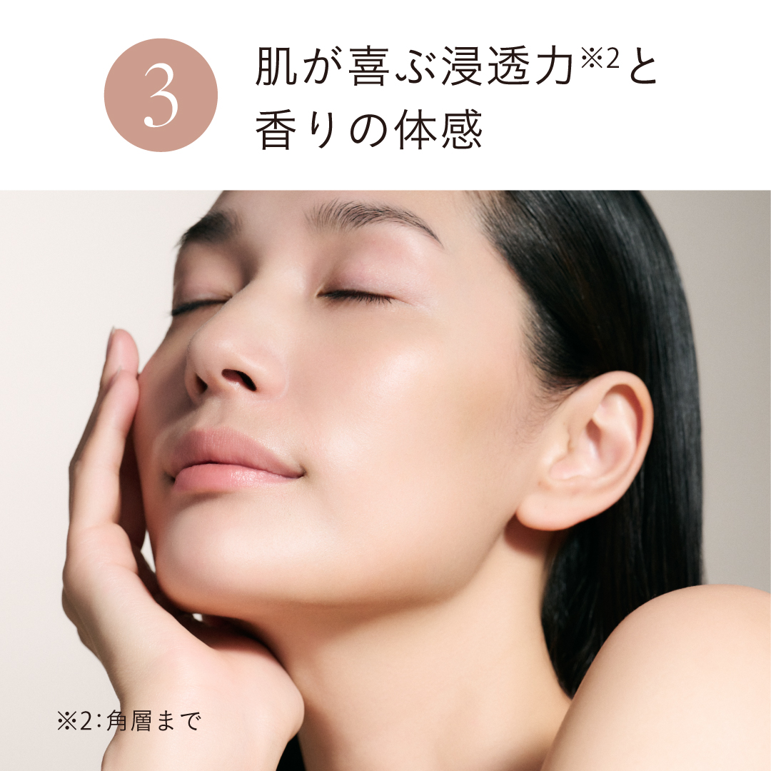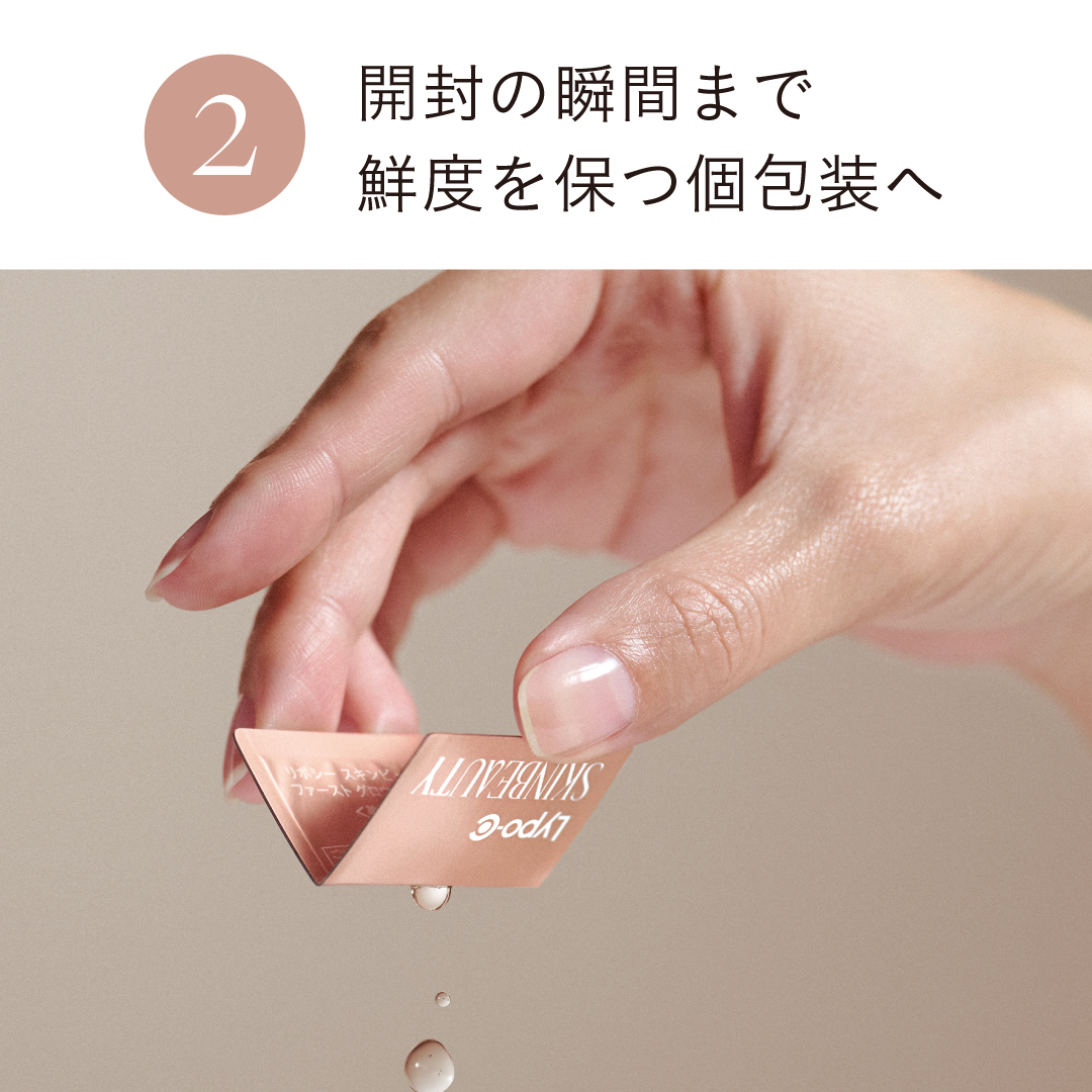 同製品は1箱28包入りで、価格は1万2320円。独自技術により、安定化が難しいとされるピュアビタミンCのリポソーム化に成功。角層までビタミンCを届けることを可能にした。酸化を防ぐための個包装を採用し、フレッシュな状態を保つ。使用感はみずみずしさと柔らかなとろみを兼ね備え、天然ダマスクローズオイルの香りを取り入れた。