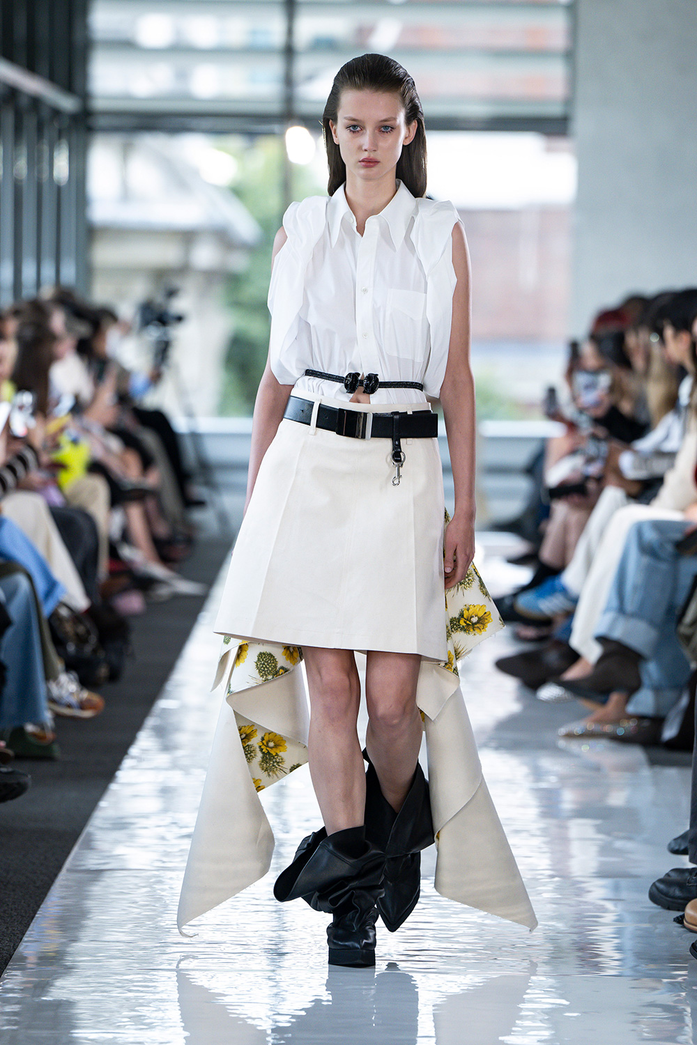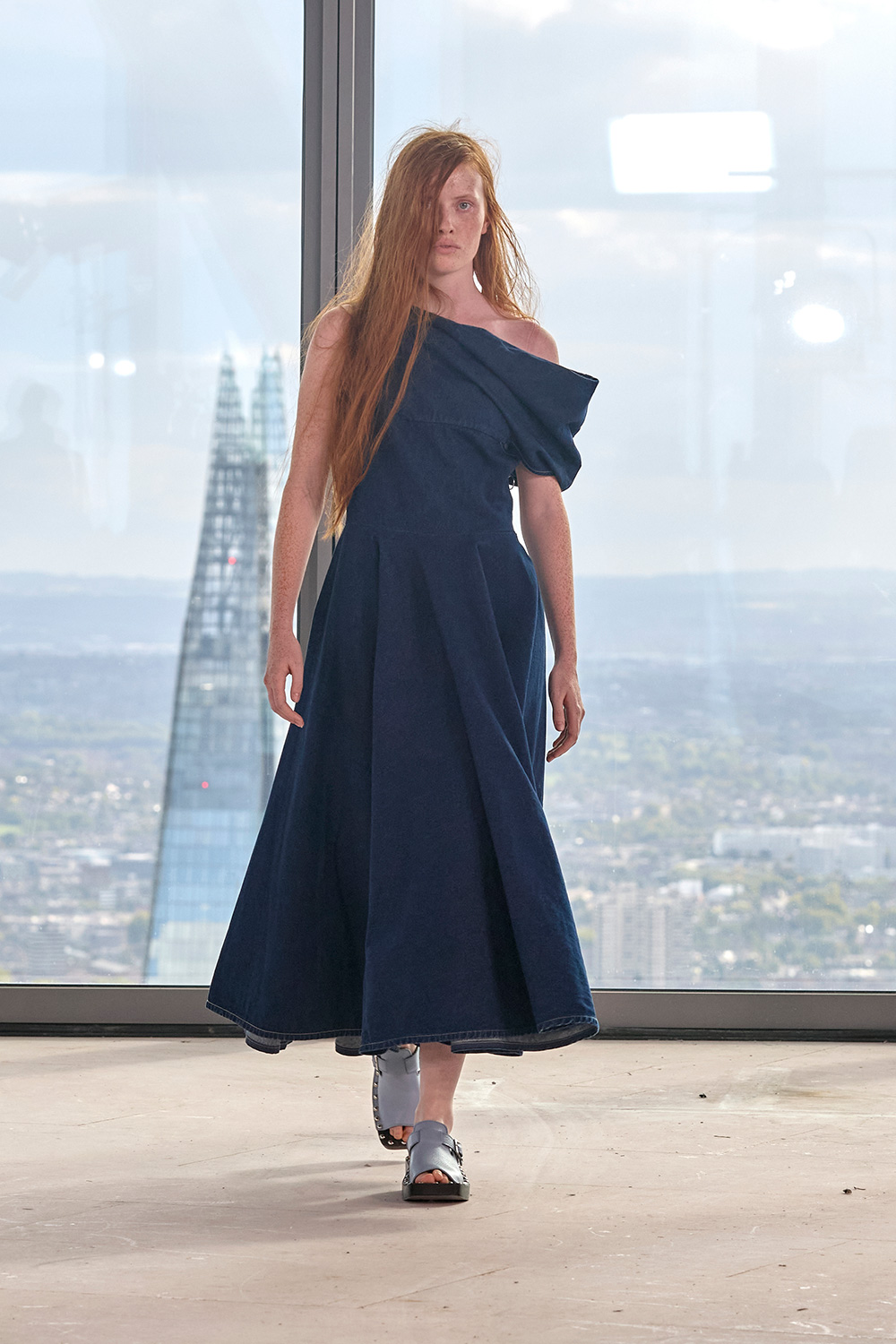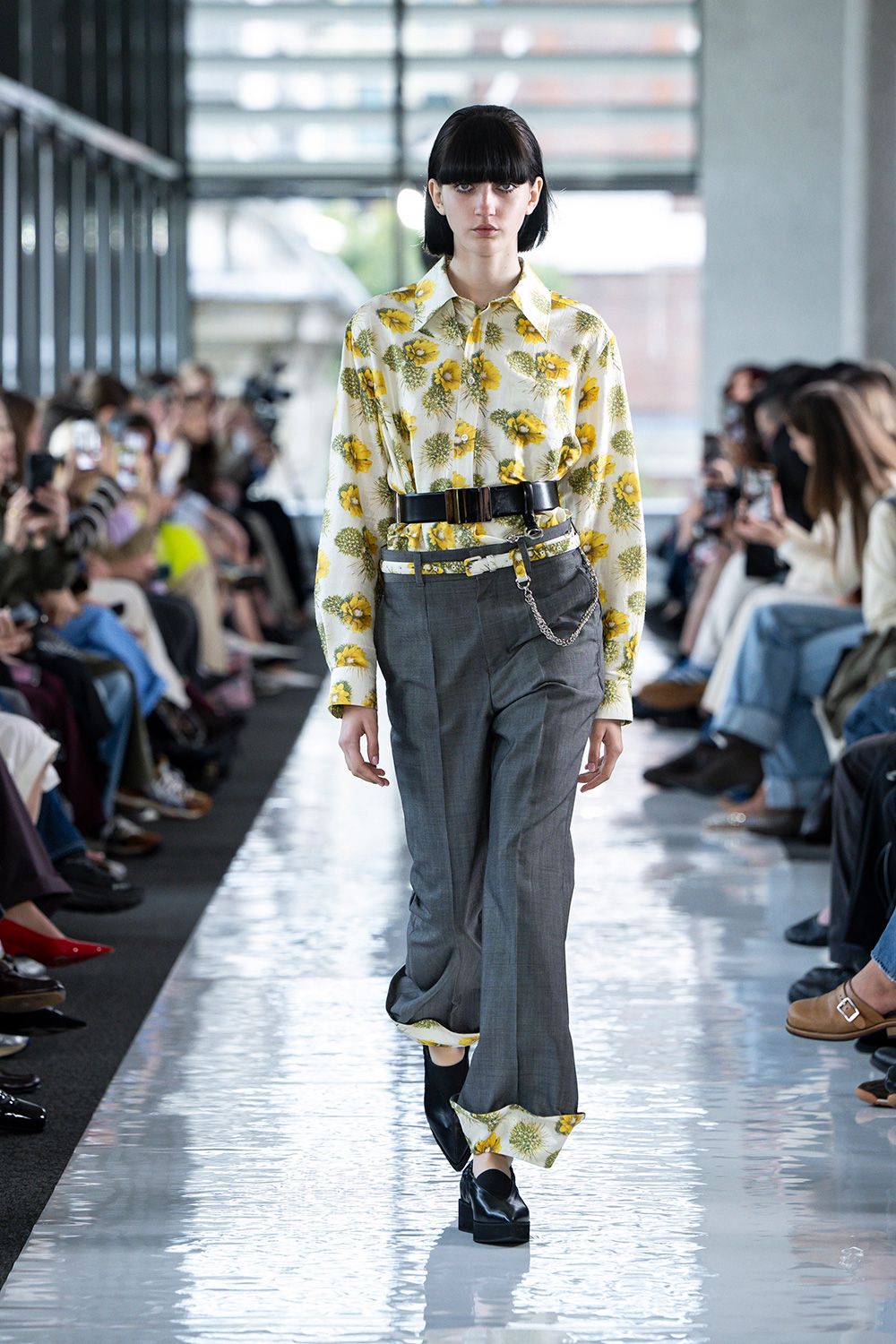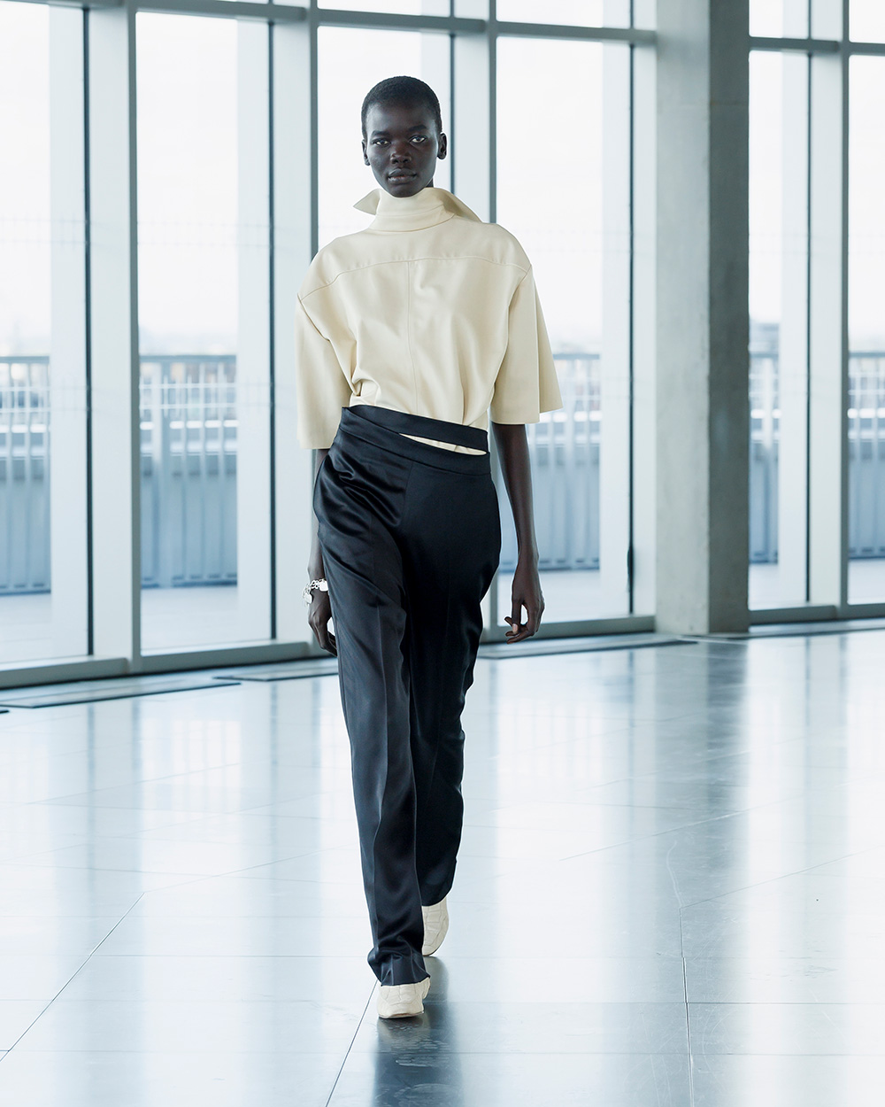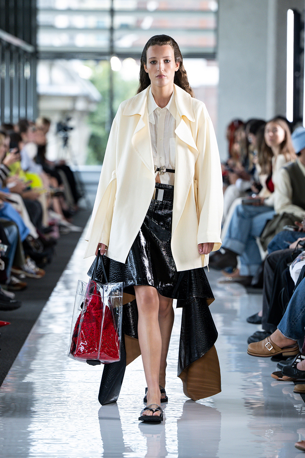カラーは、ホワイトやベージュ、エクリュなど、クリーンな印象を与えるニュートラルカラーが主流。ミニマルにまとめつつも、アシンメトリーなカッティングや構築的なシルエットで個性を出すのがロンドン流。代表例は「トーガ(TOGA)」。古田泰子デザイナーは、「難しいことを考えず、単純な服作りに立ち返りたいと思った」と話し、シンプルな装いをベースにしながら、ボトムスに取り付けた控えめに波打つラッフル状の布パネルや、シャツの袖をたくし上げたようなディテールなどで、“凡庸性”に“意外性”を加えた。
