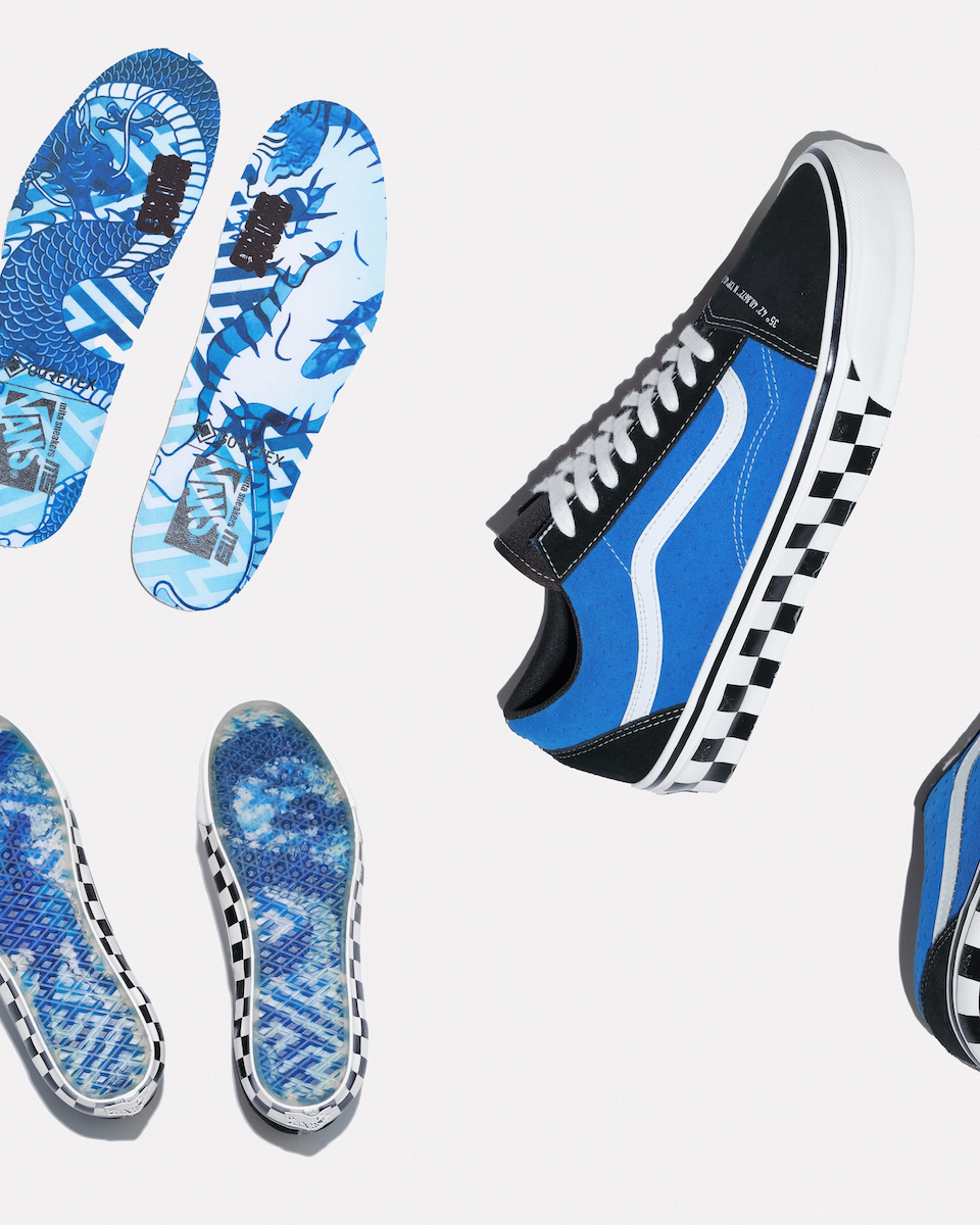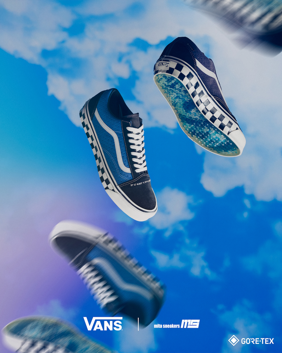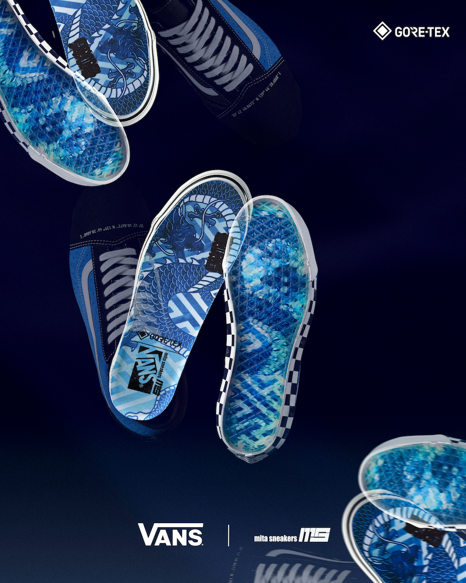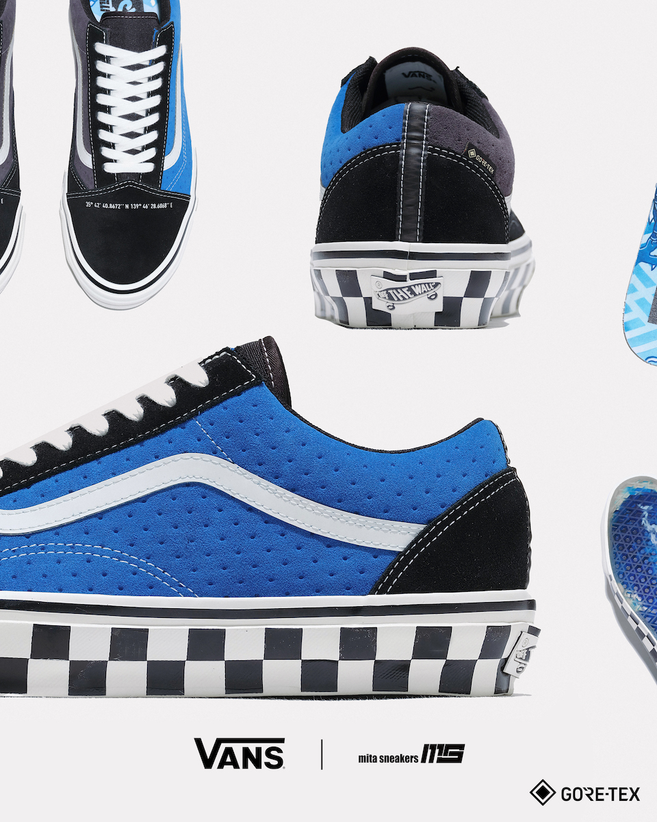 ミタスニーカーズと“ヴァンズ プレミアム”の初コラボスニーカーは、「ヴァンズ」の定番スケートシューズのアップデートモデル“プレミアム オールドスクール(PREMIUM OLD SCHOL)”をベースに採用した。コンセプトに“七顚八起(七転び八起き)”を掲げ、サイドパネルの外側に空をイメージしたブルーを、内側にアスファルトを想起させるグレーを配色し、フォクシングテープのチェッカーボード柄はダイスに着想。また、アッパーに「ゴアテックス(GORE-TEX)」を搭載してサイドストライプを蓄光仕様にアップデートしたほか、ヴァンプにミタスニーカーズの住所を示すマップコードをあしらい、インソールとアウトソールには龍と虎のオリジナルグラフィックをデザインし、左右のシュータンの内側に“七顚八起”と“温故知新”の文字をそれぞれ配している。