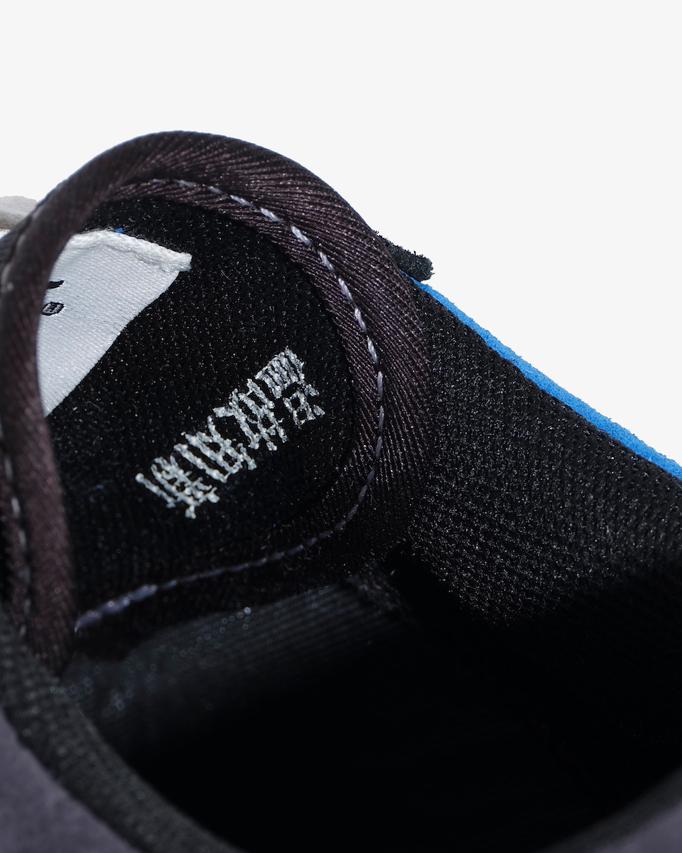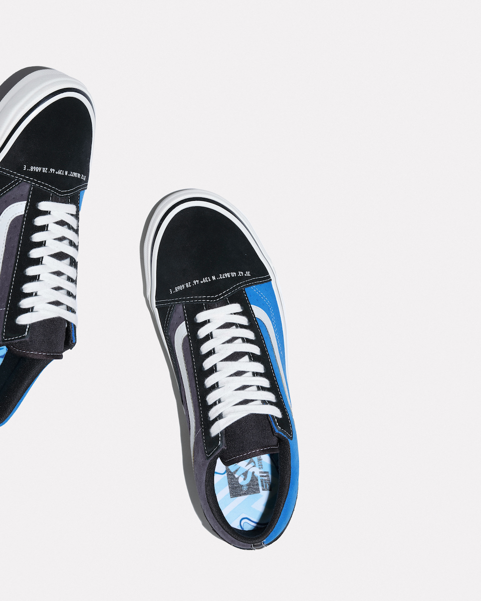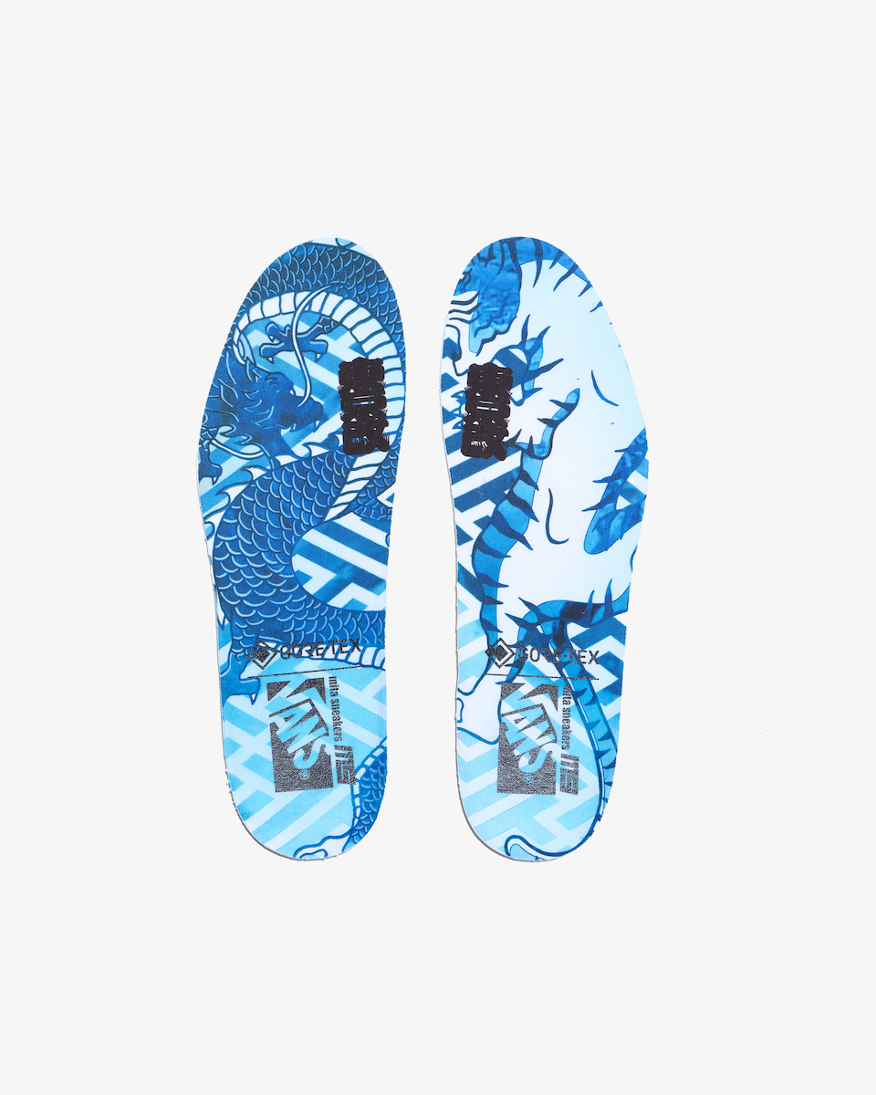 ミタスニーカーズと“ヴァンズ プレミアム”の初コラボスニーカーは、「ヴァンズ」の定番スケートシューズのアップデートモデル“プレミアム オールドスクール(PREMIUM OLD SCHOL)”をベースに採用した。コンセプトに“七顚八起(七転び八起き)”を掲げ、サイドパネルの外側に空をイメージしたブルーを、内側にアスファルトを想起させるグレーを配色し、フォクシングテープのチェッカーボード柄はダイスに着想。また、アッパーに「ゴアテックス(GORE-TEX)」を搭載してサイドストライプを蓄光仕様にアップデートしたほか、ヴァンプにミタスニーカーズの住所を示すマップコードをあしらい、インソールとアウトソールには龍と虎のオリジナルグラフィックをデザインし、左右のシュータンの内側に“七顚八起”と“温故知新”の文字をそれぞれ配している。