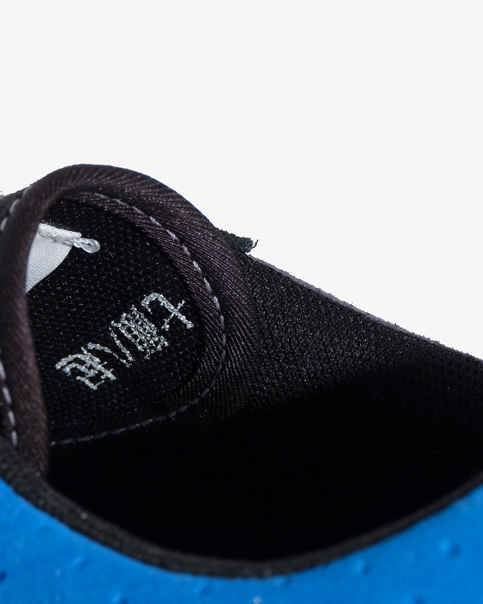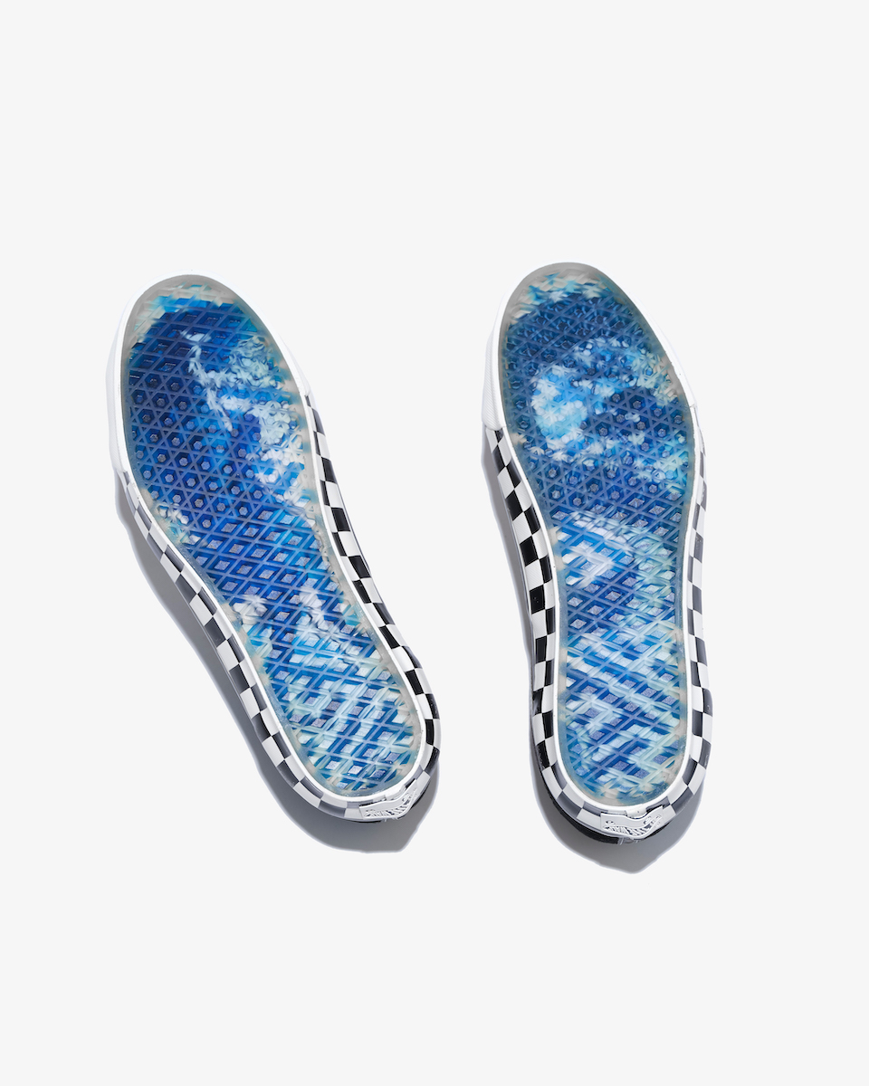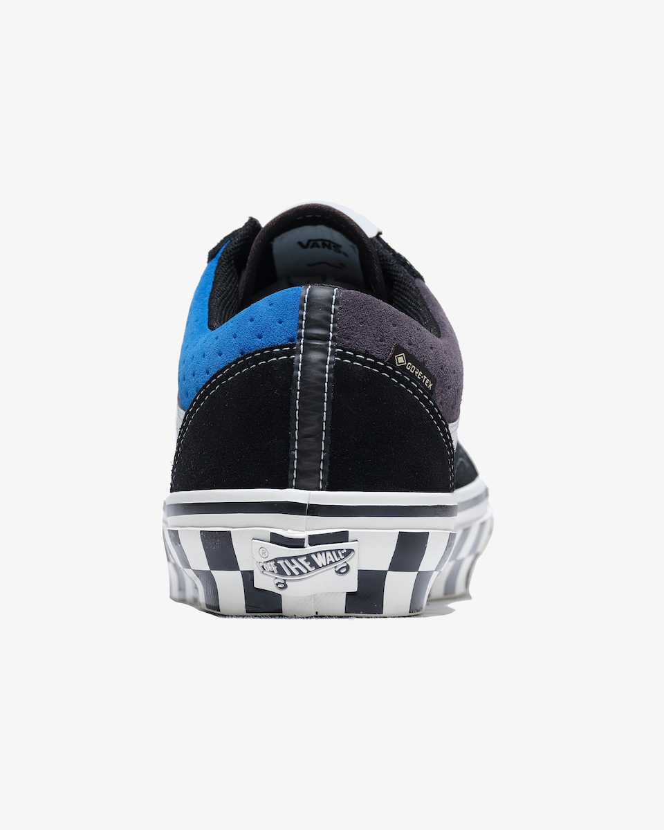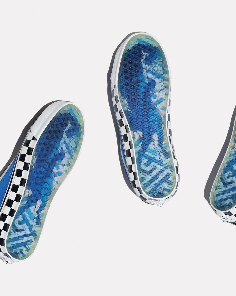 ミタスニーカーズと“ヴァンズ プレミアム”の初コラボスニーカーは、「ヴァンズ」の定番スケートシューズのアップデートモデル“プレミアム オールドスクール(PREMIUM OLD SCHOL)”をベースに採用した。コンセプトに“七顚八起(七転び八起き)”を掲げ、サイドパネルの外側に空をイメージしたブルーを、内側にアスファルトを想起させるグレーを配色し、フォクシングテープのチェッカーボード柄はダイスに着想。また、アッパーに「ゴアテックス(GORE-TEX)」を搭載してサイドストライプを蓄光仕様にアップデートしたほか、ヴァンプにミタスニーカーズの住所を示すマップコードをあしらい、インソールとアウトソールには龍と虎のオリジナルグラフィックをデザインし、左右のシュータンの内側に“七顚八起”と“温故知新”の文字をそれぞれ配している。