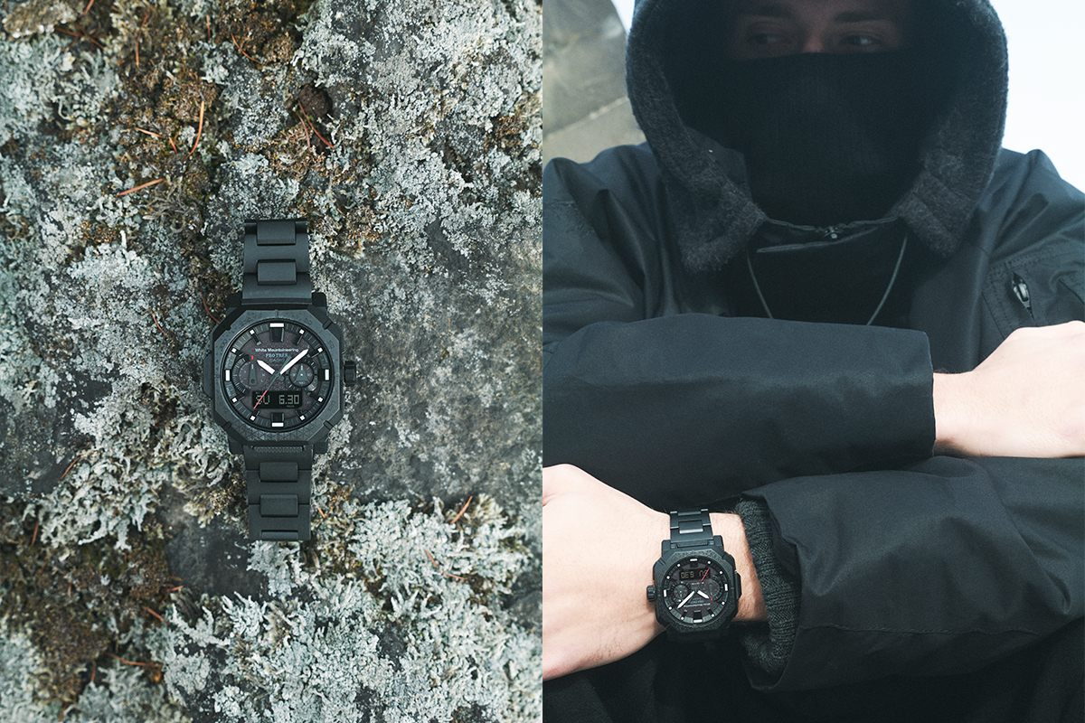 「ホワイトマウンテニアリング(WHITE MOUNTAINEERING)」は、カシオ計算機の“プロトレック(PRO TREK)”とコラボレーションしたウオッチ(14万800円)を数量限定で発売。コラボ第2弾となる本作のカラーリングは、マットブラックのダイアル、ケース、バンドに、白い蓄光インデックスと時計針、赤い秒針を組み合わせた。また、電波ソーラーとBluetoothを搭載し、常に正確な時刻を維持する。