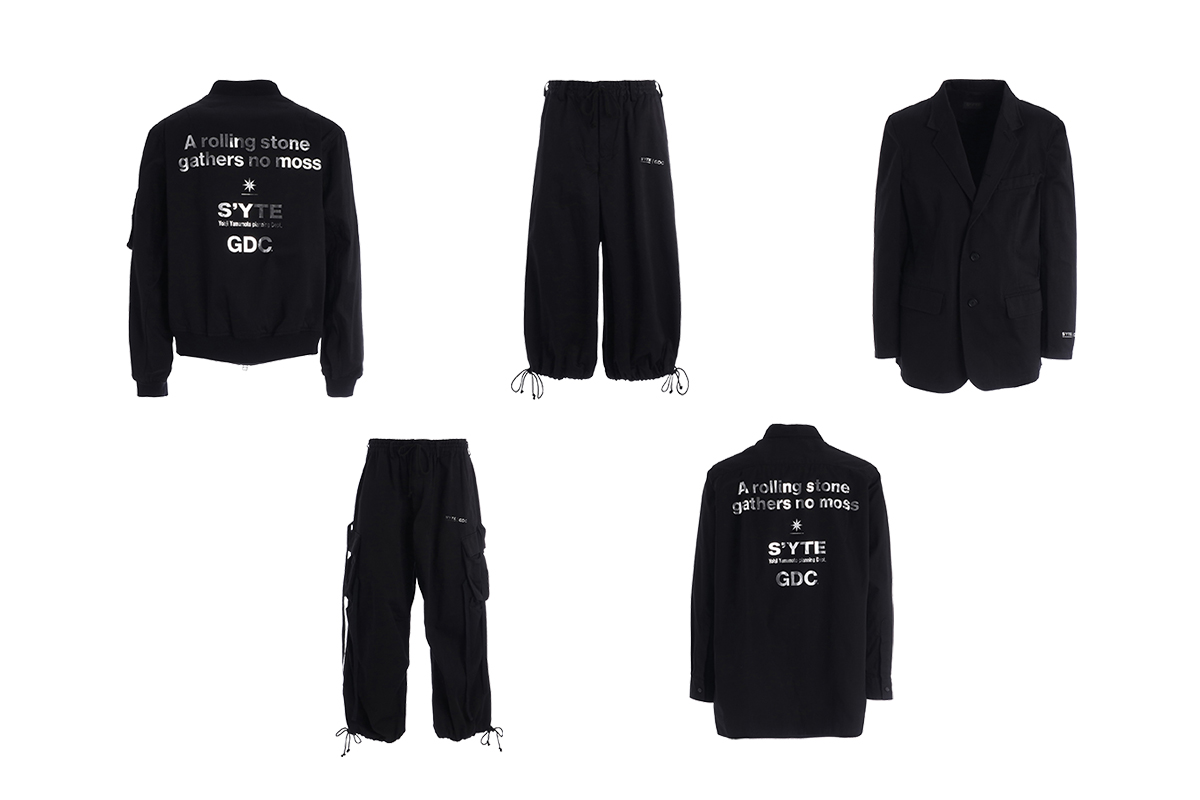 ヨウジヤマモト(YOHJI YAMAMOTO)の「サイト(S’YTE)」は、「GDC(ジーディーシー)」とのコラボコレクション第2弾を制作。S’YTE×GDCのロゴと、GDCの哲学を象徴する一節“A rolling stone gathers no moss”をシルバー箔でプリントした“ボンバージャケット”(4万4000円)や、“ハカマ バルーン パンツ”(3万8500円)などをラインアップする。