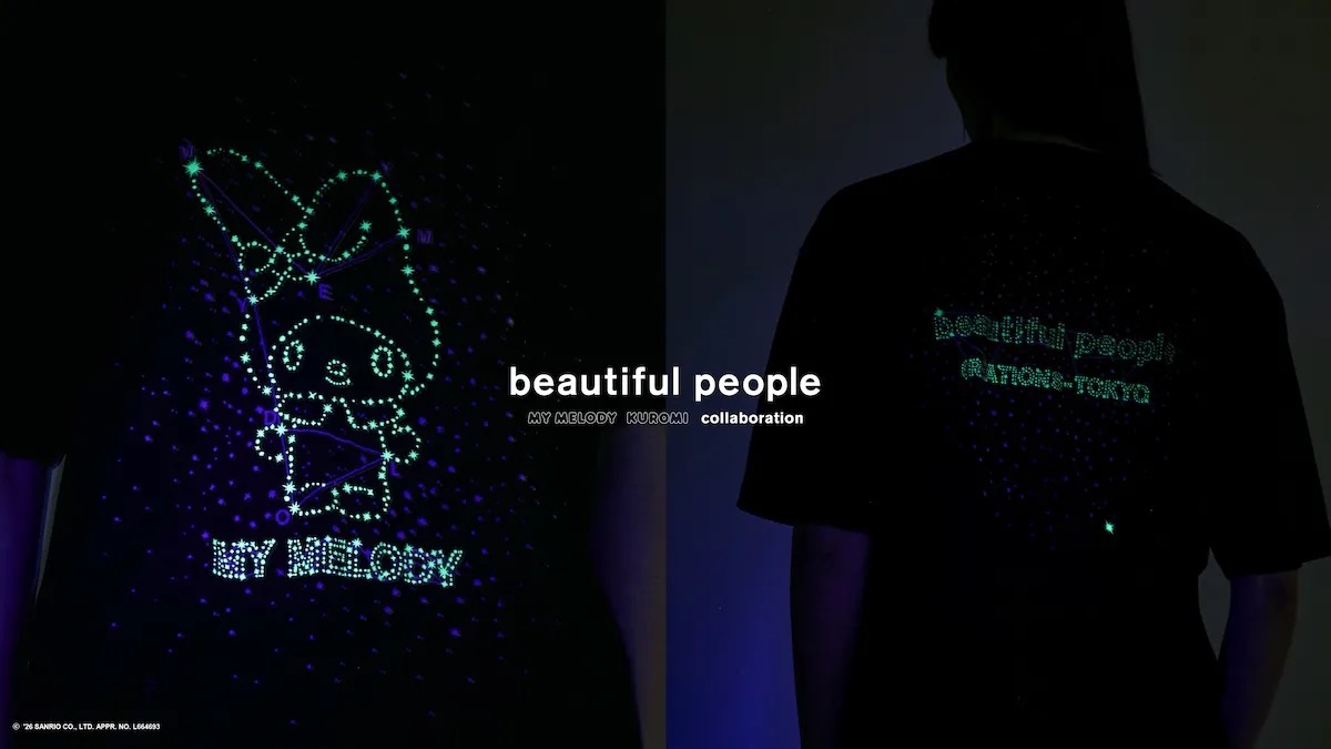 「ビューティフルピープル(BEAUTIFUL PEOPLE)」は、サンリオのキャラクター、マイメロディとクロミとのコラボレーションアイテムを用意する。今回のコラボレーションでは、蓄光プリントを施した暗闇で光るシアーTシャツやトラックジャケット、ウオレットなどの全5型のアイテムをそろえる。
