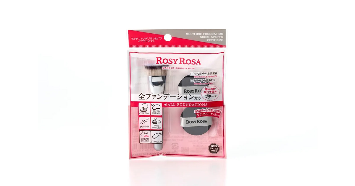 「ロージーローザ(ROSYROSA)」は、“全ファンデーション”に対応する“マルチファンデブラシ”と“マルチファンデパフ”のミニサイズセット“マルチファンデブラシ&パフ〈プチサイズ〉”を用意する。同製品は、メイクブラシ“マルチファンデブラシ”とメイクパフ“マルチファンデパフ”(2個入り)のミニサイズを組み合わせたセットだ。