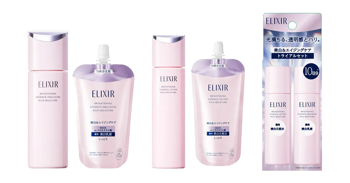 資生堂のエイジングケアブランド「エリクシール(ELIXIR)」は、進化した美白&エイジングケア化粧水・乳液“エリクシール ブライトニング ローション しっとりタイプ ca”【医薬部外品】など全9品をそろえる。それぞれ「みずみずしいタイプ」と「しっとりタイプ」を用意する。