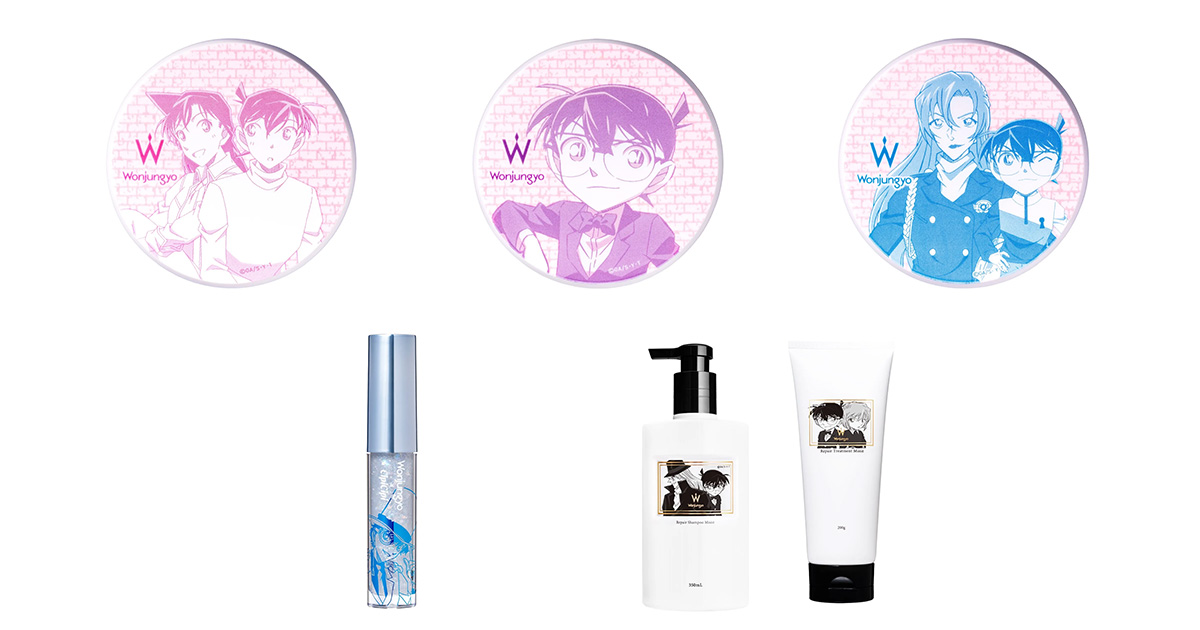 「ウォンジョンヨ(WONJUNGYO)」は、アニメ「名探偵コナン」とのコラボアイテムを数量限定で用意する。江戸川コナンや萩原千速が描かれたプレストパウダーや怪盗キッドをあしらったグリッターのほか、ヘアケアライン「ウォンジョンヨ ヘア(WONJUNGYO HAIR)」のヘアケア製品やパックなど7アイテムをそろえる。