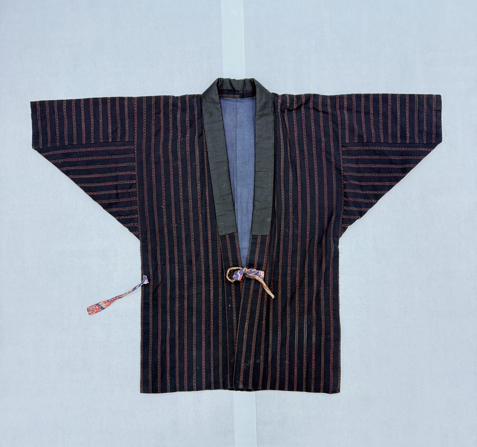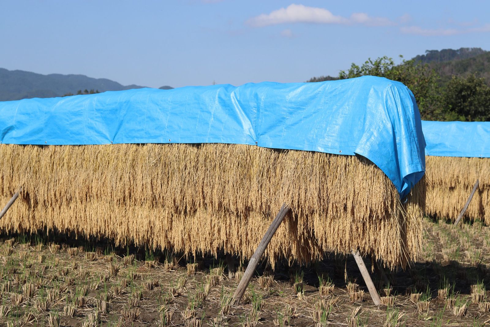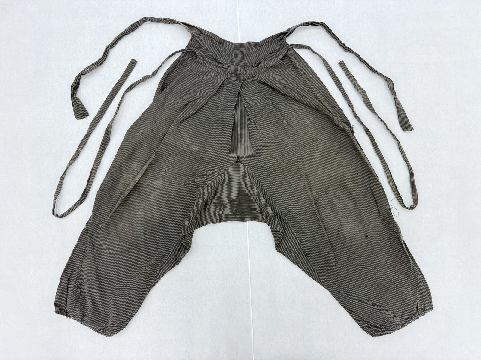 同コレクションでは、農業において頻繁に使用されるブルーシートに注目した。旧式織機のひとつであるシャトル織機を用い、緯糸にブルーシートの原料であるポリエチレンフィラメント、経糸に綿と麻を使用したテキスタイルを開発。村田の故郷・長野県内の博物館と共同調査し、野良着の柄をアップデートした縞柄を織り込んだ。フィラメントは、ブルーシートを最初に開発・製造し、今日まで続く萩原工業からの提供だ。完成したテキスタイルは素朴でありながら適度な艶を放ち、農の素材である藁や稲を想起させる。