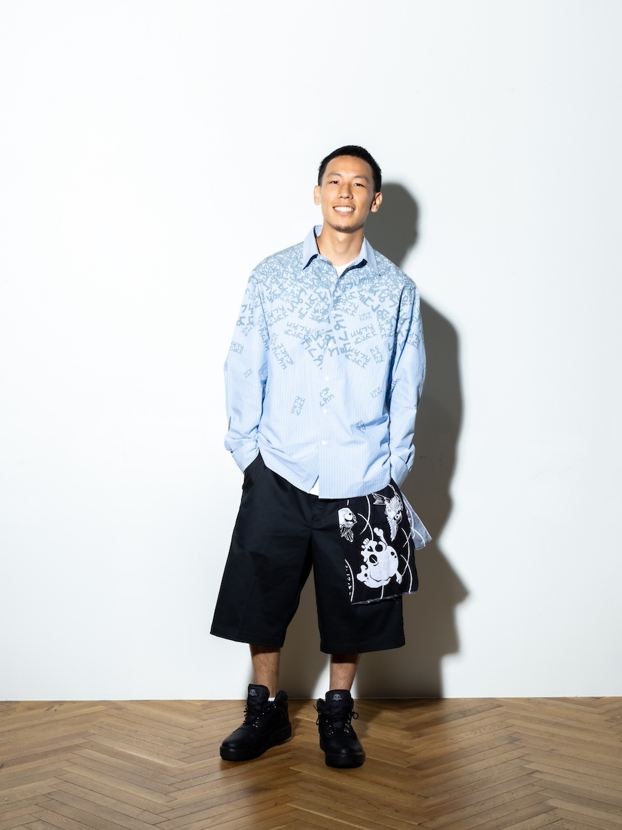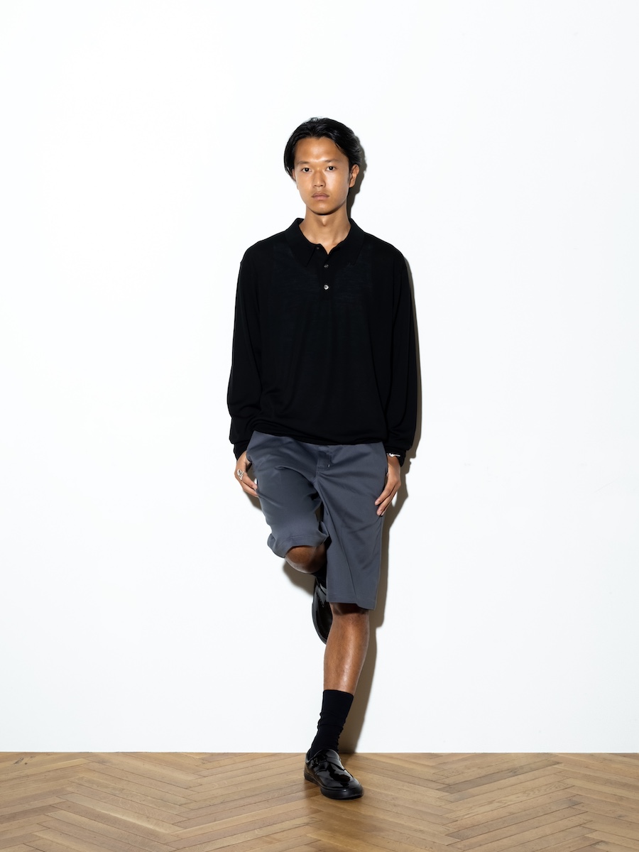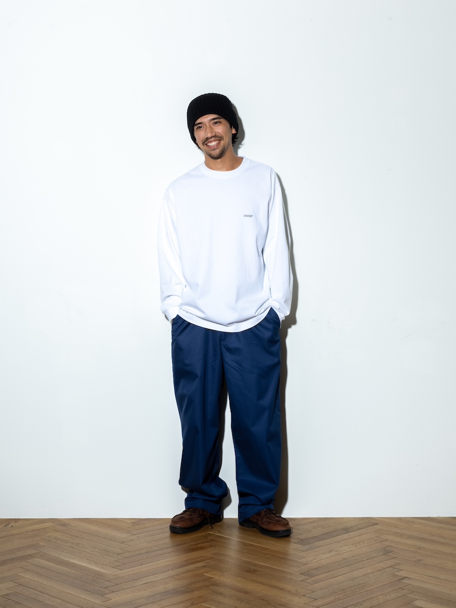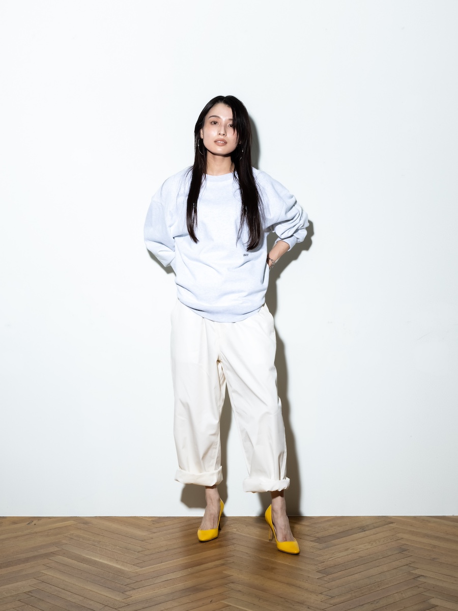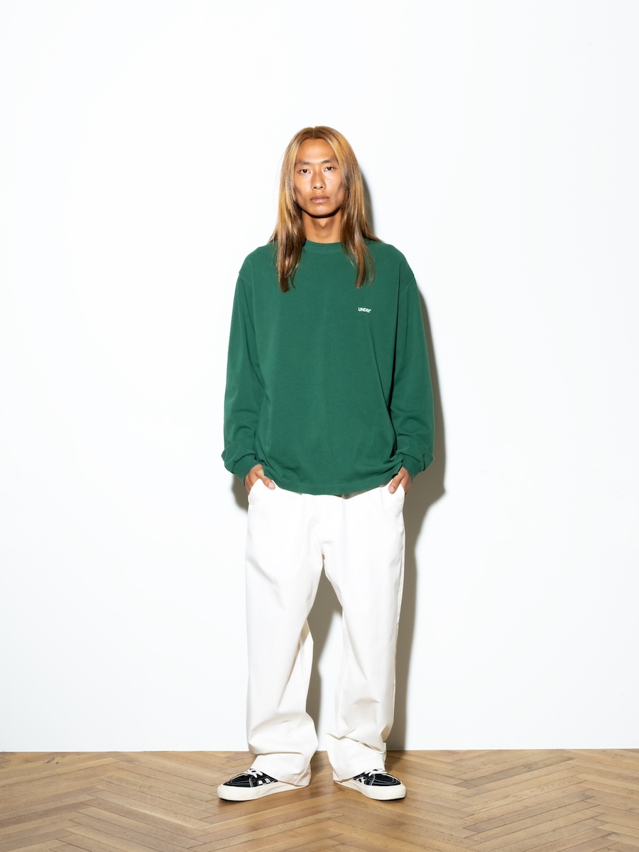 アイテムは全ていちからパターンを作成し、素材やシルエット、着心地など細部にこだわった。例えば、スエットパンツ(2万3100円)やフーディ(2万5300円)は、21番手の単糸を2本撚り合わせた双糸を使用した3層構造の裏毛素材に、ワンポイントロゴを配した。毛羽立ちが少なく、きれいな表情とさまざまな時季で活躍するほどよく厚みのある生地が特徴だ。また、ウォッシュ加工とタンブラー乾燥を施し、洗濯の際に起きる縮みを軽減した。