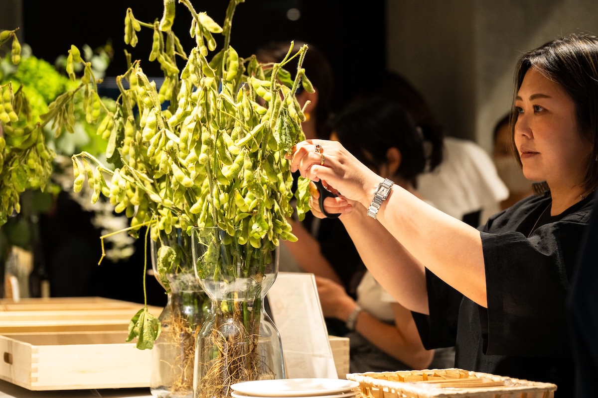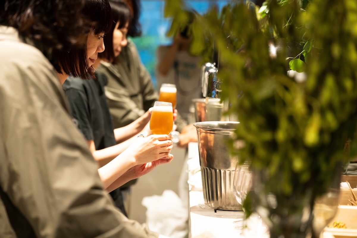 「カナダグース」が8月8日に銀座の旗艦店で開催した「銀座ソーラーシェアリングサロン」で提供されたのは、カナダグースジャパンが千葉・匝瑳で手がけるソーラーシェアリング(営農型太陽光発電)の農地で育てた有機大麦を使ったクラフトビールと有機枝豆だった。