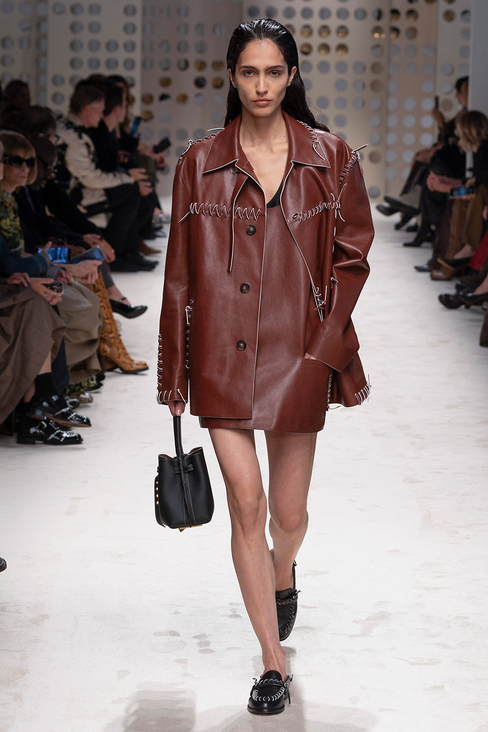 4シーズン目を迎えたマッテオ・タンブリーニは、引き続きロング&リーンかつミニマルなスタイルを貫いた。そこに今季らしさを加えたのは、アイコンシューズの“ゴンミーニ”を思わせるディテールだ。ハンドステッチやパーフォレーションを、シューズやバッグはもちろん、滑らかなレザーのドレスやジャケットにも象徴的に施して、アイデンティティーを際立たせた。ナイロンのアノラックの後ろ身頃にもレザーを配したり、シャツにも細いレザーを縫い付けてストライプを表現したりとハンドワークを余すことなく盛り込んだ。足元は、パーフォレーションで飾ったオープントゥの“ゴンミーニ”や、マルチカラーのスレッティング(細いレザーによるかがり飾り)を施したローファーが登場した。