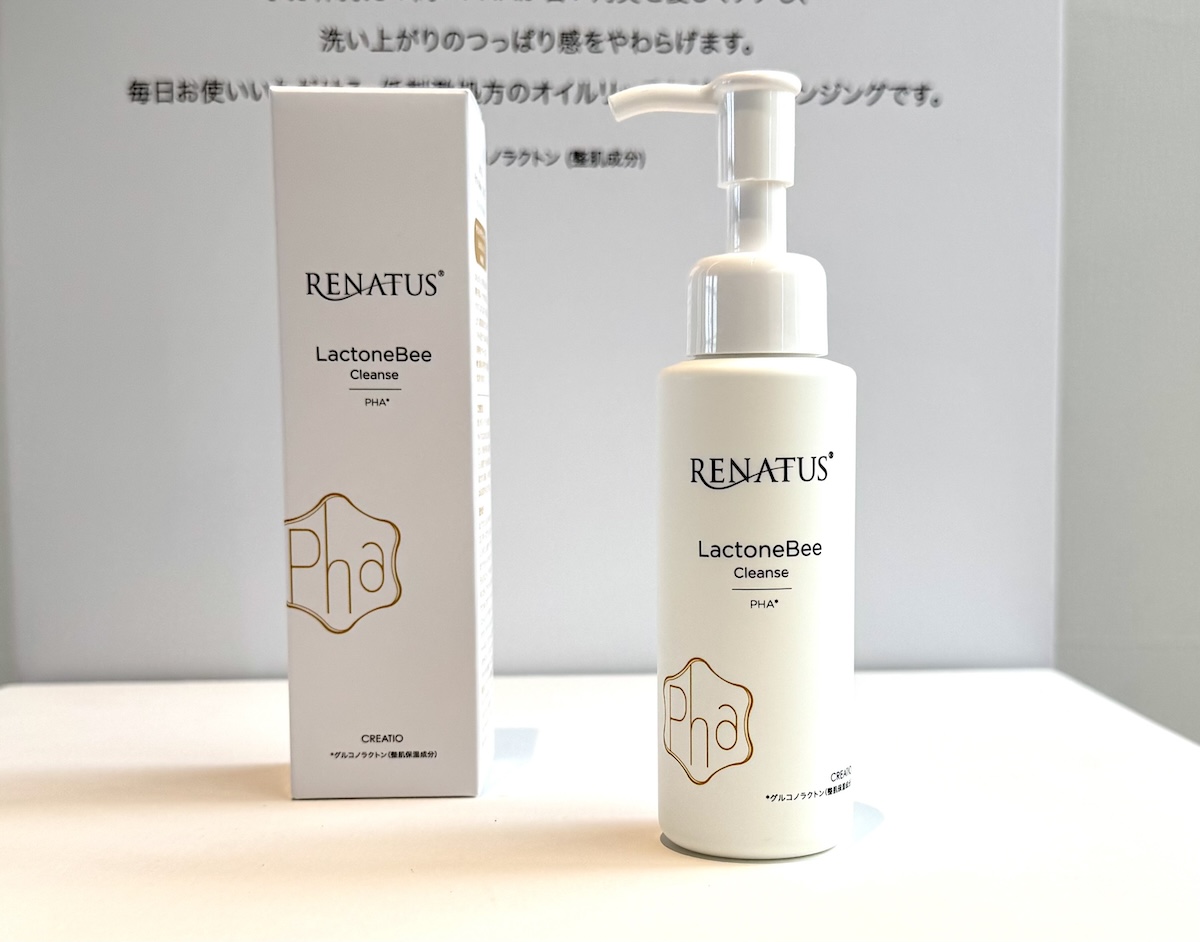 これまで、洗顔石けん、化粧水、乳液、日焼け止めを扱ってきたが、10月中旬からブランド初のクレンジング“ラクトンBeeクレンズ”(100mL、2860円)を発売する。肌に刺激を与えず古い角質をしっかりオフする次世代PHAと呼ばれるグルコノラクトンを採用。グルコノラクトンは、マイルドなピーリング効果と高い保湿力、抗酸化作用を持つ。低刺激性処方のオイルリッチクレンジングで敏感肌や施術後の肌にも使用できる。