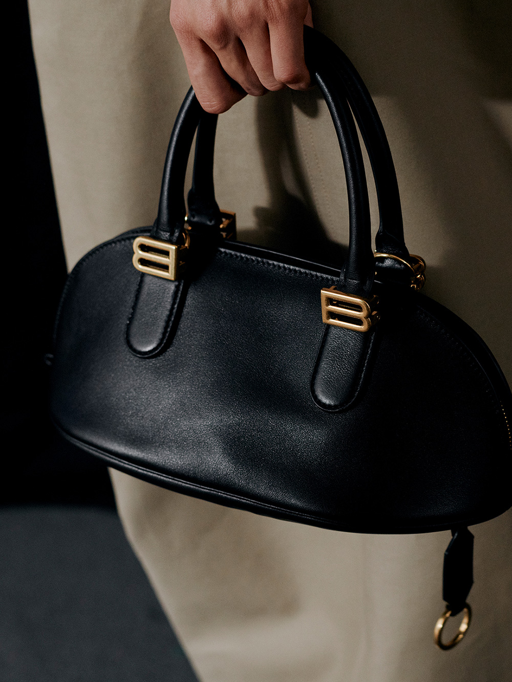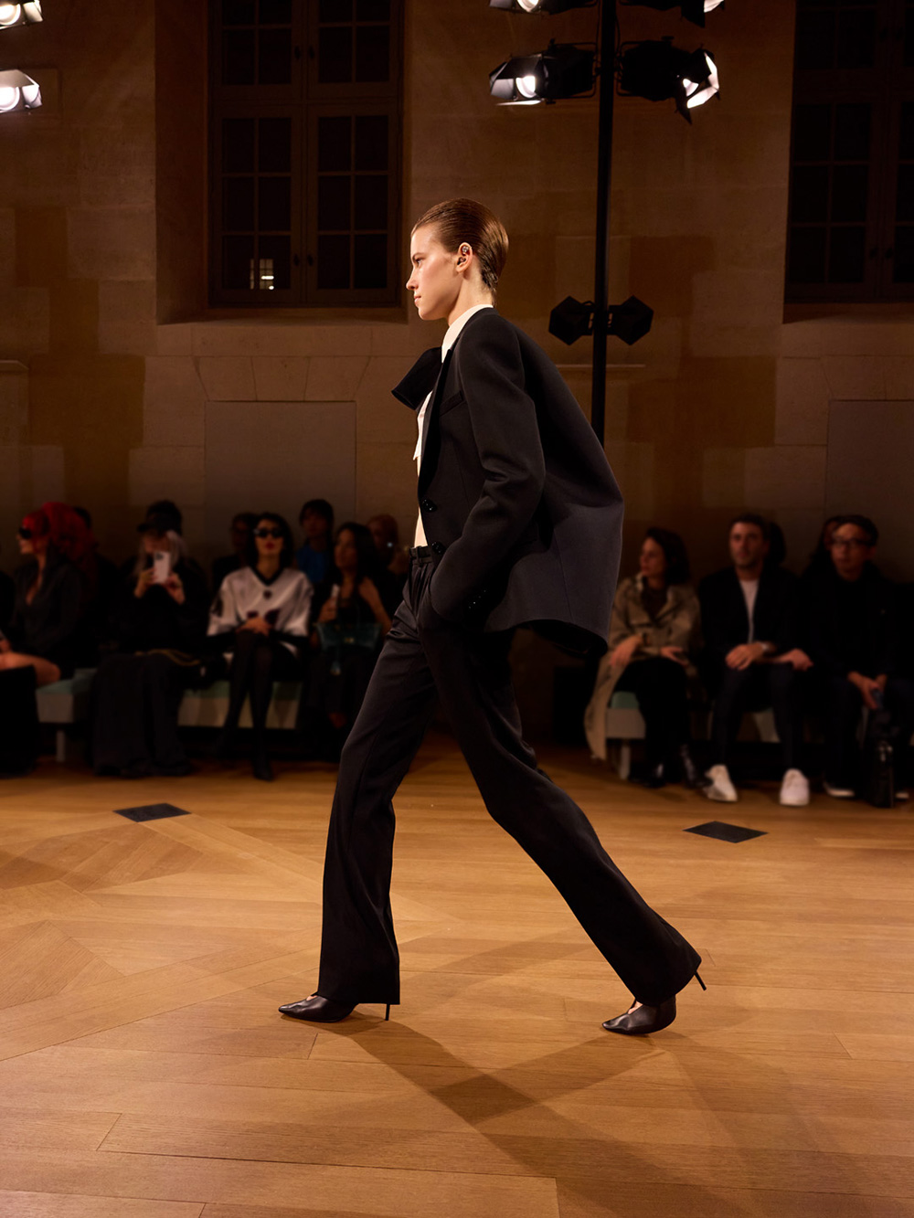 前任のデムナ(Demna)は、創業デザイナーのアバンギャルドな革新性に着目し、特異なシルエットを現代のストリートウエアで表現してきた。ピエールパオロは、その精神性は継承しつつ、スタイルでは創業デザイナーに近いシルエット重視のミニマリズムに回帰。ボリューム感は前職の「ヴァレンティノ(VALENTINO)」にも通じているが、「バレンシアガ」ではハリがありつつも空中に浮遊し続けるかのように形状を維持するガザル素材を多用し、パターンとカッティングに傾倒。縫製は最小限にとどめ、「はさみの魔術師」と呼ばれたクリストバルの再来を思わせた。一方、正直フォーマルやドレスのルックには不釣り合いなサングラス、クロップド丈のボンバーズなどでデムナへの敬意も表現する。