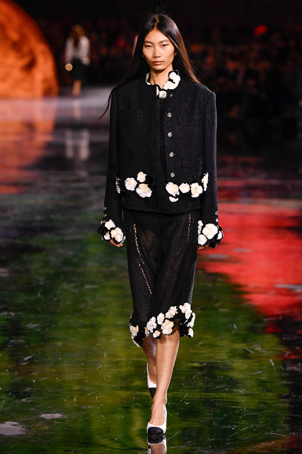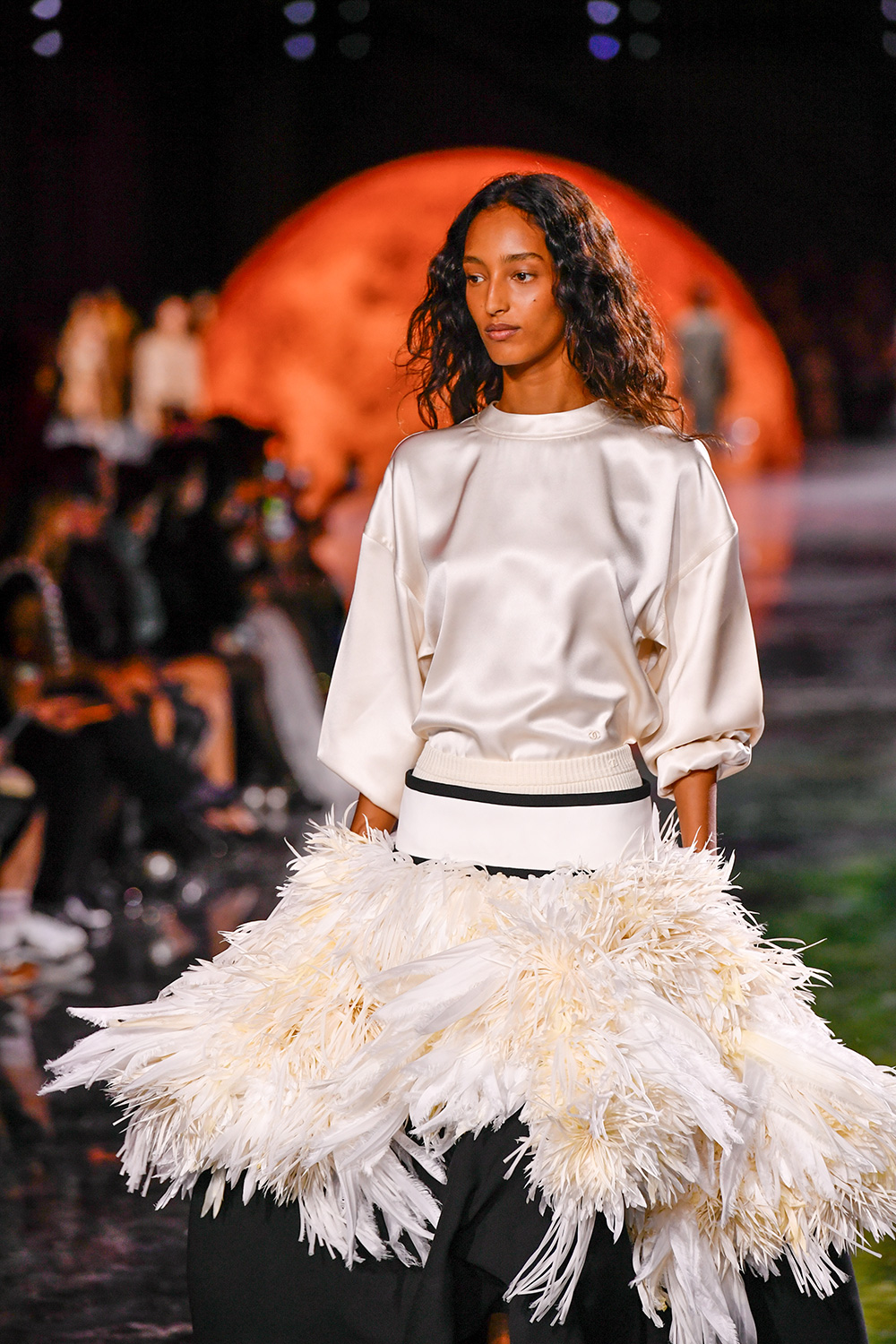 マチュー・ブレイジーによる新生「シャネル」は、とにかくフレッシュだ。メゾンのアイデンティティーやデザインコードを斬新に解釈し、「シャネル」が「シャネル」だけの世界から、以後はファッション自体とより自然かつ大胆に交わっていく期待が高まる。例えばカメリアは、細く切り裂いたファブリックや糸を束ねるなどして新たな形に。「ボッテガ・ヴェネタ(BOTTEGA VENETA)」時代には“素材の魔術師”と呼ばれたマチューらしく、ツイードはメタリックヤーンを編み込んだり、裾に同柄のビーズをグラデーションするようあしらったり、ツイードならではのチェックモチーフをオーガンジーの上にプリントしたり。さまざまな手法でツイード自体の概念を拡張することで、表現の幅を広げている。長年のファンは少し驚いているのかもしれないローウエストのシルエットも、ガブリエル・シャネル(Gabrielle Chanel)が1920年代に女性を解放したことを考えると納得だろう。彼女がもたらしたセパレートという概念をフレッシュに表現した証だ。