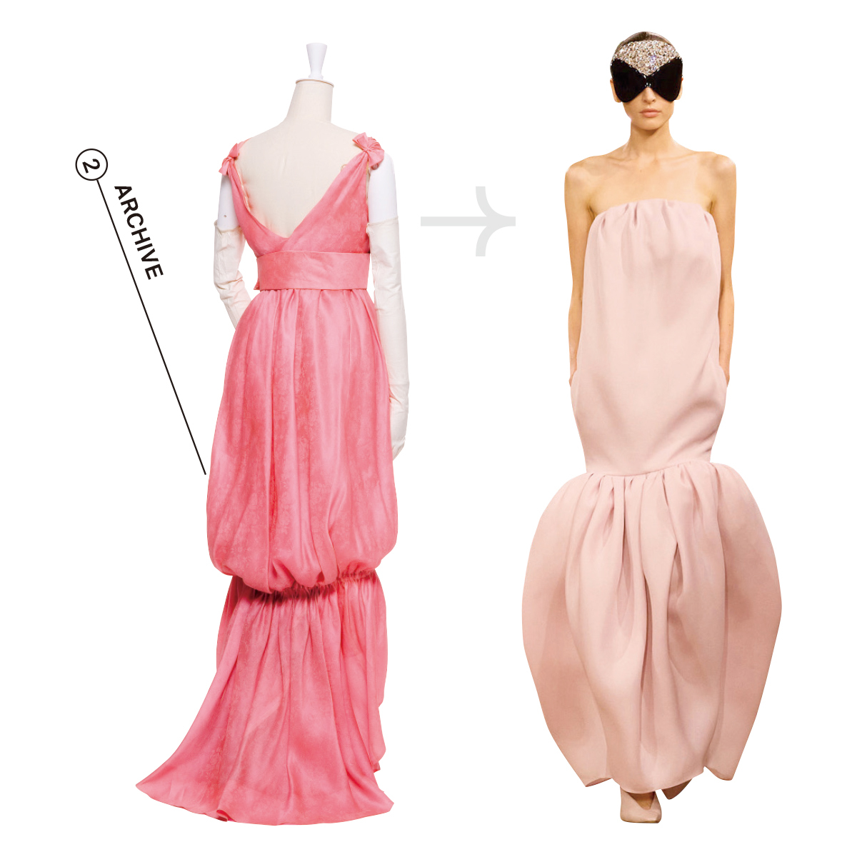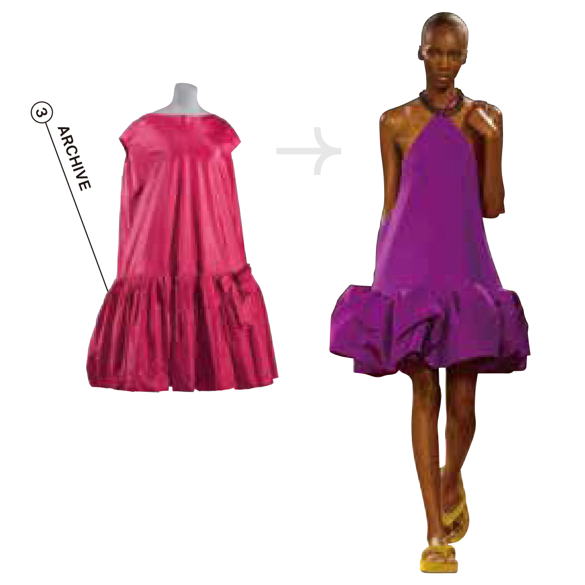 クリストバル・バレンシアガ(Cristobal Balenciaga)の洋服については、遠くからでも一目瞭然なボリューム感やプロポーションなどで誰にも知られている。彼の洋服は全て、身体という概念に基づいている。身体から始まり、時には身体から大きく離れながらも、身体は常にその中心にある。しかし間近で見ると、彼にどれほど多くの人々がインスピレーションを得てきたのかが本当によく分かる。建築的な視点は後年、今なお多くのデザイナーに影響を与えているだろう。そこでクリストバルが使用したシルクガザルをより硬くしつつも余分な重量を加えずに織り上げ、建築的なシルエットを生み出した。軽さと構造の間を追求しつつも緊張感は排して、現代の日常生活によりふさわしいコットンとウールのガザルを同じようなアプローチで作成した。構造と軽さ、シルエットと空気感というシンプルなコンセプトにたどり着くには時間を要したが、その後は直感を信じた。