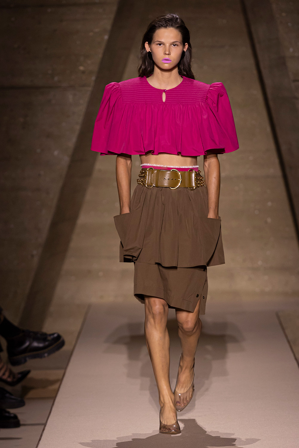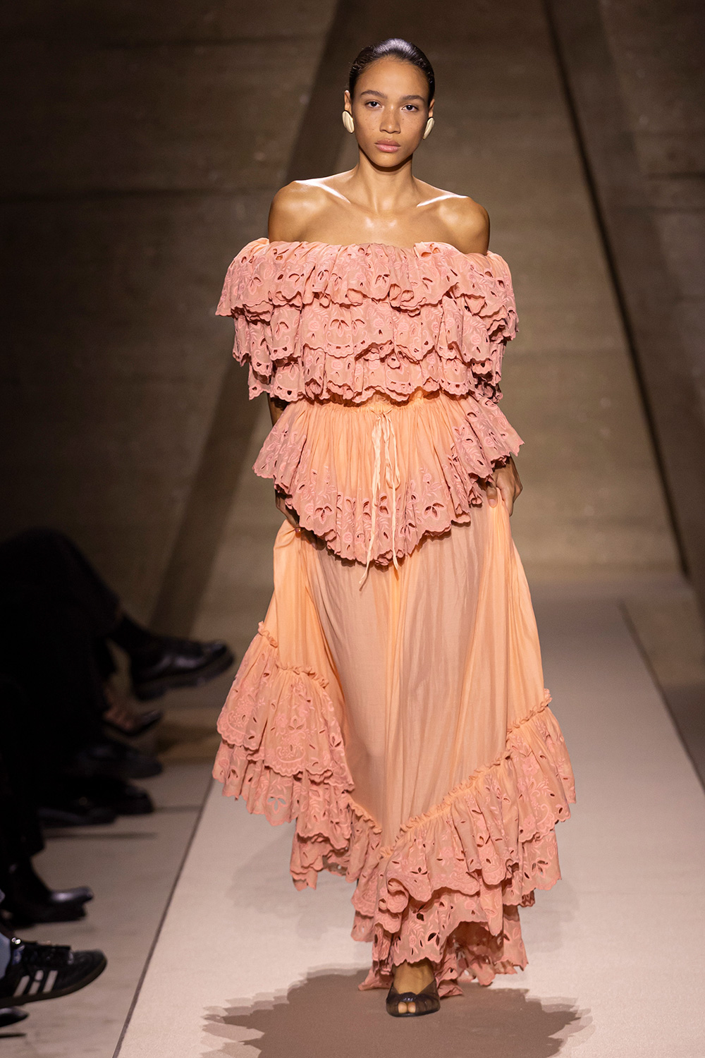 シェミナが考えたのは、もし現代の「クロエ」ガールがクチュールドレスを着こなすとしたら。ドレーピングやラッピングといった伝統的な技術を生かしつつ、素朴なコットンを使い、軽やかなドレスやトップスを提案した。それらを彩るのは、1950〜60年代のアーカイブから引用したカラフルなフラワープリント。大胆なフリルやギャザー、ボリュームのある肩、柔らかなニュアンスカラーなど、メゾンのDNAを再解釈しながら確立したデザインも応用し、フェミニンでロマンチックなスタイルの幅を押し広げている。