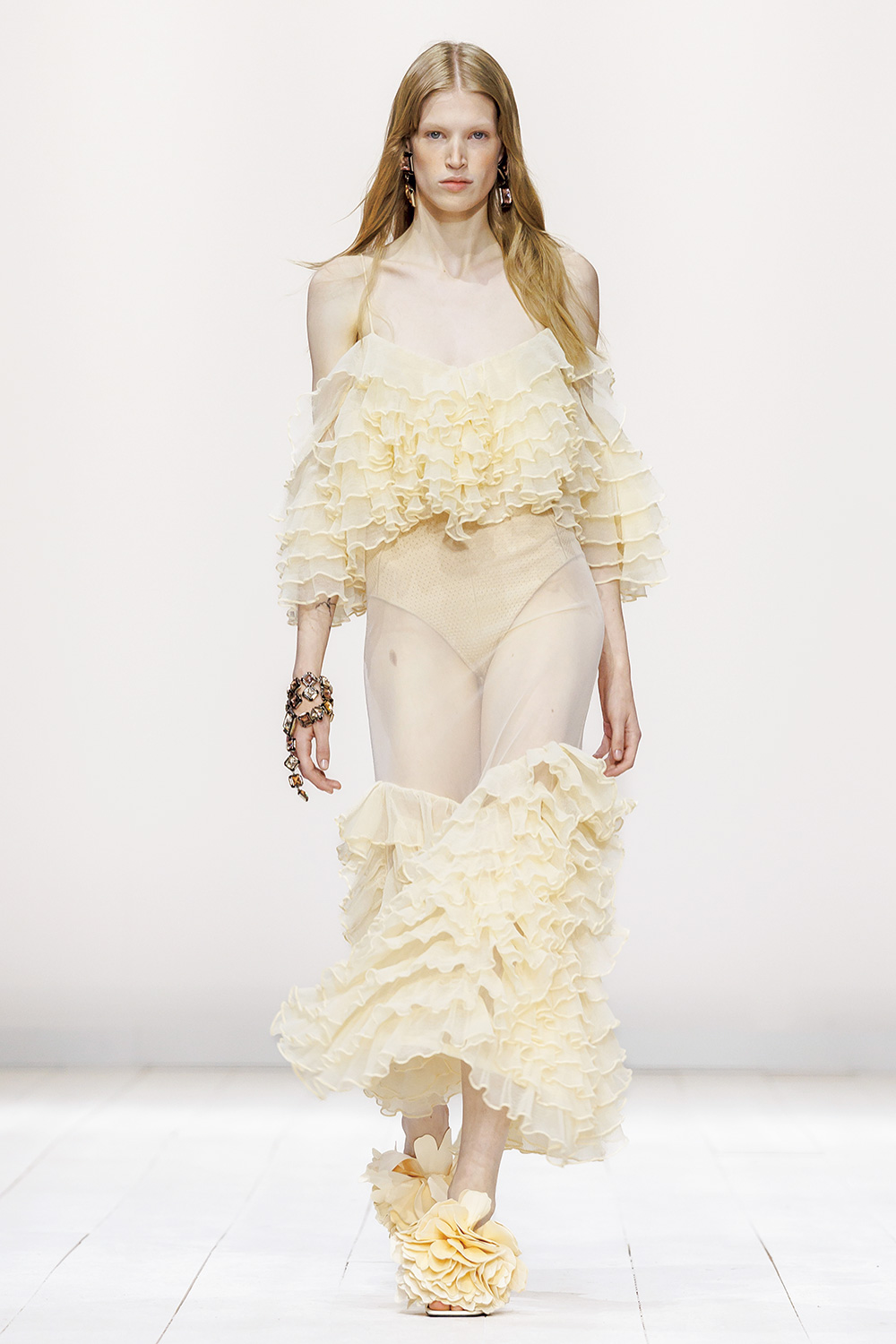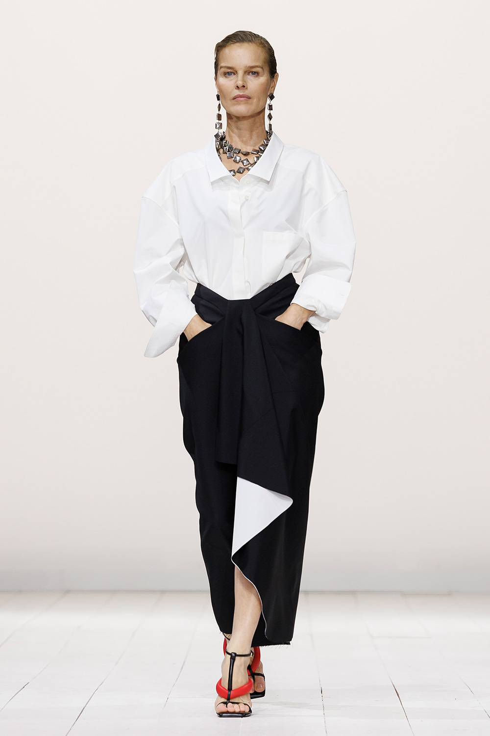 テーマは「パワフルなフェミニニティー」。半年前に提案したシルエットを土台に、テーラリングの構造を解きほぐし、素肌をのぞかせることで生まれる軽やかさと解放感を表現した。例えば、ジャケットの背面にばっさりハサミを入れてオフショルダーに作り替えたり、コットンやレザーで仕立てた白シャツの襟部分を下げることでデコルテを美しく見せたり。体に沿うラップスカートは、コートを腰に巻きつけた時のシェイプから着想したもの。正面で折り重なる生地のドレープがエレガントだ。ドレスには、レースのランジェリーやフィッシュネットタイツなど“ブドワール(婦人の私室)”に通じるセンシュアルな要素を採用。終盤にはクチュールさながらの刺しゅうを全面に施したアイテムも披露した。