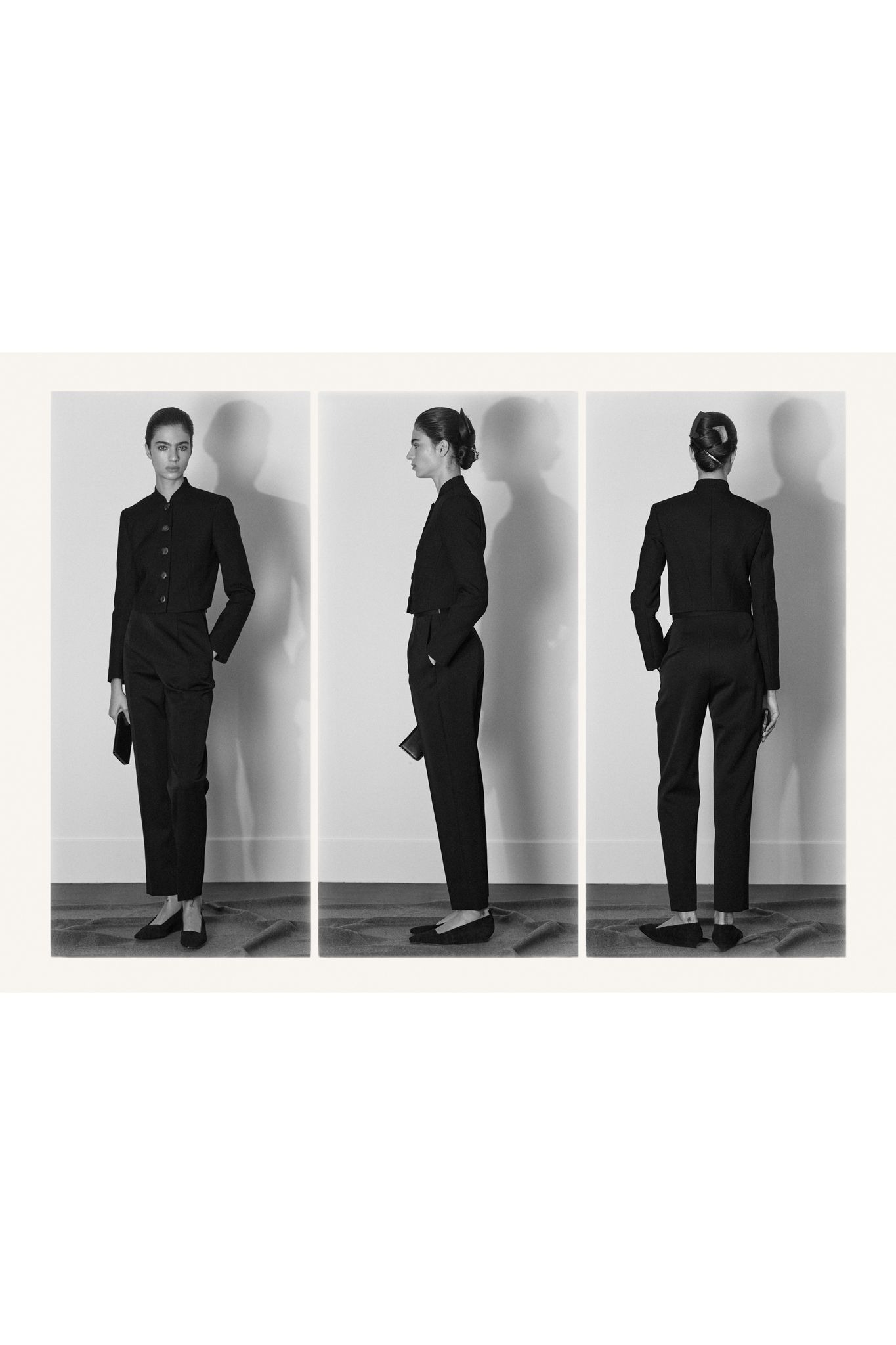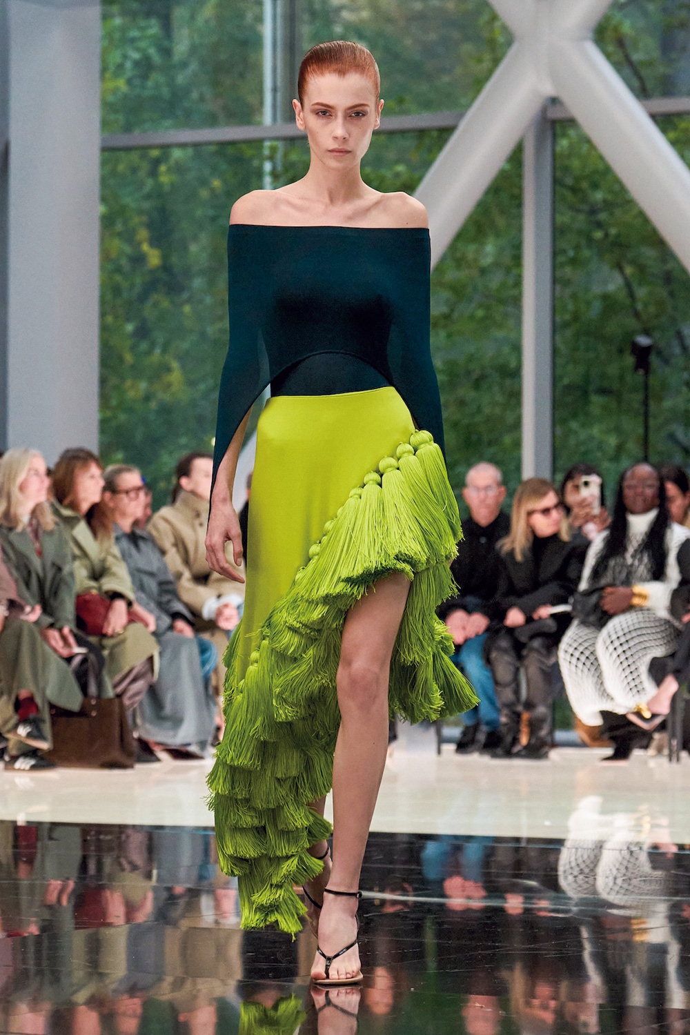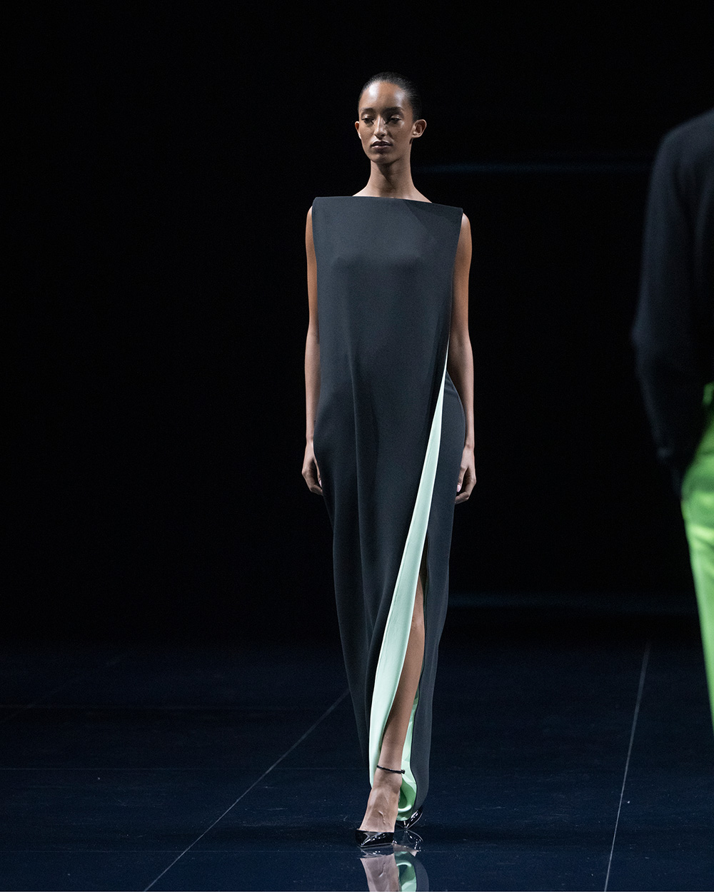 過去と現在、過剰と抑制、覆うこととあらわにすること、そして男性と女性などの二項対立の間に存在すると考える「テンション(緊張感)」を追求。構築的なジャケットなどと、ジャージー素材へのプリーツやドレープを駆使して流線形を描くスカートの対比で表現した。さらにジャージーを下に引っ張り身体をなでさせることで「トーション(ねじれ)」も表現し、人間工学的なシルエットを探求し続ける。一見するとミニマルなスタイルだが、プリーツやマクラメなどの手仕事、抑揚の効いたカラーパレットやフォルムなどで、静かながらドラマチック。ショー会場でも、天井には素肌の女性を投影し、衣服をまとったモデルとの対比で「テンション」を表現。