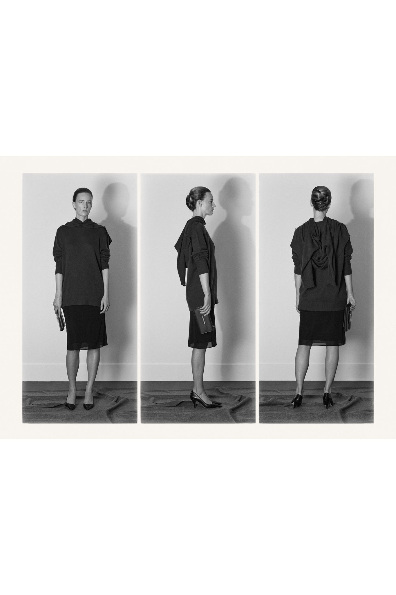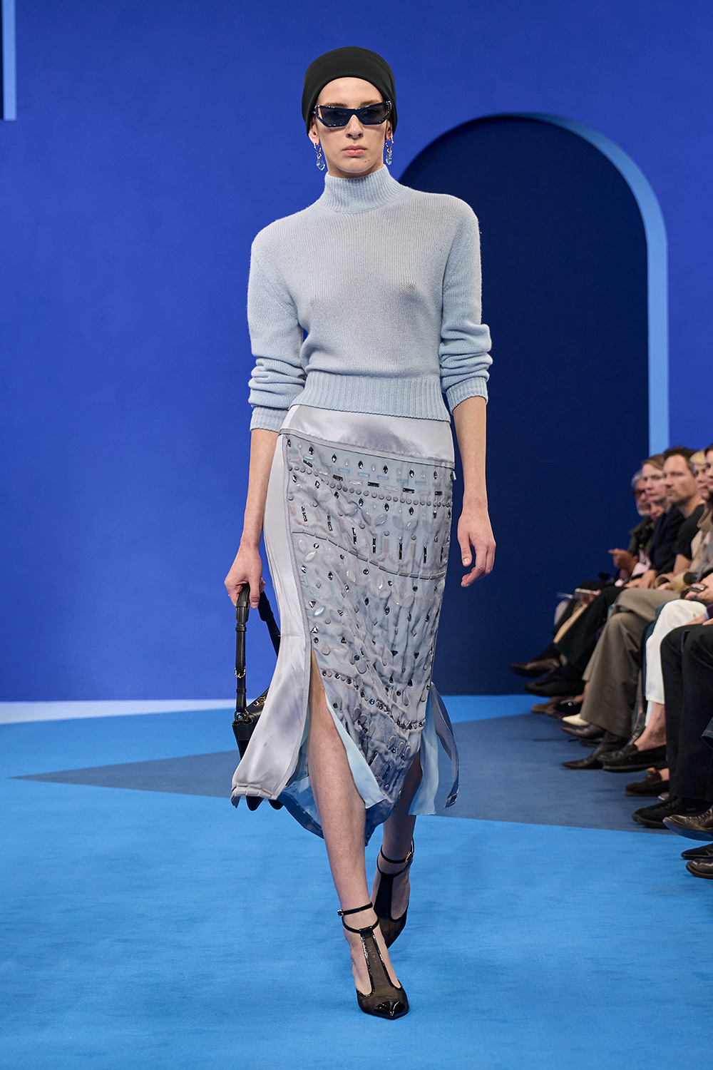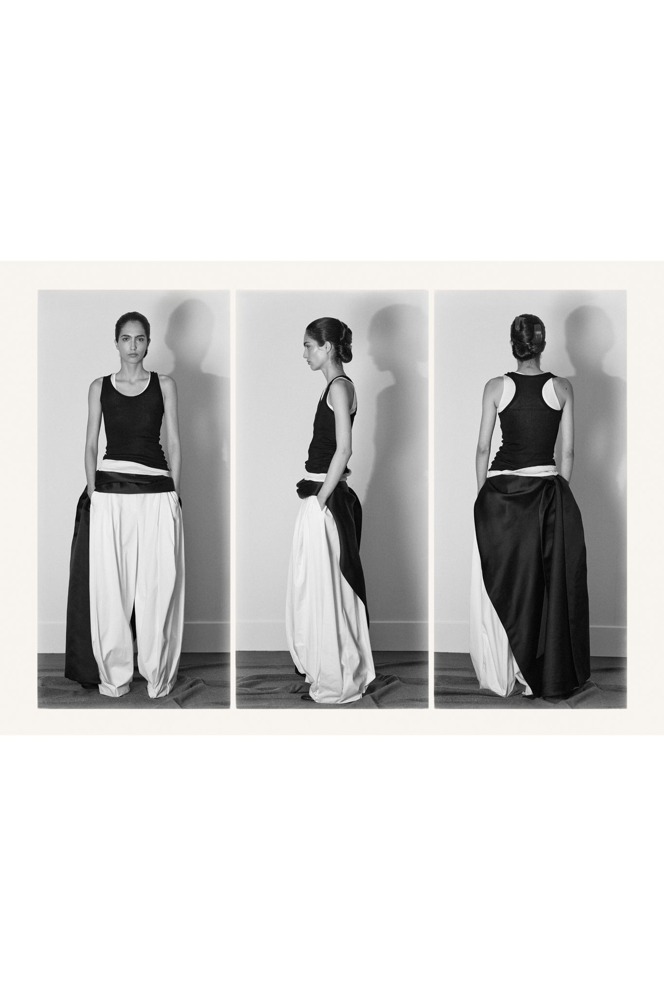 過去と現在、過剰と抑制、覆うこととあらわにすること、そして男性と女性などの二項対立の間に存在すると考える「テンション(緊張感)」を追求。構築的なジャケットなどと、ジャージー素材へのプリーツやドレープを駆使して流線形を描くスカートの対比で表現した。さらにジャージーを下に引っ張り身体をなでさせることで「トーション(ねじれ)」も表現し、人間工学的なシルエットを探求し続ける。一見するとミニマルなスタイルだが、プリーツやマクラメなどの手仕事、抑揚の効いたカラーパレットやフォルムなどで、静かながらドラマチック。ショー会場でも、天井には素肌の女性を投影し、衣服をまとったモデルとの対比で「テンション」を表現。
