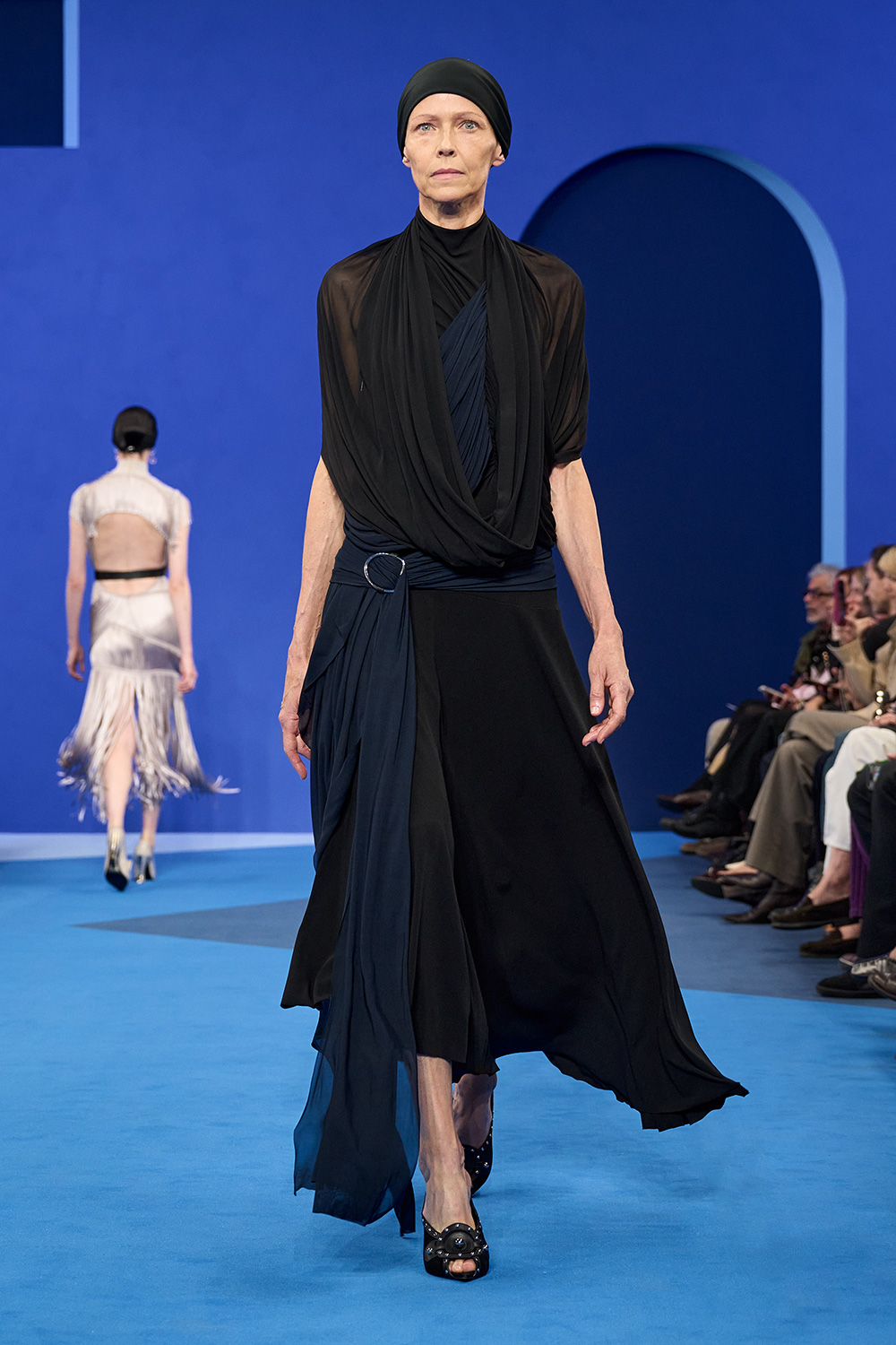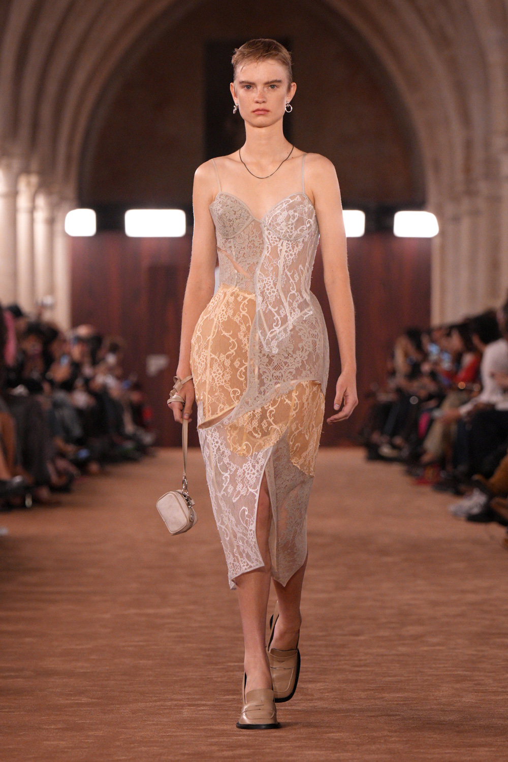 「欲望を織り込んだ」というハイダーによる2シーズン目は、大人の官能性が光る。レザーに加えた無数の細かい切れ目から控えめに素肌がのぞくコートやセットアップは、体のラインをなぞるように滑らか。レザーブラを合わせたスーツや、レザーとレースをはぎ合わせたスリップドレスも艶やかな雰囲気を醸し出す。イブニングドレスは首元などに硬いパーツを入れ、ミニマルでありながら布を巧みに体に沿わせるデザインが美しい。