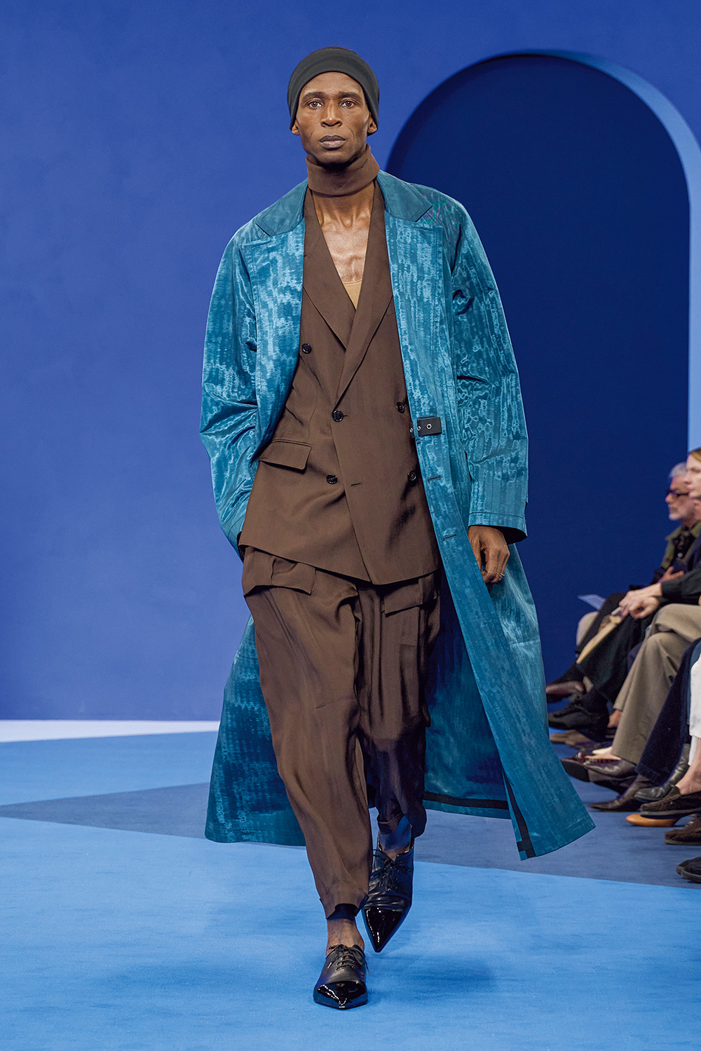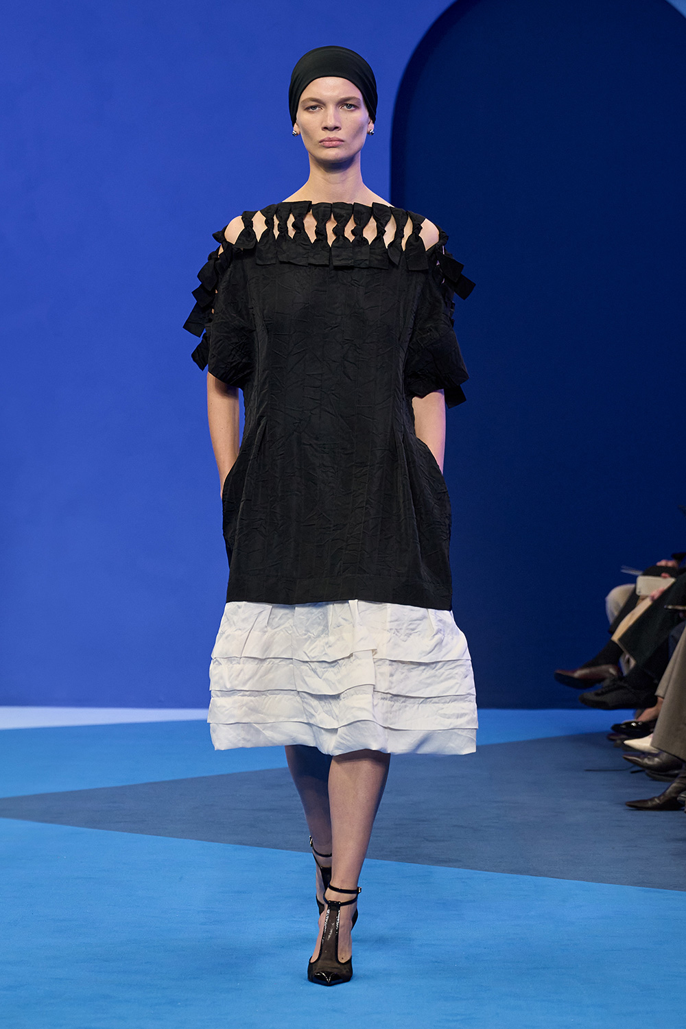 1月のデビューショーに続き、核は創業者ジャンヌ・ランバン(Jeanne Lanvin)と彼女が活躍した1920年代。ドロップウエストやアール・デコに通じる幾何学模様を取り入れた、ひざ下やミッドカーフ丈の上品なドレスを豊富にそろえた。今季は、ドレスのボディーから装飾やディテールにまでグログランリボンを多用。バイアスカットやドレープ、洗いなど布の扱い方には、ピーターの経験値の高さが見て取れる。同時に発表したメンズは、ウィメンズと世界観を共有するものの印象がやや弱く、今後の発展に期待。