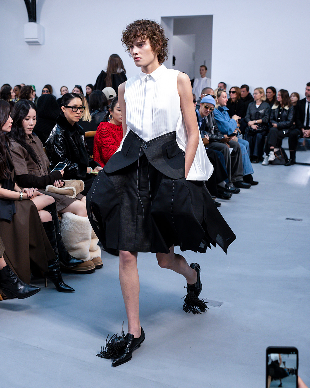 ショー後に公開されたルック写真はモノクロだったが、実際のコレクションも白と黒を中心にしたラインアップ。今季もレイヤードを軸にした、遊び心ある着こなしが満載だ。例えば、チェックとストライプのシャツを重ねたり、タンクトップを3枚組み合わせたり、カーディガンのボタンを一つだけ留めて背中に垂らしたり。コンパクトなビクトリアンジャケットや細身のクロップドパンツなど、よりフィット感のあるスタイルが増えているのも新鮮だ。