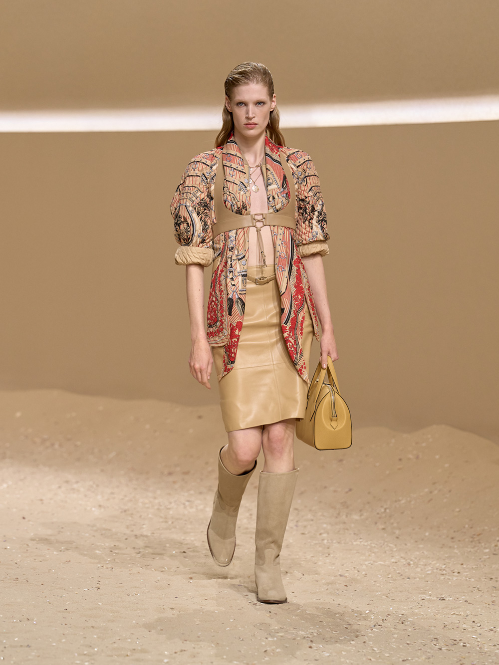 イメージは、南仏カマルグの湿地を馬に乗り、さっそうと駆け抜けるような自由で活発な女性。胸下で固定するホルターネックのレザーハーネスがキーアイテムで、その下にジャケットやニットのブラトップを合わせたり、首にかけて垂らしたスカーフを通したりしたスタイルが主軸になる。現地の漁師の作業着や漁網は、サロペットのようなパンツやシアートップスとしてエレガントに昇華。南仏で受け継がれるキルティングの技法も応用した。