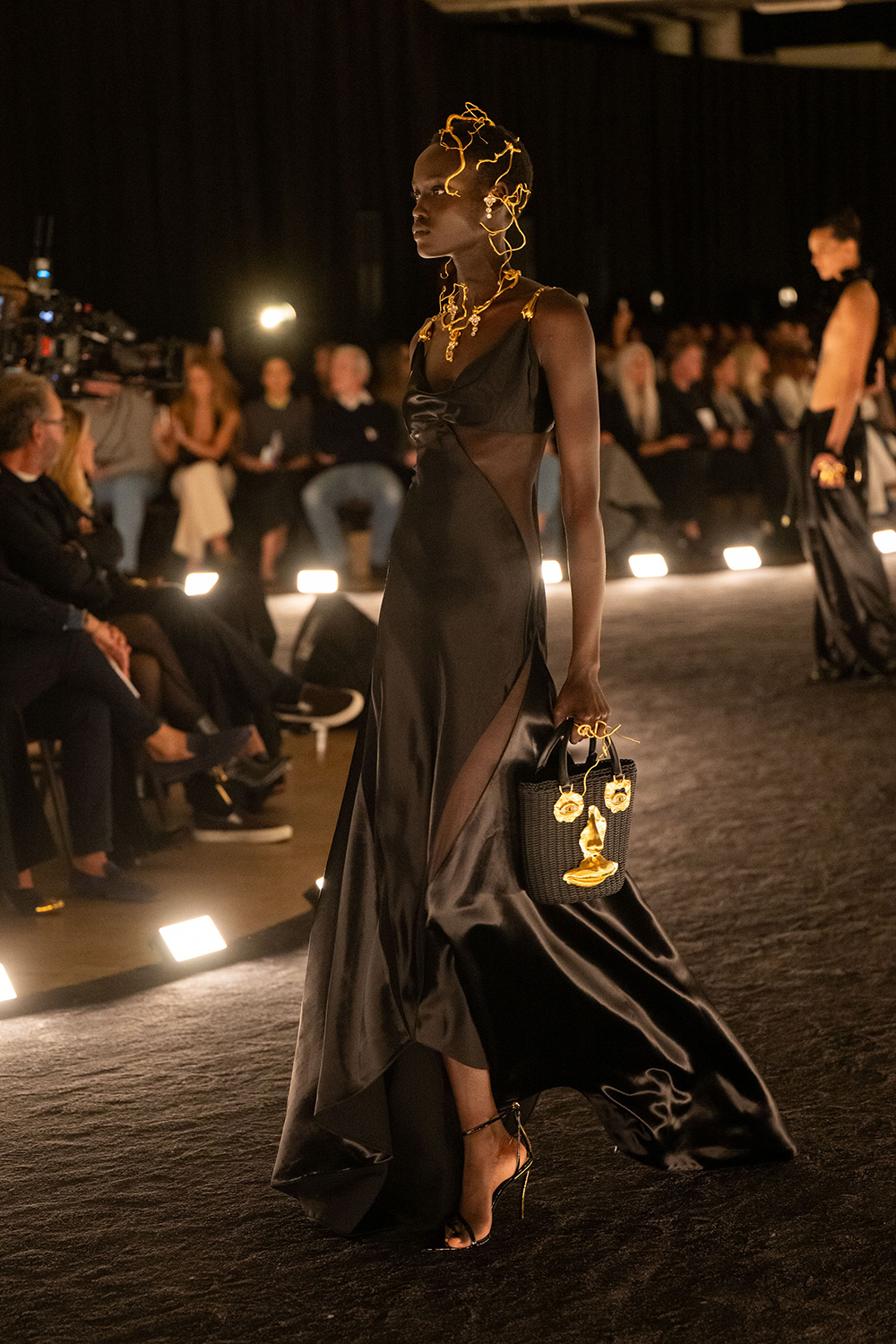 ファーストシーズンに確立したメゾンコードを保つことは大切だと感じていたが、実際着目したのは、女性の力。女性に力をもたらすためには男性的な要素に頼りがちだけれど、私はむしろ女性性のアーキタイプ(原型)やシンボルを通して女性のエンパワーメントを探求したかった。そのため、テーラリングとドレスでフェミニンな曲線を強調するとともに、時に大胆に時に控えめに肌をあらわにし、親密さの中にある官能性を取り入れた。