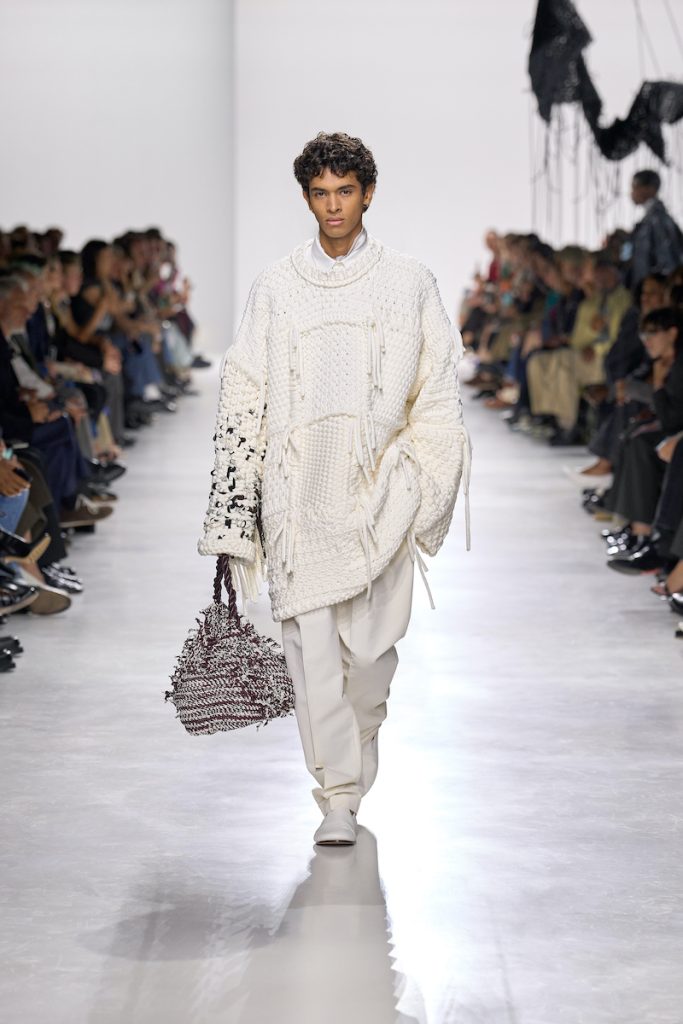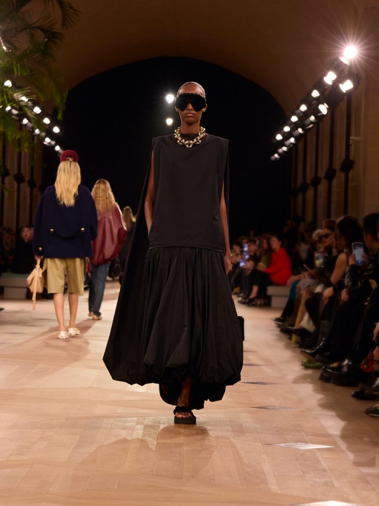 ショーの入り口には、エルズワース・ケリー(Ellsworth Kelly)による幾何学的なバイカラーのアートワークが展示され、「ロエベ」の前デザイナー、ジョナサン・アンダーソンのショーとの統一感が感じられた。ジャックとラザロは色彩の達人であり、ブランドのコードと巧みに融合させながら、その青写真を積み重ね、繊細なフリル、ロングドレス、スマートなレイヤードを体現している。ジョナサンの功績をたたえるなど過去への真の敬意を感じつつも、ブランドの未来を予感させる。アウターからバッグまで、レザーアイテムは「ロエベ」の強みであるシャープなデザイン。ジャケットは、程よいモダンさでフェミニンなシルエット。この期待の星となるデビューに、スタンディングオベーションを送る。