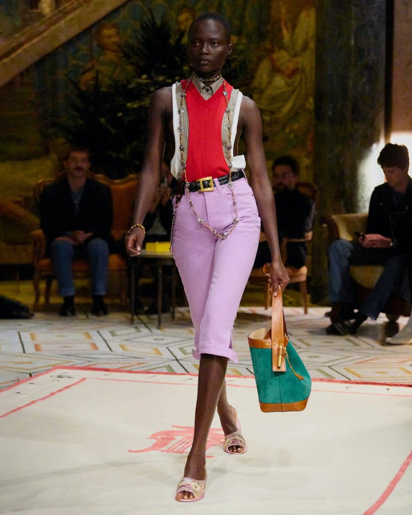 コレクションは、ジャンニ・ヴェルサーチェ(Gianni Versace)のヴィンテージアイコンに深く根ざしながらも新鮮だった。ここ数シーズン、「ヴェルサーチェ」は特に際立った視点を持っていなかったが、ダリオはレトロな要素と若々しい活力とを巧みに融合させ、前任のドナテラ(Donatella)の視点を一新した。非常にカジュアルかつマイアミシックなスタイルだったが、イブニングルックが登場しなかったのは残念だ。ダリオは、“ジーンズ・クチュール(アンダーグラウンドなカルチャーと若者のファッションを表現したかつてのライン)”から飛び出してきたような原色のハイウエストジーンズ、ゴールドのバックル付きベルト、控えめなスカーフプリント、そして誇張したショルダーラインで、ジャンニの全盛期へのオマージュを明確に表現。「ヴェルサーチェ」のコードは非常に力強く、ダリオは馴染みのあるデザインを遊び心たっぷりにアレンジした。彼の「ヴェルサーチェ」は風変わりでセクシー。この「オタク」的な要素は独特だ。