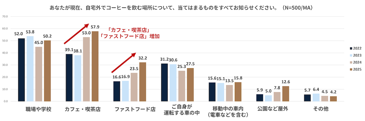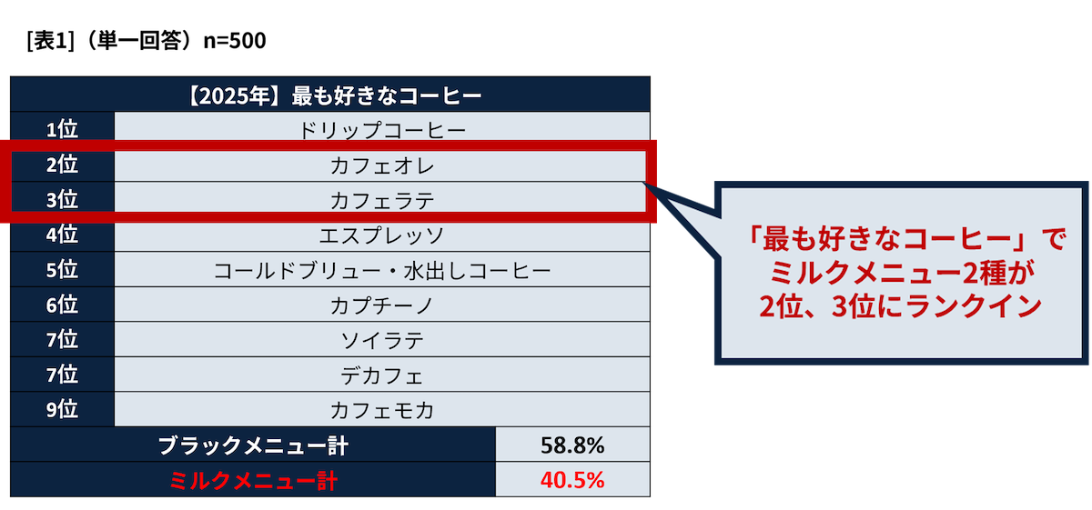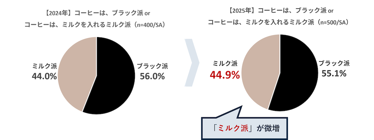 昨今、ウェルビーイング嗜好の高まりや円安・物価高の影響など、消費者や社会を取り巻く環境に変化が生じている。調査開始6年目を迎える今年度は、多様化するコーヒー飲用事情を過去の調査結果と比較して紐解いた。まず、コーヒーを飲む頻度について、「1日1杯以上飲む」のは83.9%と引き続き高い結果に。コーヒーを飲む場所については、「カフェ・喫茶店」「ファーストフード店」の回答率が増加した一方、「自宅」の回答が57.6%と最も高い結果となった。最も好きなコーヒーメニューでは、例年に引き続き“ドリップコーヒー”が最多で、“カフェオレ”が次いで上位を獲得。“カフェラテ”や“カプチーノ”など、エスプレッソをベースとしたミルクアレンジのメニューも人気を獲得した。自宅で週に1回以上コーヒーを飲む人に「ブラック派」「ミルク派」のどちらかについて聞くと、「ブラック派」が55.1%、「ミルク派」が44.9%と、おおよそ半数ずつ分かれる結果に。「ミルク派」の割合は昨年度から0.9ポイント増加し、ミルクメニュー人気が高まっている傾向が見受けられた。
