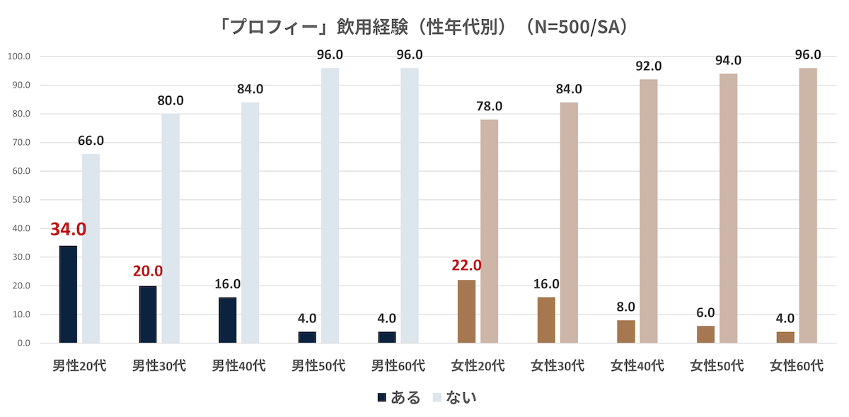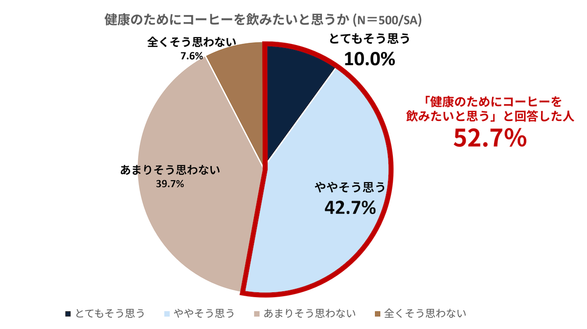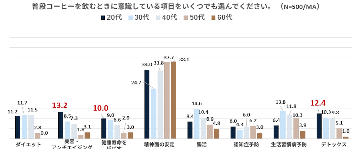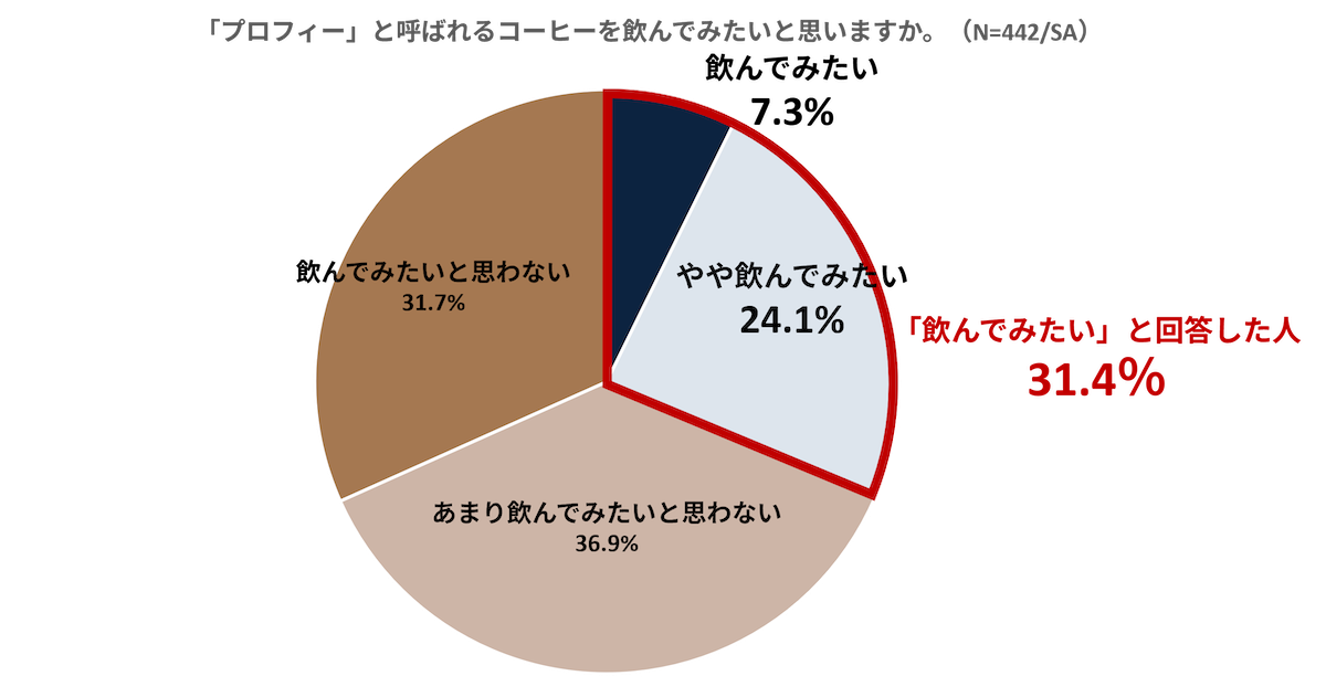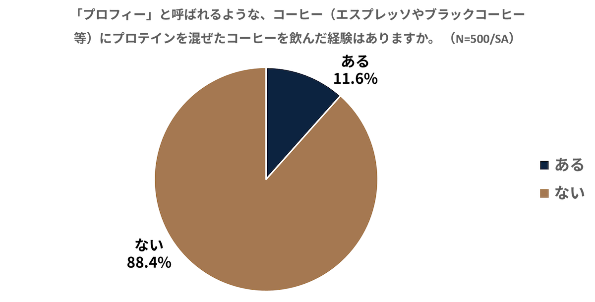 引き続き“コーヒー×健康”は関心を高めており、「健康のためにコーヒーを飲みたい」と52.7%の人が回答。“コーヒーと心身の健康”に関連すると思う要素として「精神面の安定」(49.3%)が最も票を集めた。「美容・アンチエイジング」「デトックス」「健康寿命を伸ばす」の3項目では20代の意識率が最も高く、若い世代ほどコーヒーと健康を結び付けている傾向があった。また、SNSでも話題に上がっている、プロテインとコーヒーを混ぜた“プロフィー”を飲んだことが「ある」と11.6%が回答。性年代別に見ると、20代が29.2%、30代が18.3%という結果で、特に20代男性に多い(34.0%)ことが分かった。飲んだことがある人は少数派だったものの、31.4%が“プロフィー”を「飲んでみたい」と回答し、今後のトレンドとして期待が持てる結果となった。