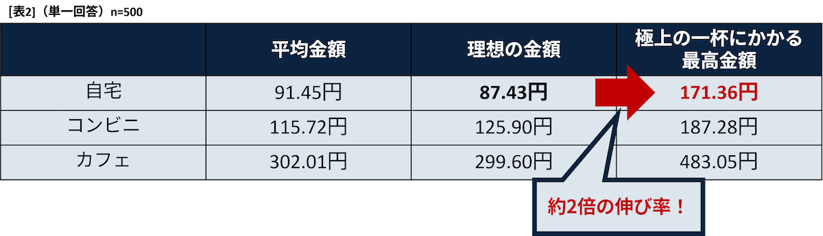 自宅で飲むコーヒーを用意する方法については、「インスタントコーヒーを使う」が51.7%で過半数を占めた。その一方で、若年層ほど豆からひく、焙煎から行う等の、“挽きたて・淹れたて”に対するこだわりを持つ傾向があった。また、「豆から挽く」と回答した人は合計22.0%で、2022年の調査結果(17.4%)と比較して増加傾向に。物価高を背景として、自宅で飲むコーヒーへのこだわりが高まっていると推測できる。コーヒー1杯にかける金額については、自宅で1杯にかける平均値は91.45円と過去最安で、2024年度の結果からは約67円もの減少となった。自宅での“理想の金額”はさらに安くしたい一方で、“極上の一杯にかけたい金額”の伸び率はコンビニ、カフェと比較して最も高くなっており、自宅で飲むコーヒーへのこだわりの高さが感じられる。