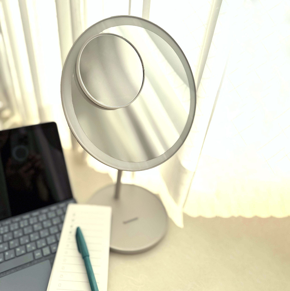 自宅のワークスペースで使用中。仕事中につい表情が険しくなってしまうことに気づかされますが(笑)、オンラインでの打ち合わせ時に照明としても役立ちます。基部のフチがトレイのようになっているほか、スマホスタンドのように使える支えがあったり。電源スイッチが指紋のつきやすいミラー面ではなく、裏側にあるところにも無印らしいちょっとした配慮を感じます。