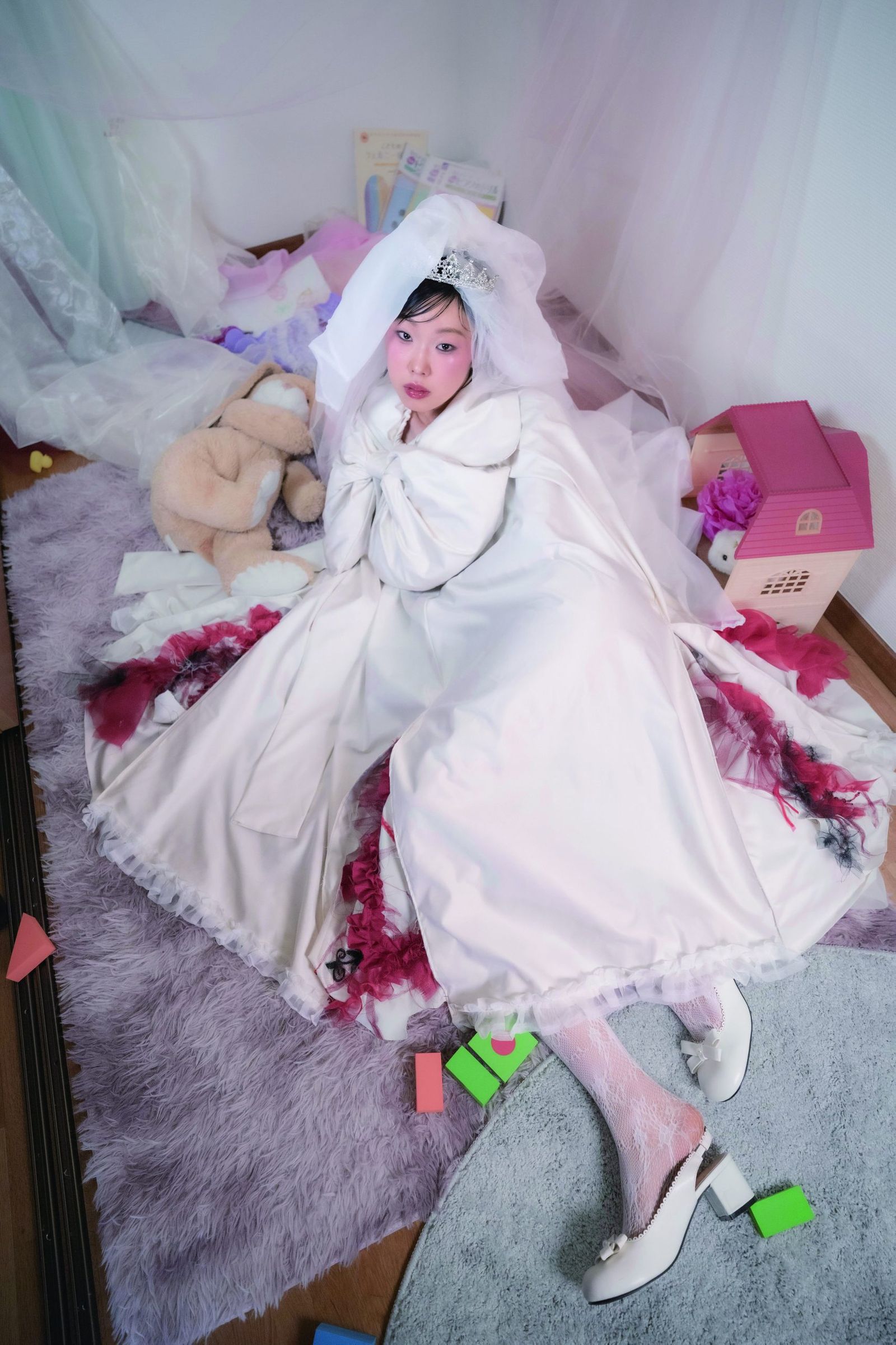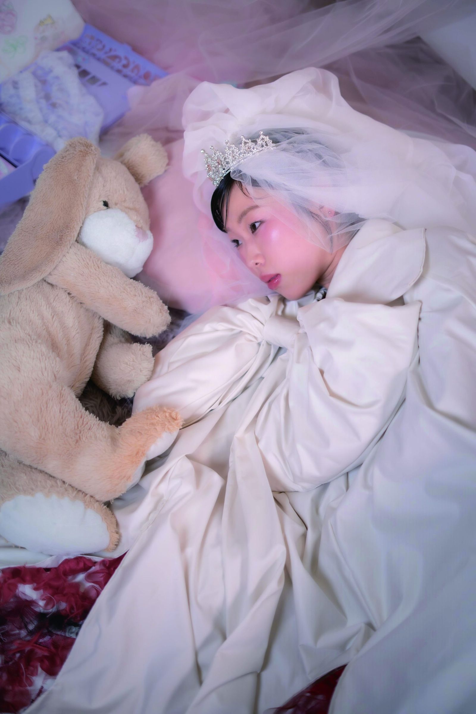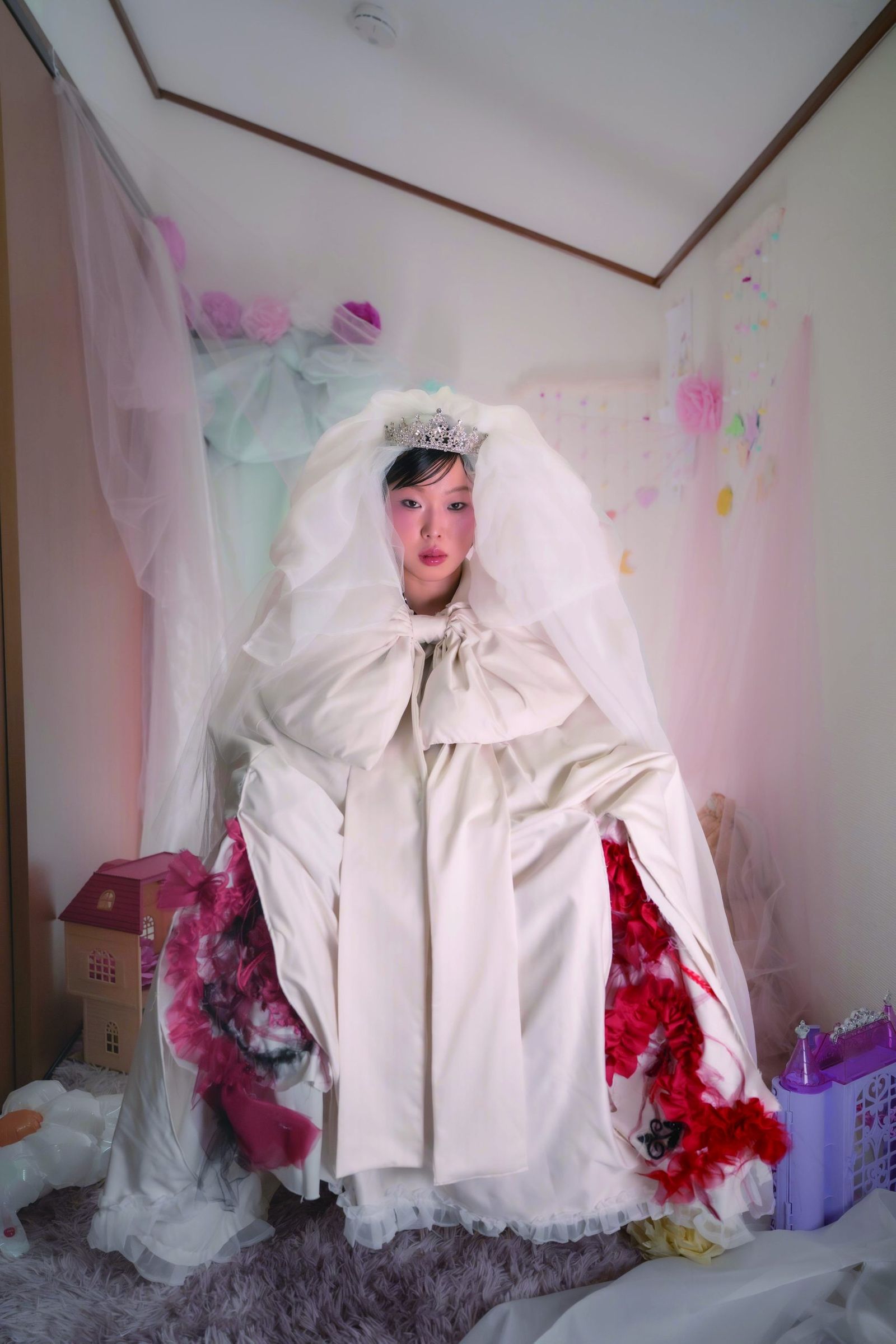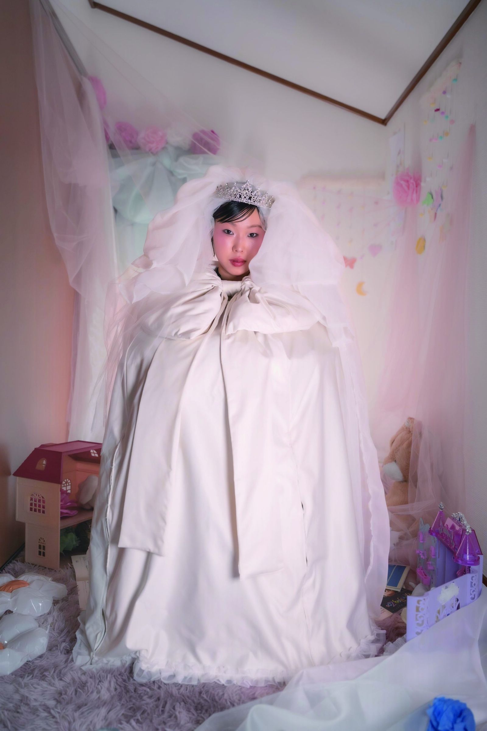 荒木:子どもの頃に描き夢見たプリンセスのような花嫁像も大切にしたいと思いました。理想的で無垢な花嫁姿を、子供部屋の片隅に眠るように残すことで、不安や暗さを抱えながらもどこかで憧れを手放せない、そんな様子を表現しました。理想と現実、その間にある揺らぎこそが、今回表現した「新しい花嫁像」です。