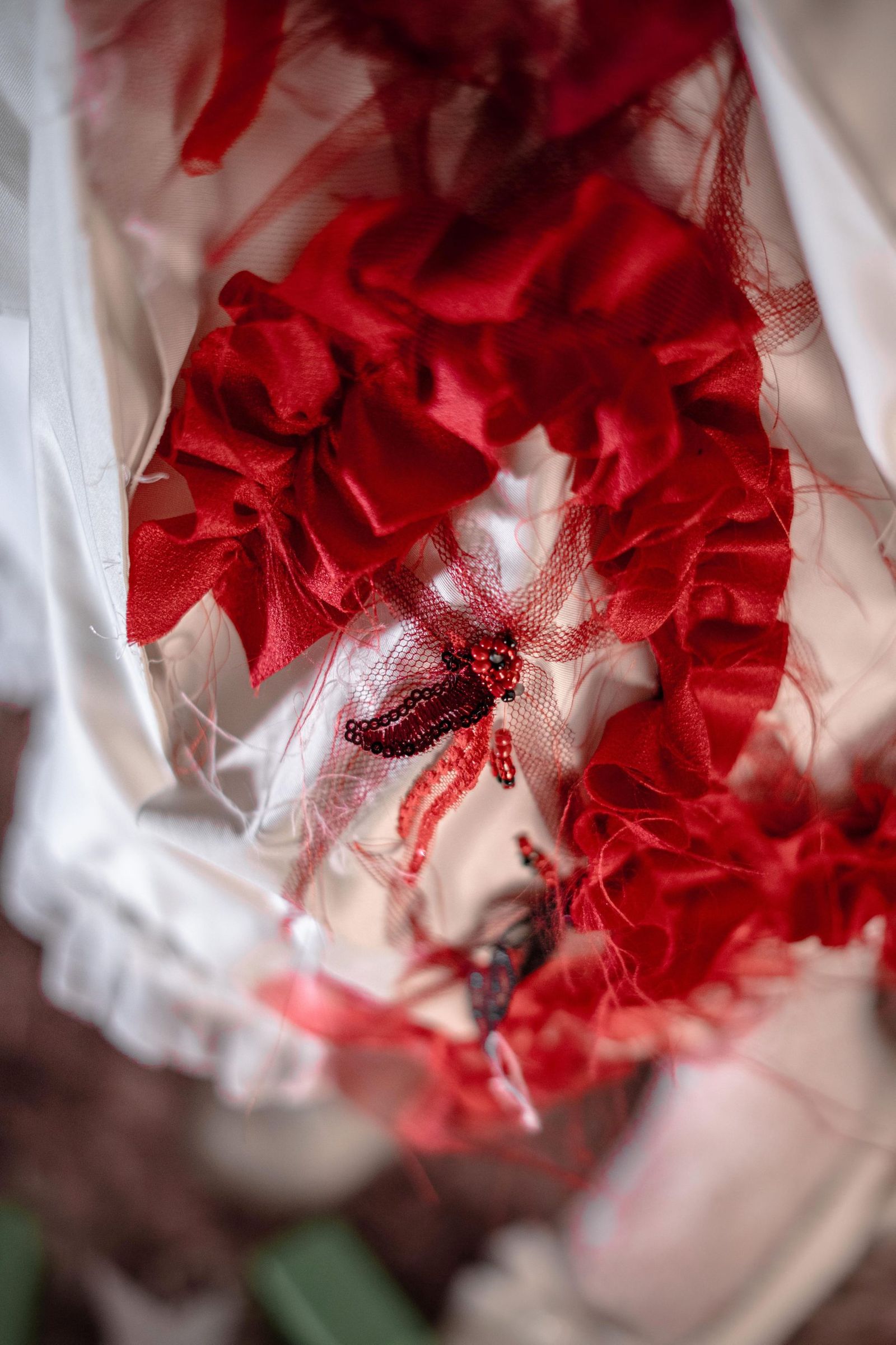青木瑠璃(以下青木):私は花嫁を、「期待と不安が交錯する葛藤の象徴」として解釈しました。コンセプトから頭に浮かんだのは、「花嫁って本当に幸せなのだろうか?」という素朴な疑問でした。私自身にも結婚願望がありますが、結婚したい理由を問われると明確な理由を言葉にすることが難しく感じられました。