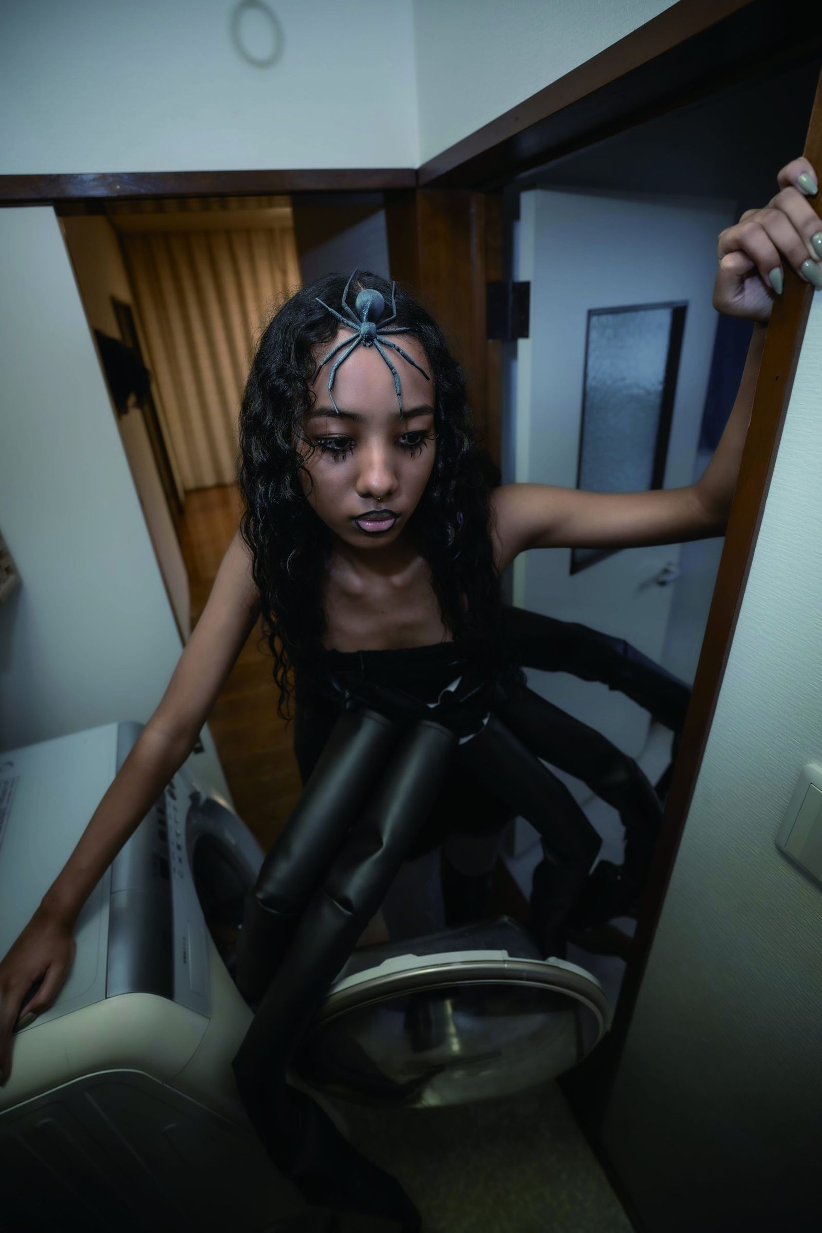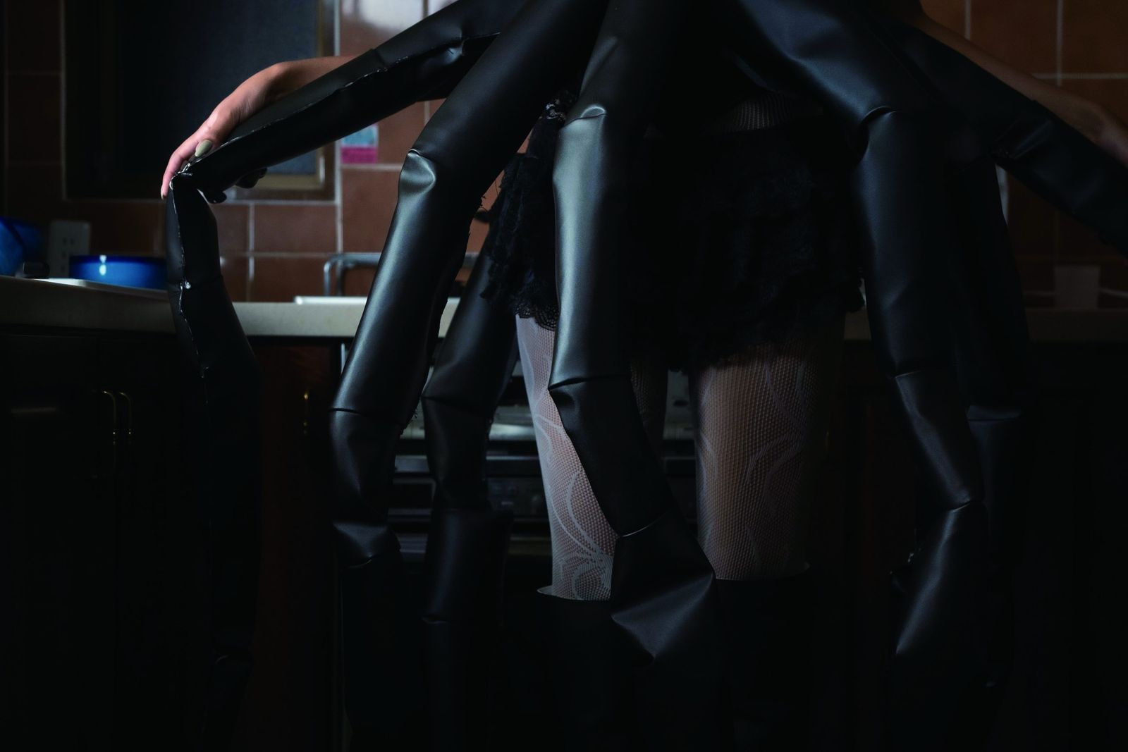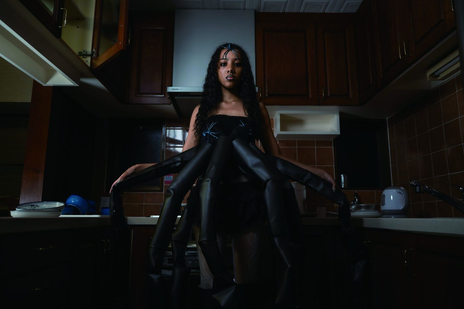 八ツ田:私は主に、ブーツカバーの制作を担当していたのですが、フェイクレザーをミシンで縫い合わせたり、黒のレースを手縫いで付けたりする作業に少し苦労しました。撮影の際は、なるべく蜘蛛の足を広げてセッティングすることでシルエットがより蜘蛛に近づくように心掛けました。
